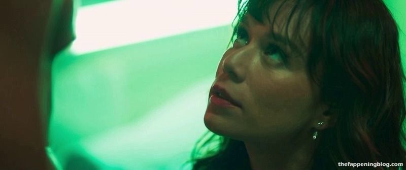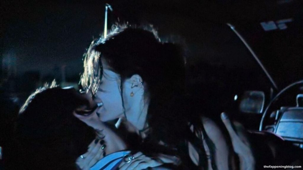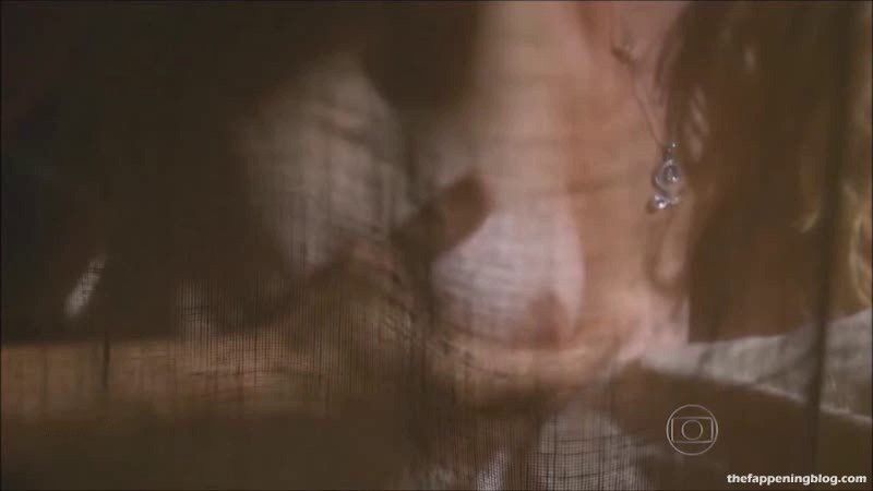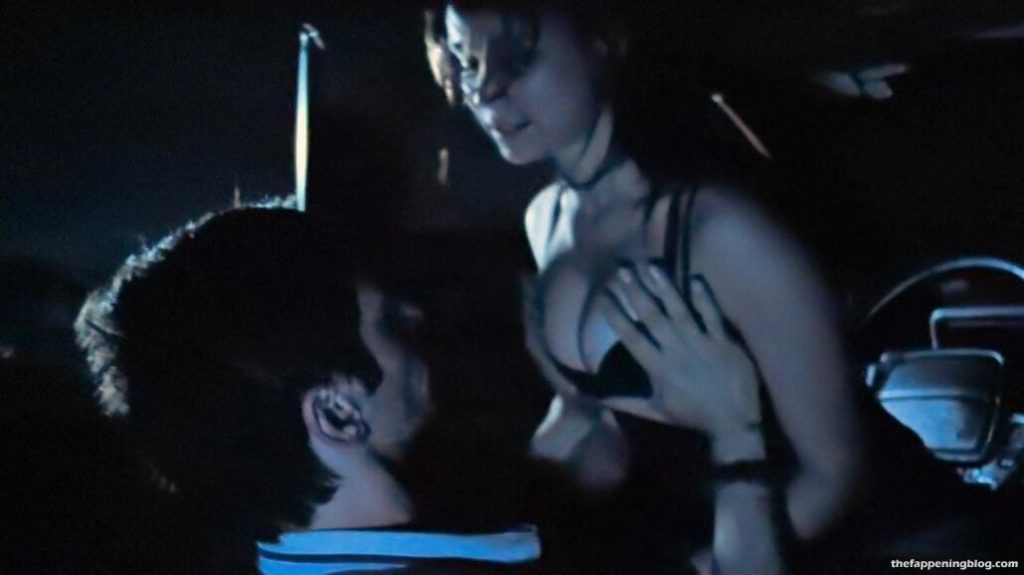 Mariana Ximenes is leaning over in the front seat of a car and passionately kissing a guy before she turns the light off and then climbs into his lap and continues to passionately make out with him all while showing her cleavage in a black bra as he grabs and squeezes her breasts quite a bit and as she licks his ear and bites his earlobe.