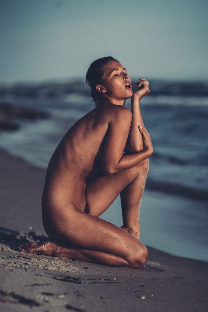 Modelo nua, fotógrafa e blogueira de viagens Marisa Papen mostrou seu corpo bronzeado na praia em um ensaio fotográfico de Thomas Agatz na Dinamarca (julho de 2018).