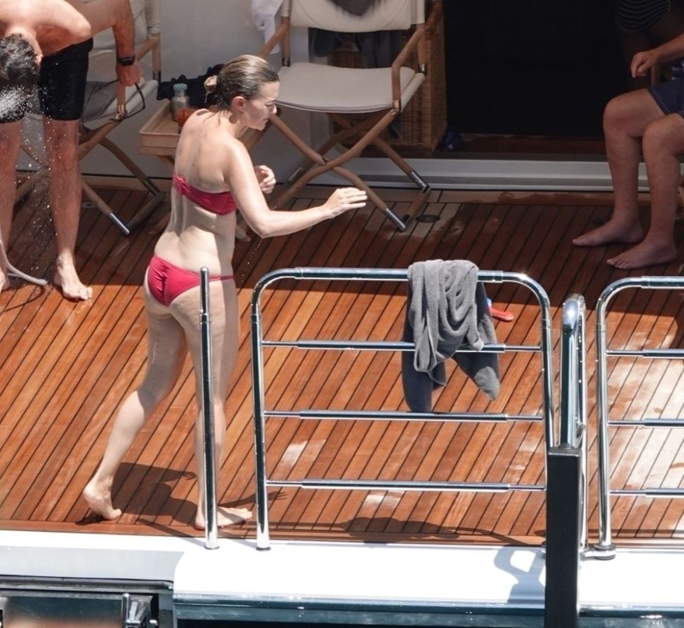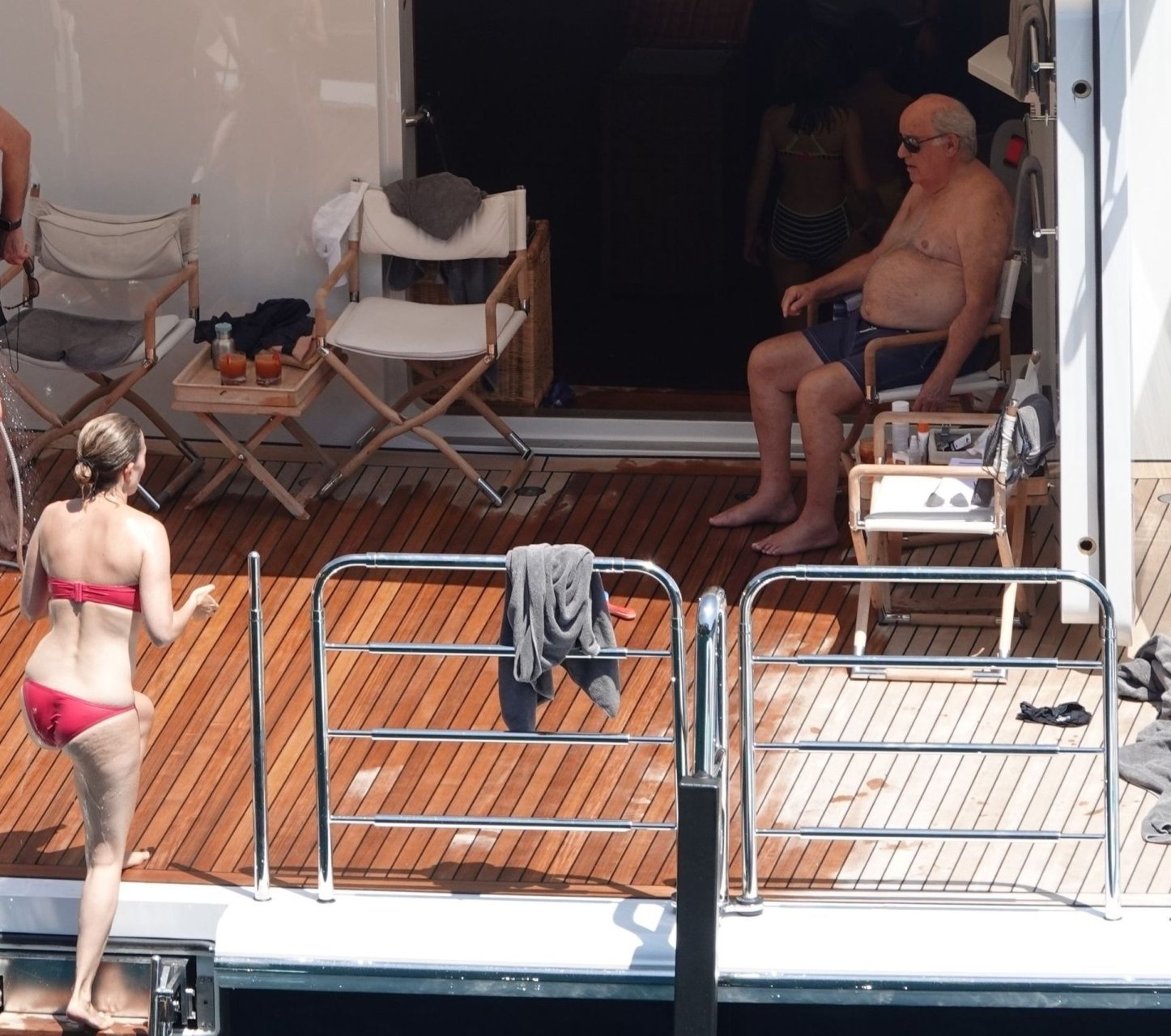 Amancio Ortega, o bilionário por trás da Zara Fashion, e sua filha Marta Ortega foram vistos relaxando perto da piscina em Portofino, 07/02/2019. Amancio pode ser visto se abrigando na sombra enquanto sua filha Marta aproveita o sol usando um biquíni vermelho.