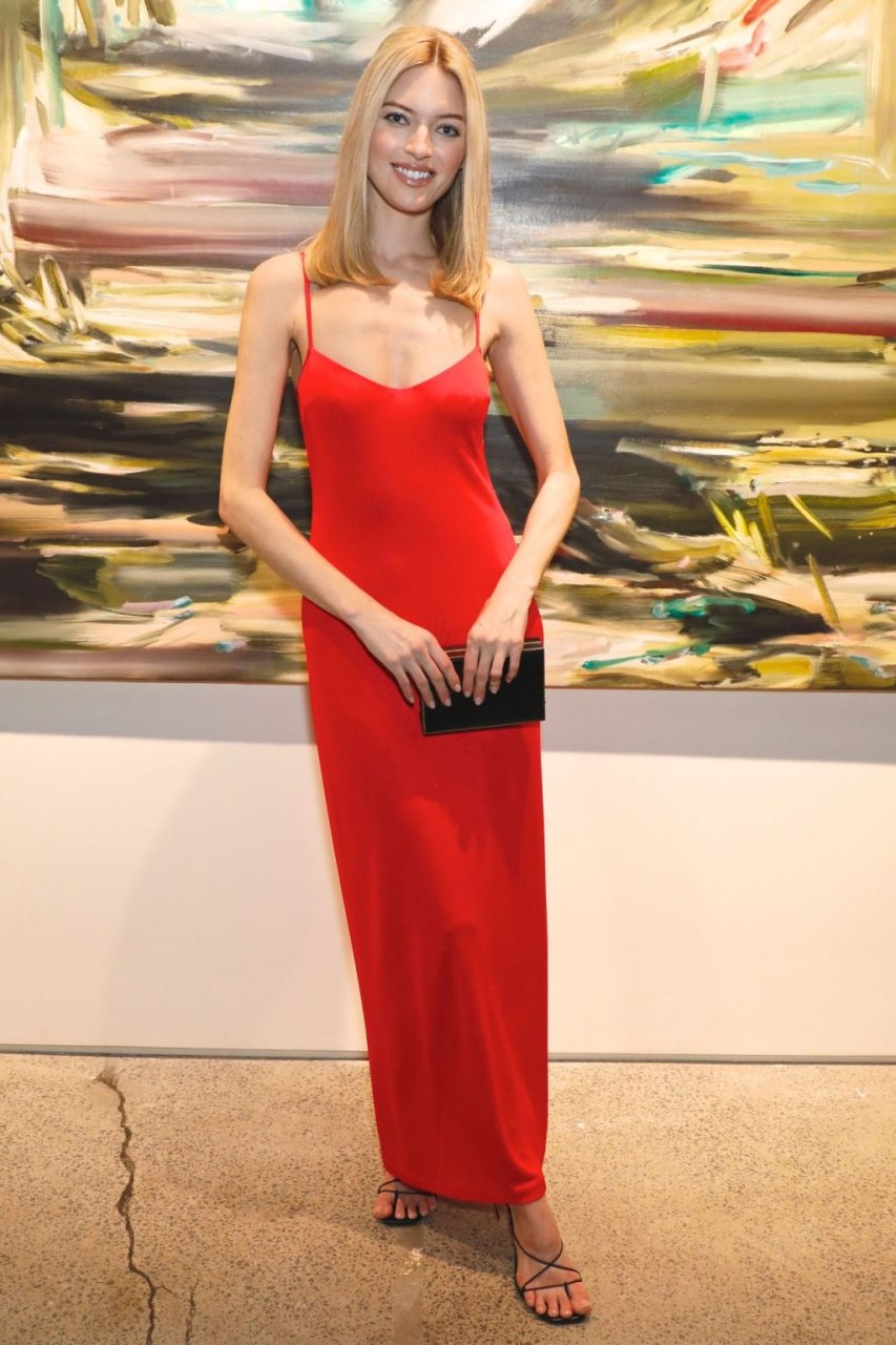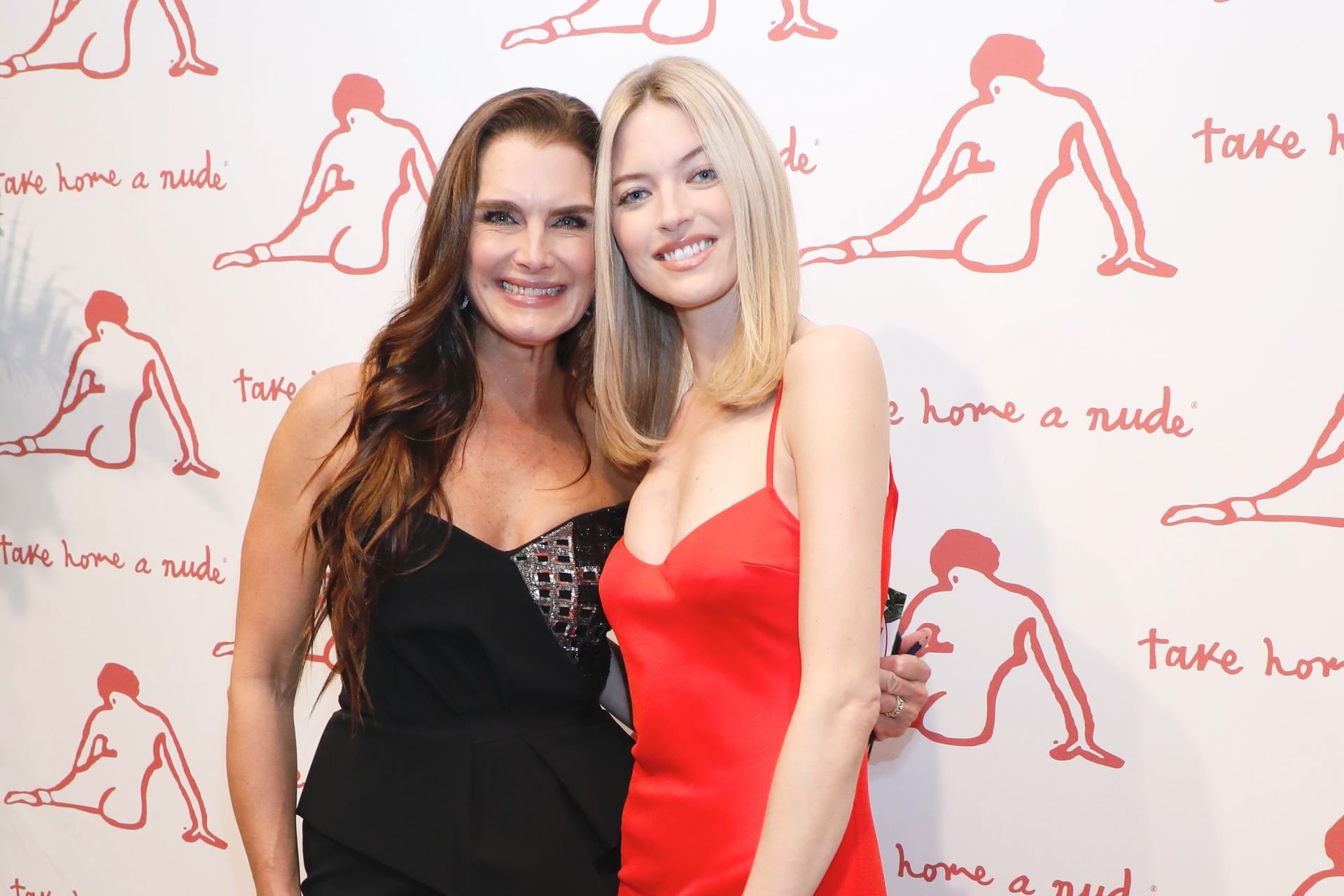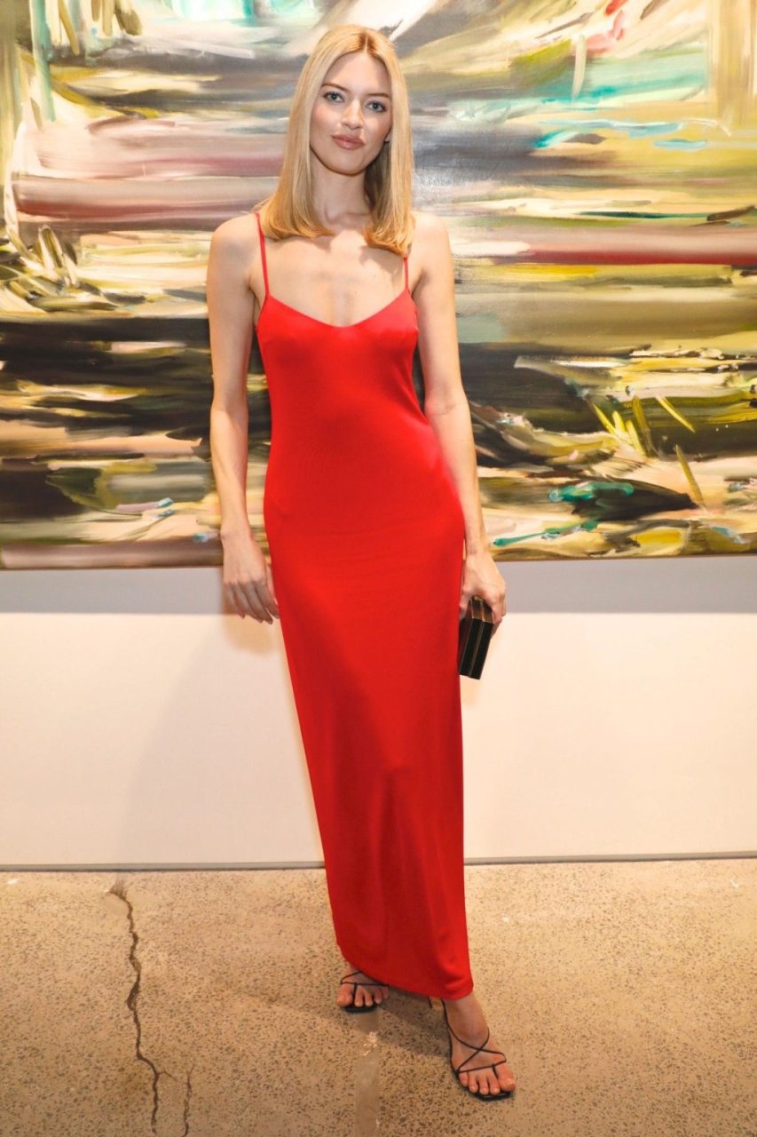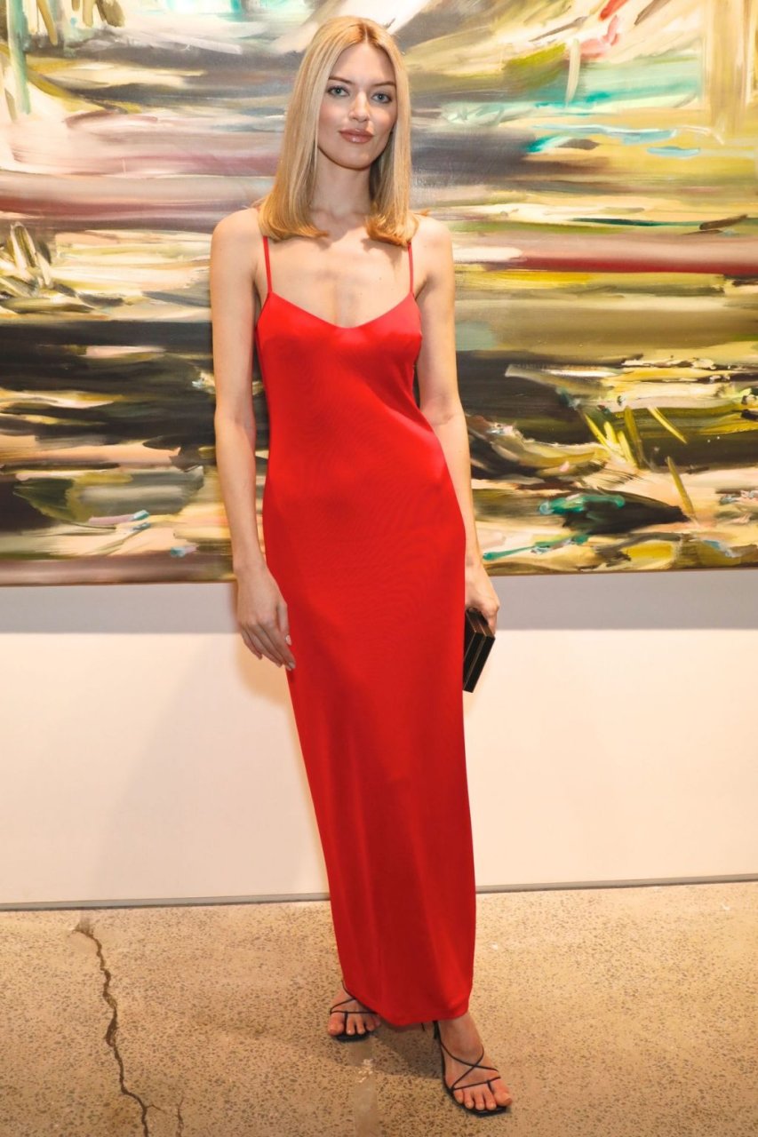 A modelo Martha Hunt foi vista sem sutiã em um vestido vermelho junto com Brooke Shields, David Kratz, Jason McDonald e outras celebridades no 28º evento anual Take Home A Nude da NY Academy of Art em Nova York, 15/10/2019.
