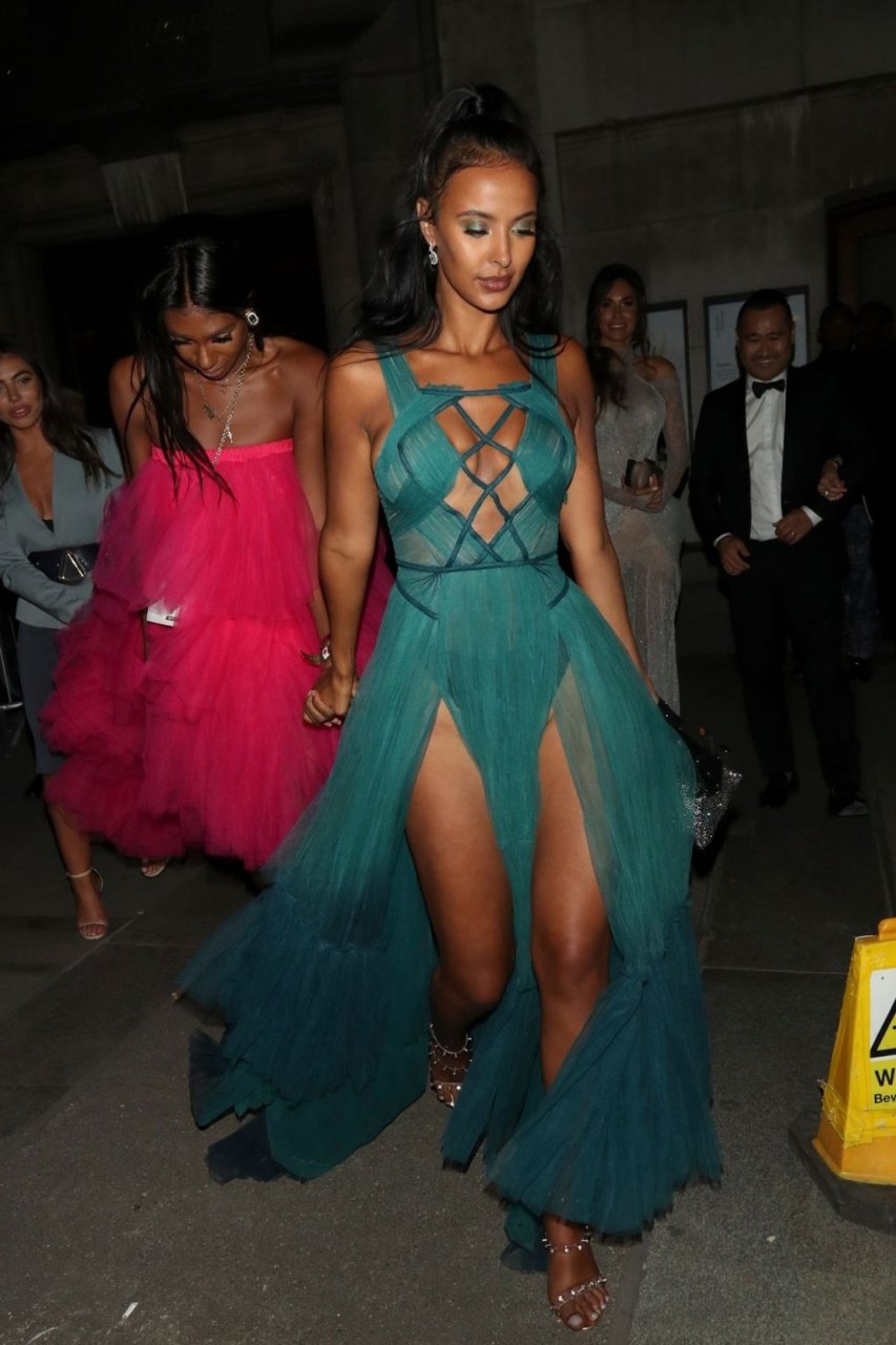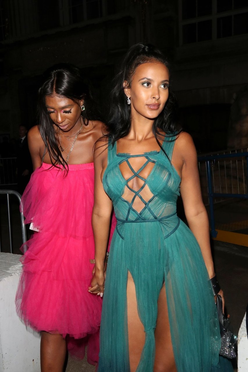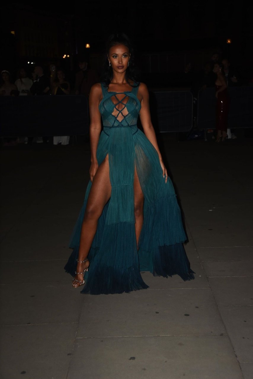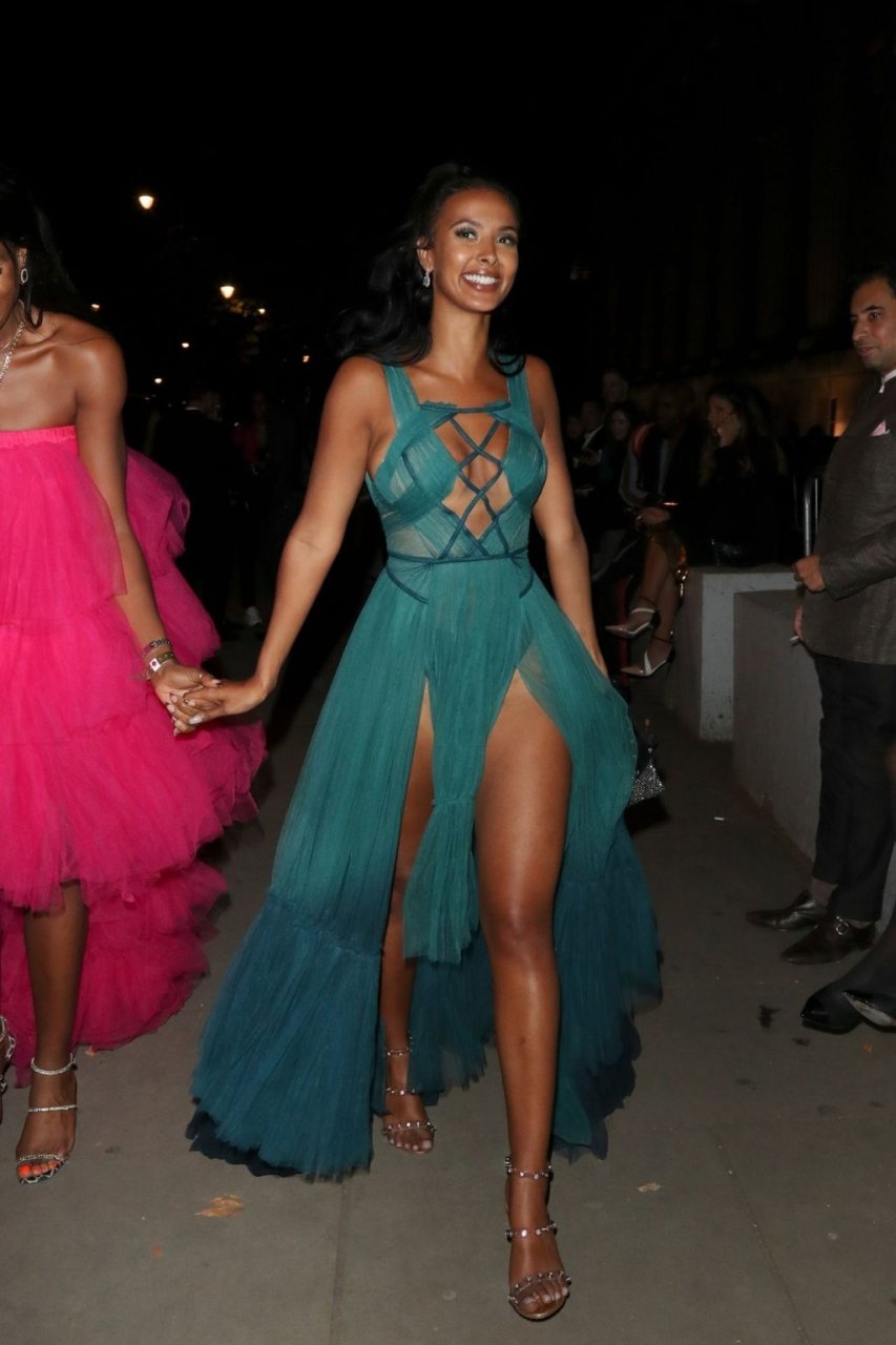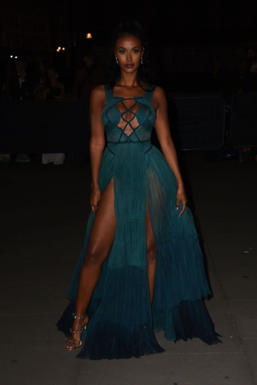Apresentadora de TV sexy Maya Jama participa do Fashion For Relief no Museu Britânico em Londres, Inglaterra, 14/09/2019. Maya exibiu suas pernas deslumbrantes posando com um vestido leve de noite, revelando sua calcinha.