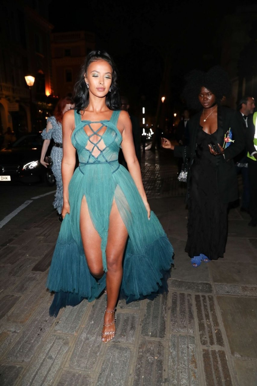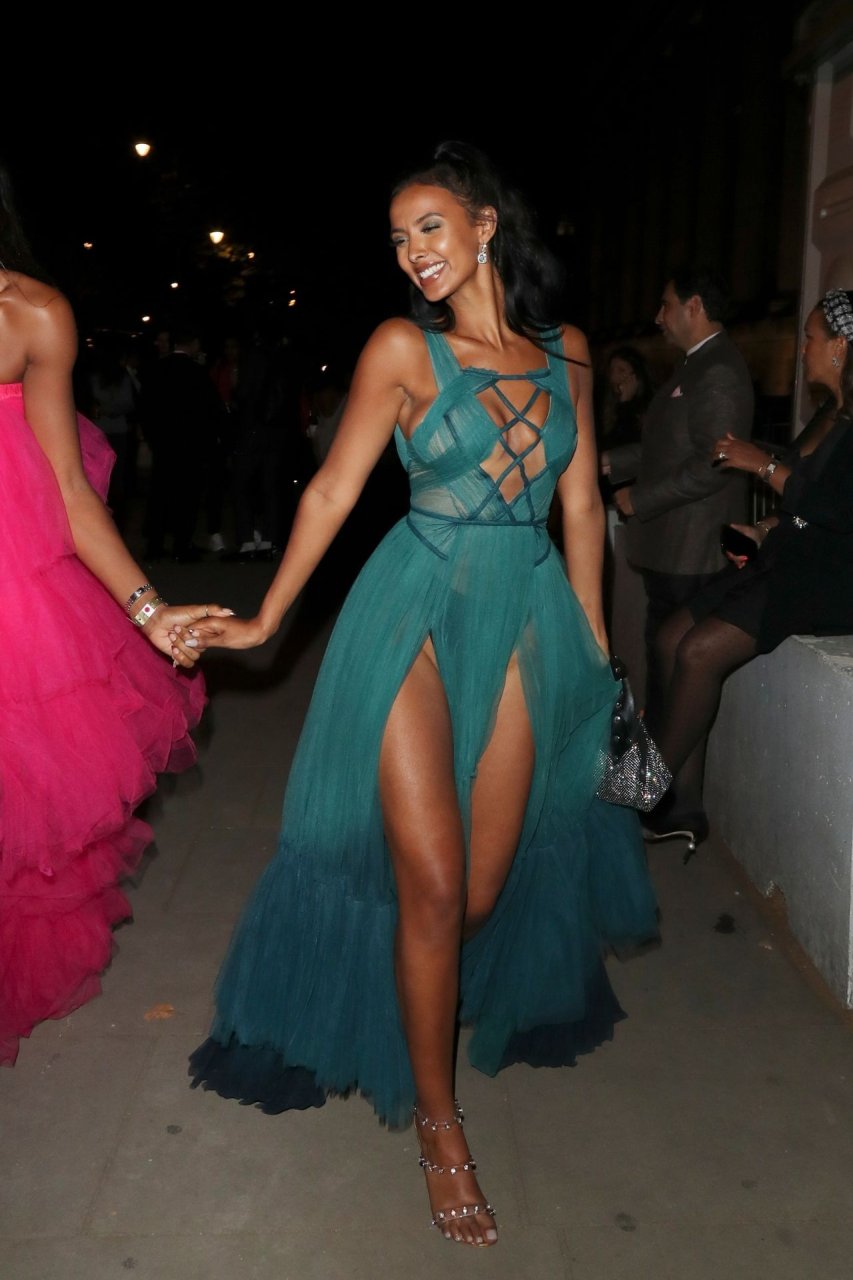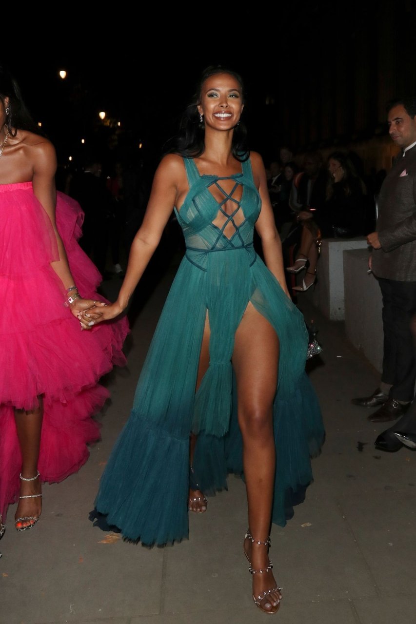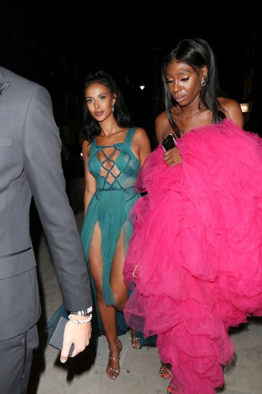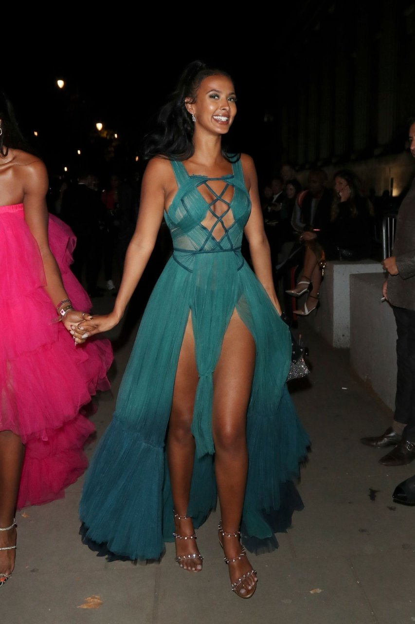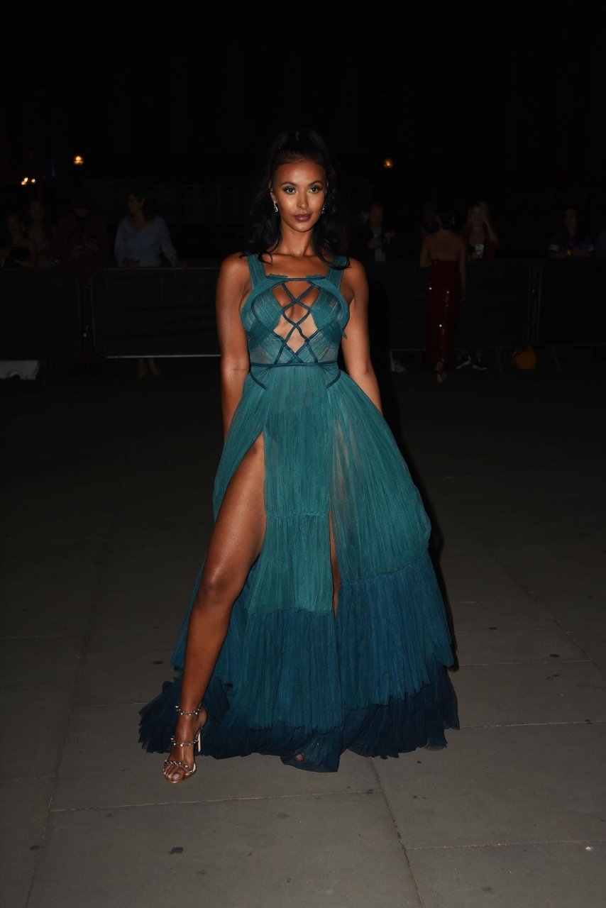 Apresentadora de TV sexy Maya Jama participa do Fashion For Relief no Museu Britânico em Londres, Inglaterra, 14/09/2019. Maya exibiu suas pernas deslumbrantes posando com um vestido leve de noite, revelando sua calcinha.