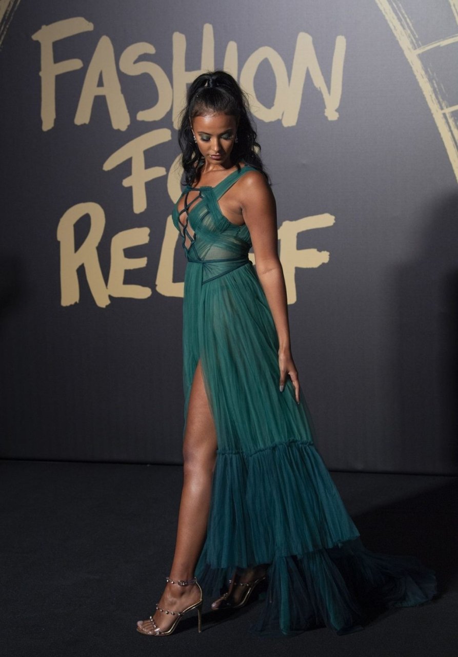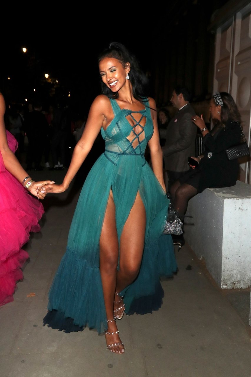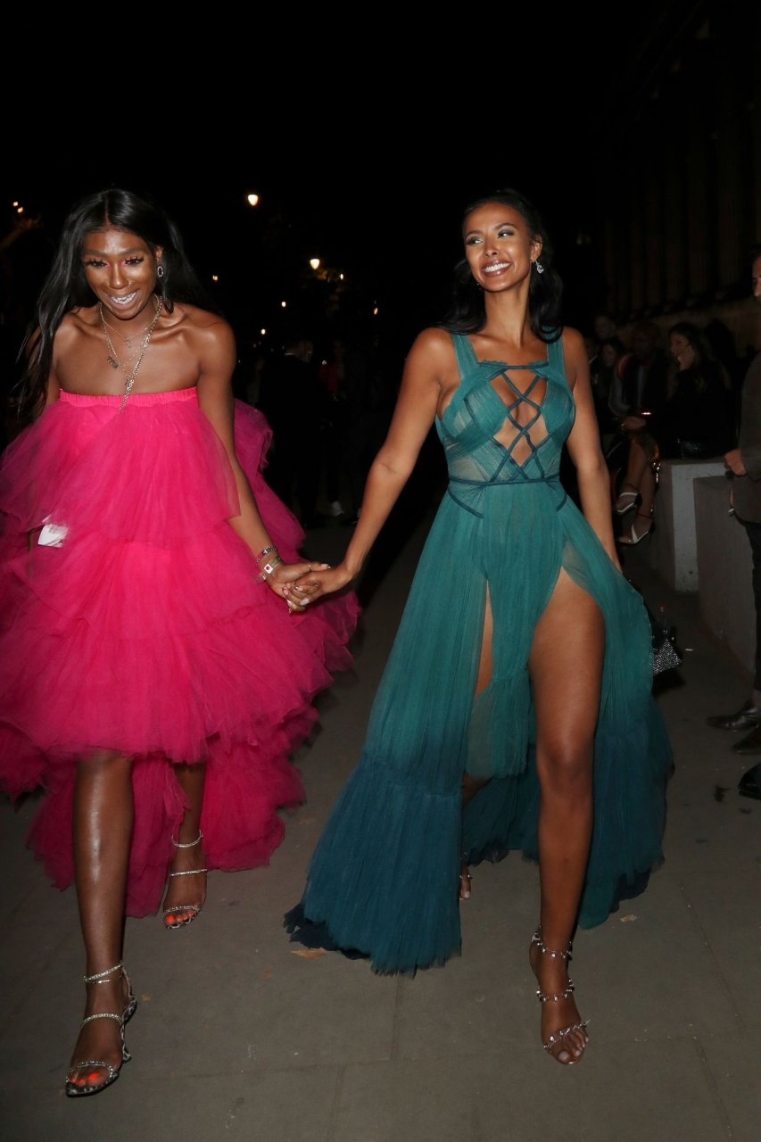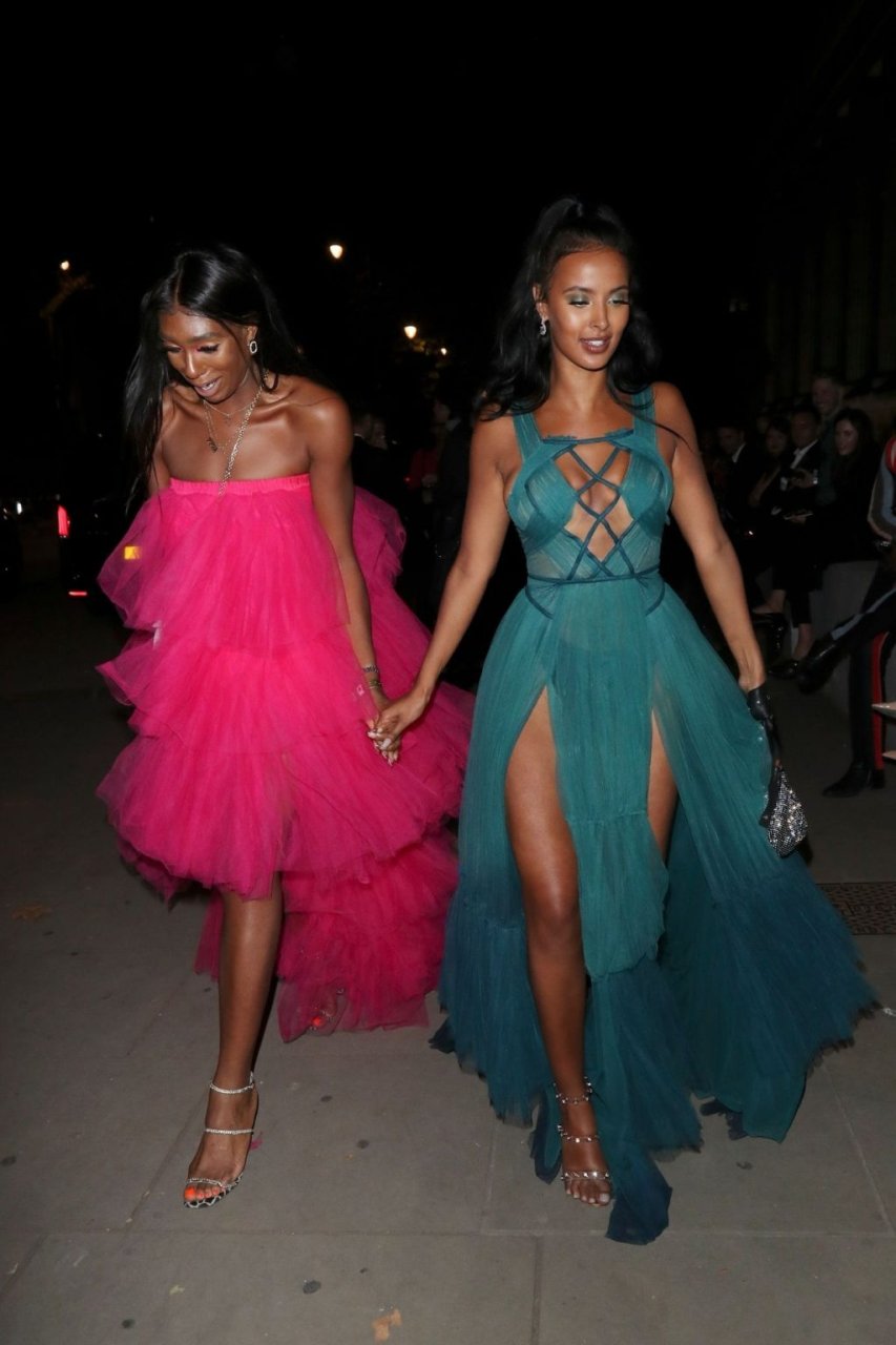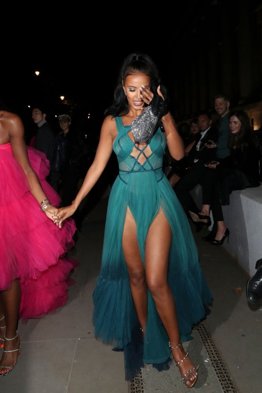 Apresentadora de TV sexy Maya Jama participa do Fashion For Relief no Museu Britânico em Londres, Inglaterra, 14/09/2019. Maya exibiu suas pernas deslumbrantes posando com um vestido leve de noite, revelando sua calcinha.