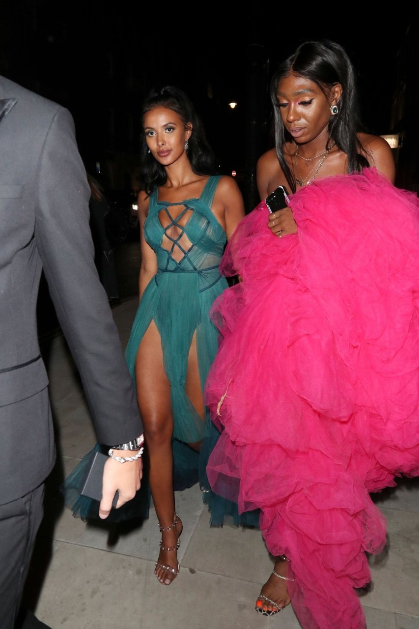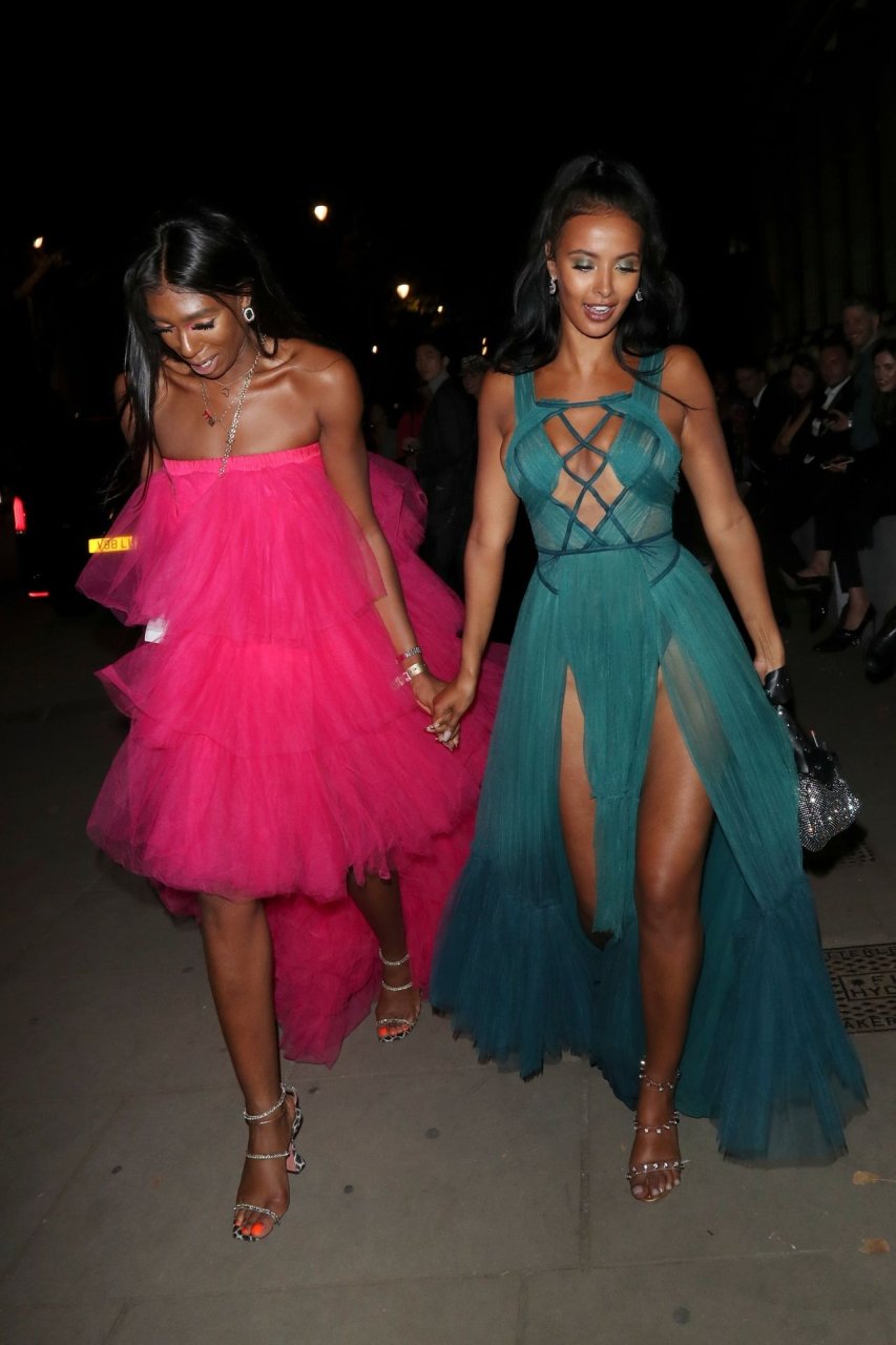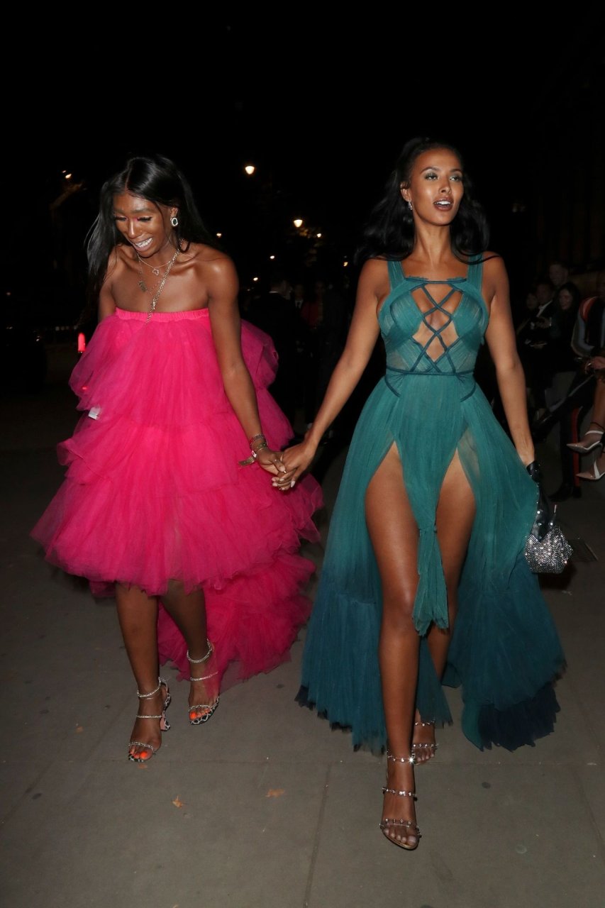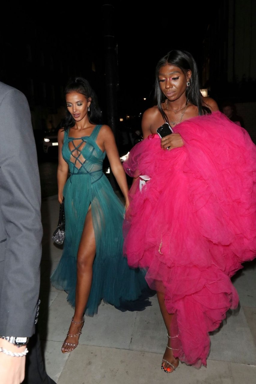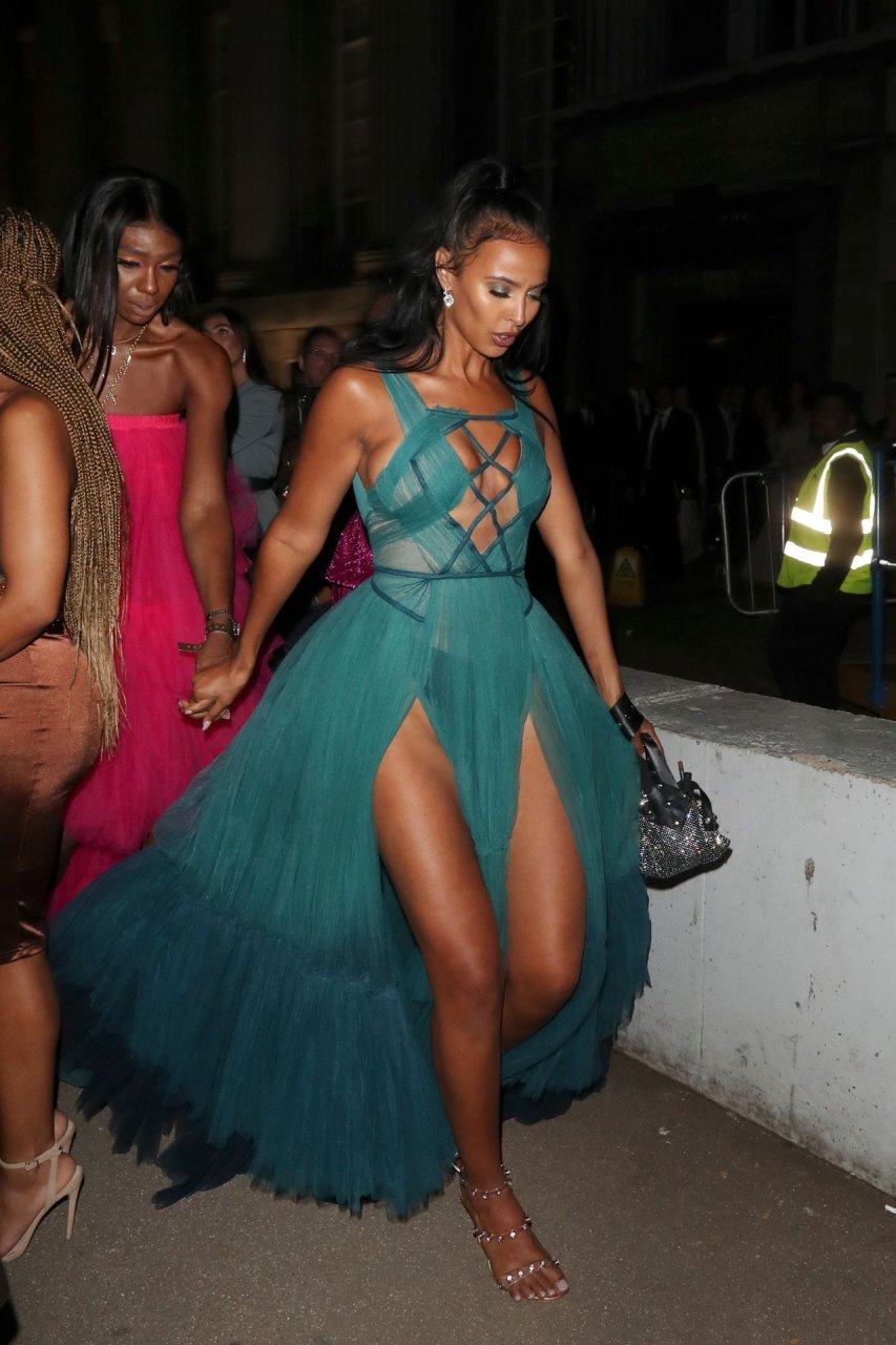Apresentadora de TV sexy Maya Jama participa do Fashion For Relief no Museu Britânico em Londres, Inglaterra, 14/09/2019. Maya exibiu suas pernas deslumbrantes posando com um vestido leve de noite, revelando sua calcinha.