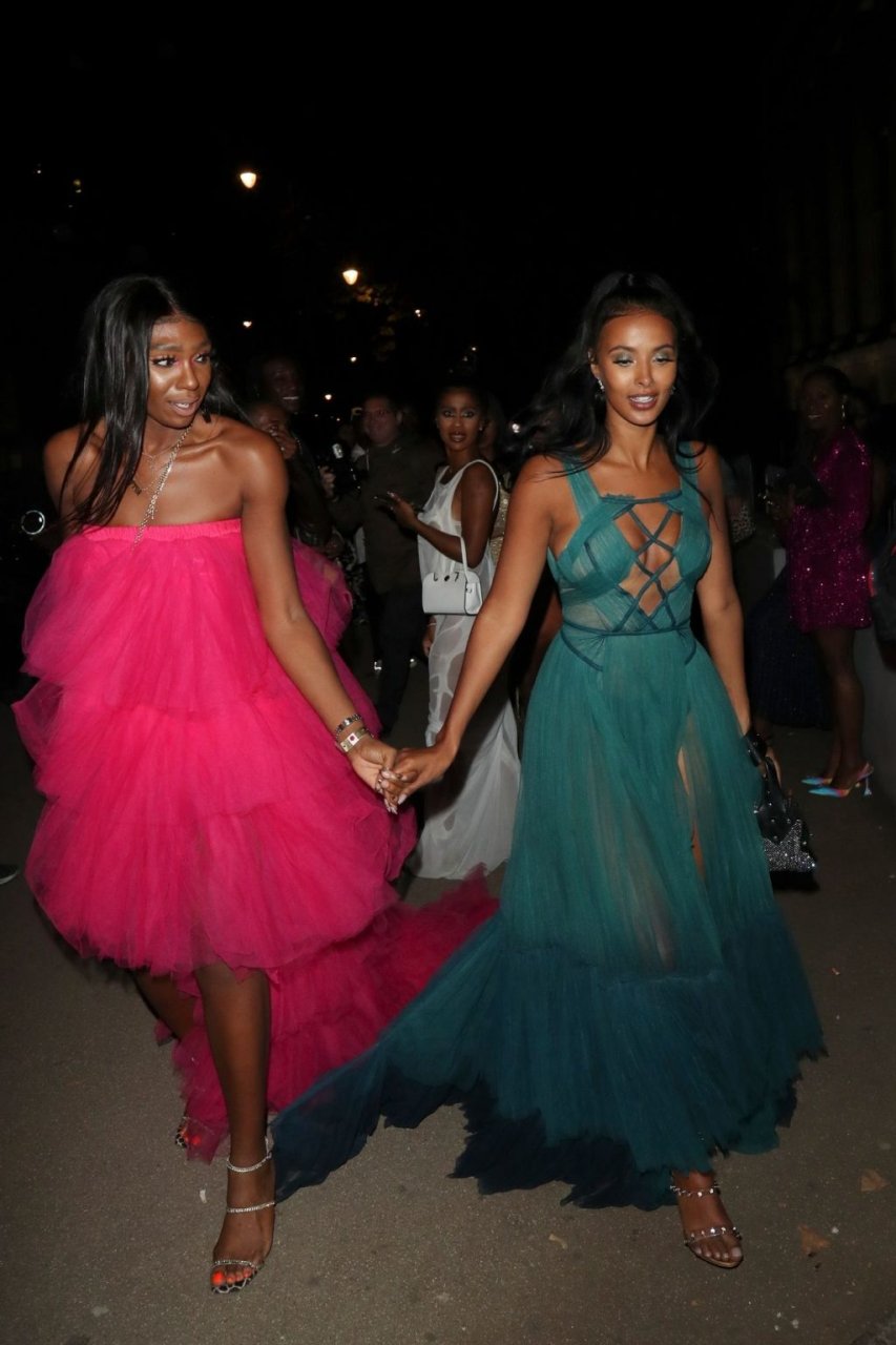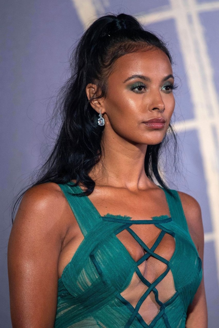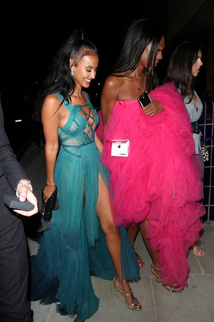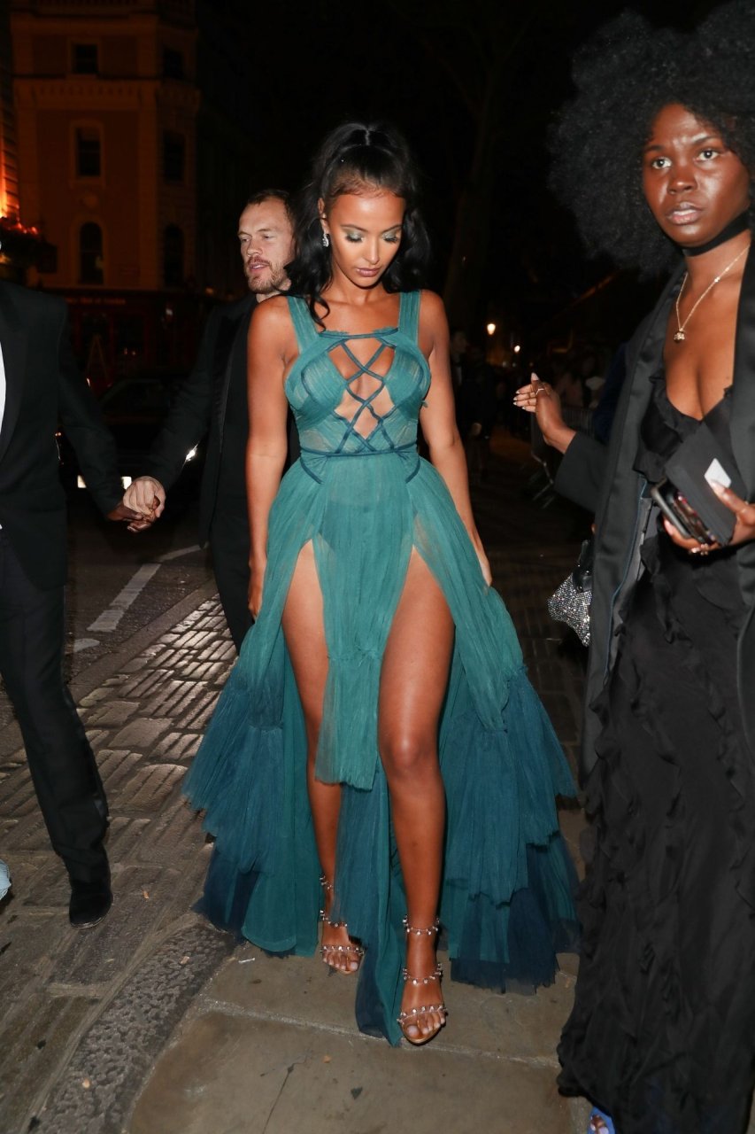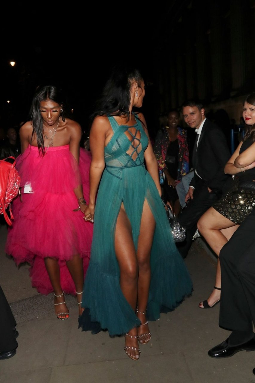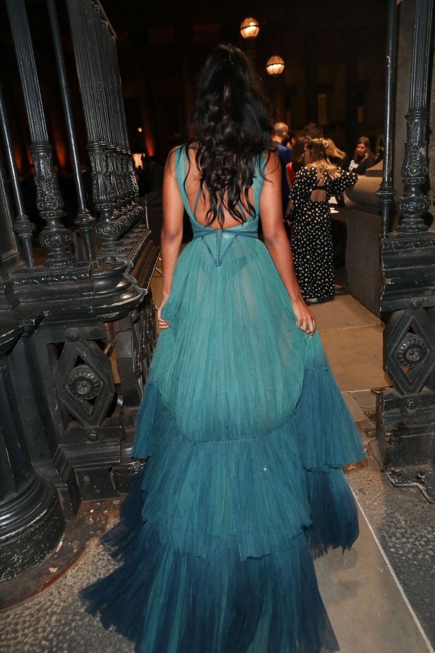 Apresentadora de TV sexy Maya Jama participa do Fashion For Relief no Museu Britânico em Londres, Inglaterra, 14/09/2019. Maya exibiu suas pernas deslumbrantes posando com um vestido leve de noite, revelando sua calcinha.