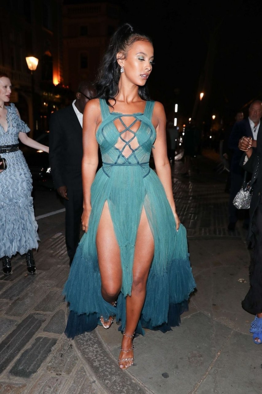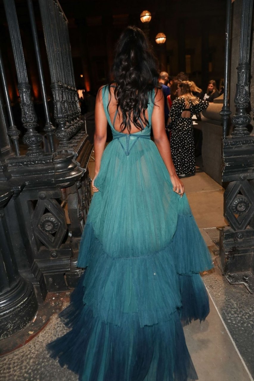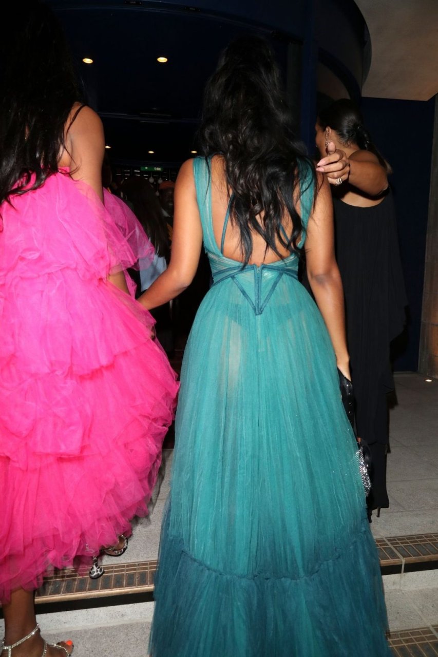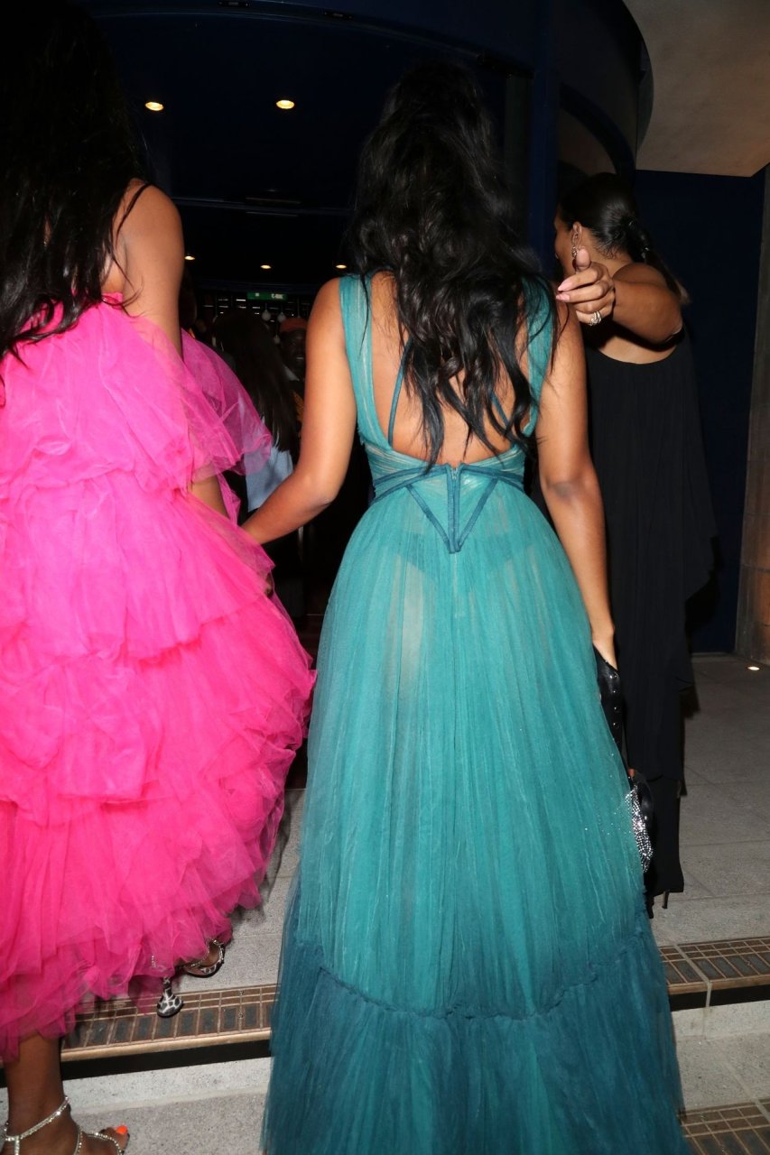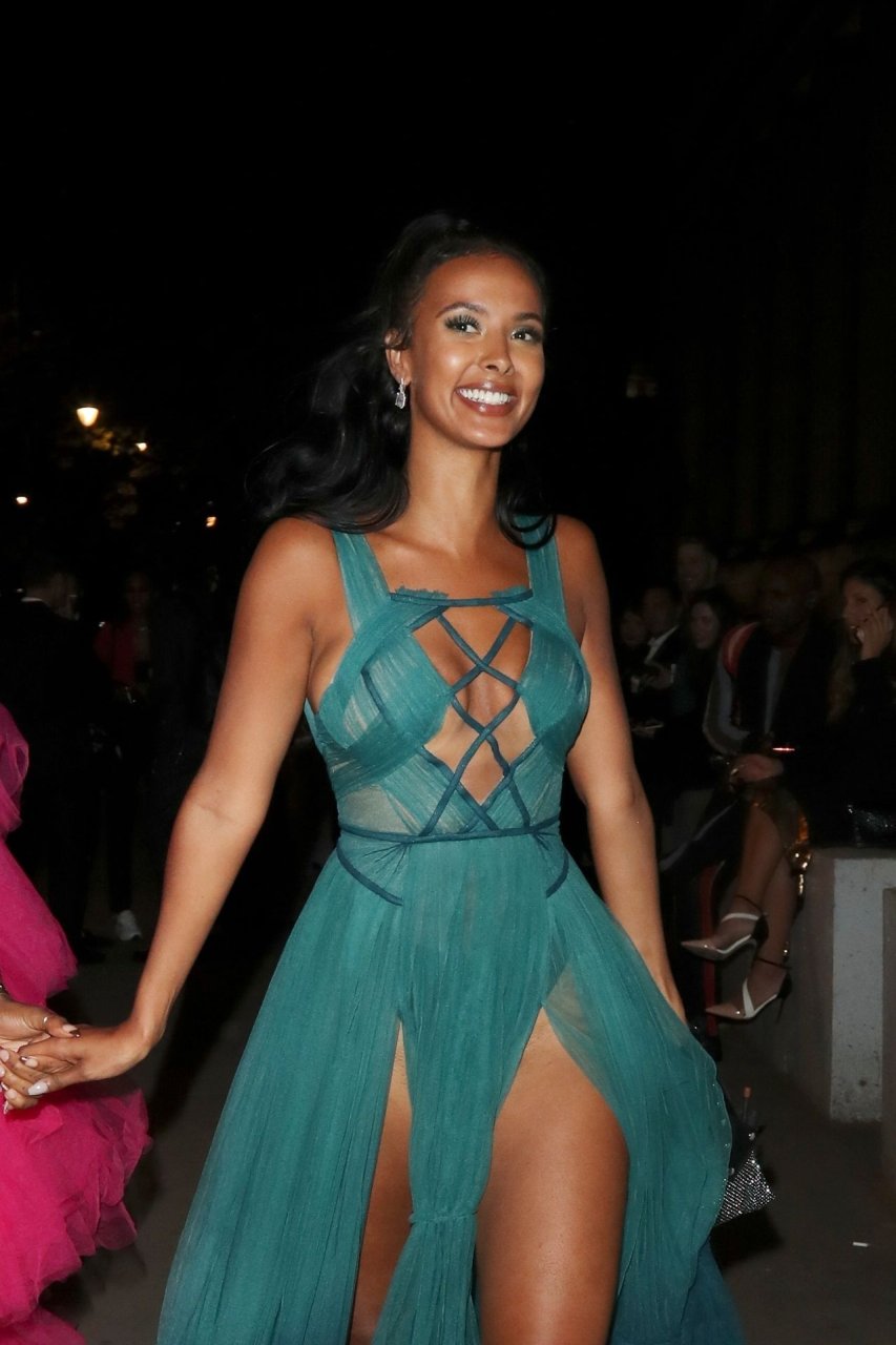 Apresentadora de TV sexy Maya Jama participa do Fashion For Relief no Museu Britânico em Londres, Inglaterra, 14/09/2019. Maya exibiu suas pernas deslumbrantes posando com um vestido leve de noite, revelando sua calcinha.
