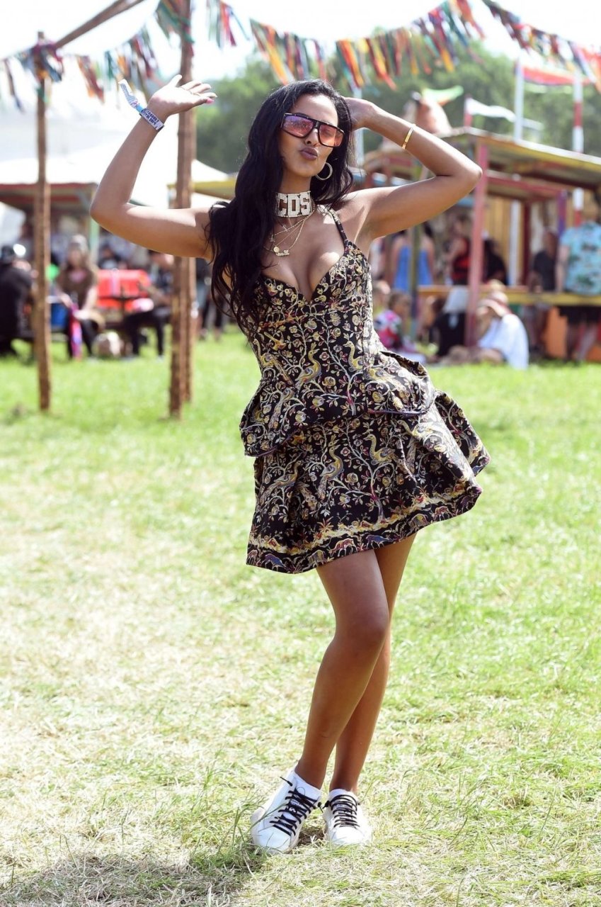Apresentadora de TV Ocupada e de Pernas Longas Maya Jama (24) foi vista no Festival de Glastonbury 2019, 28/06/2019.