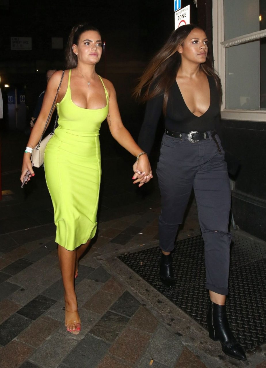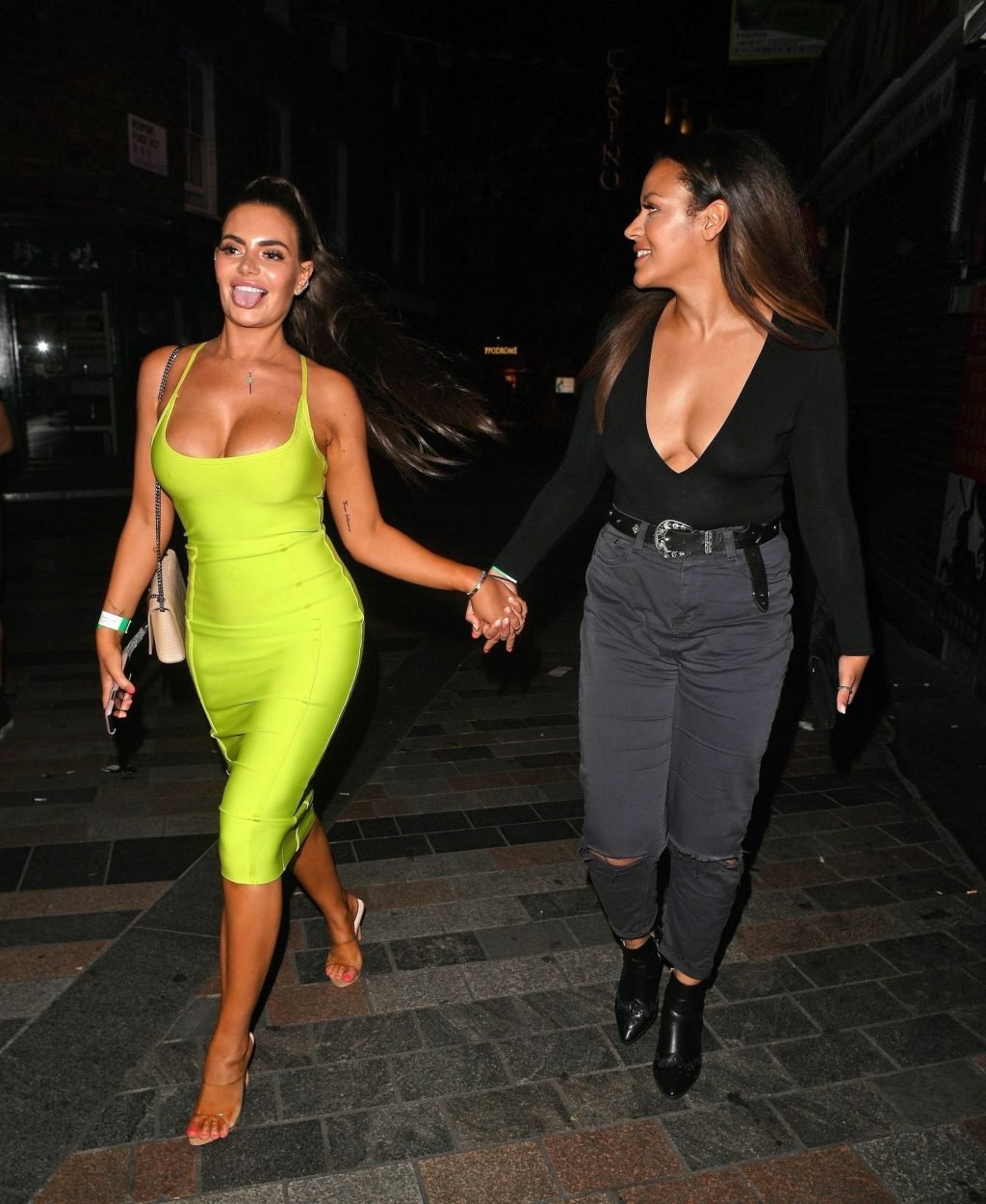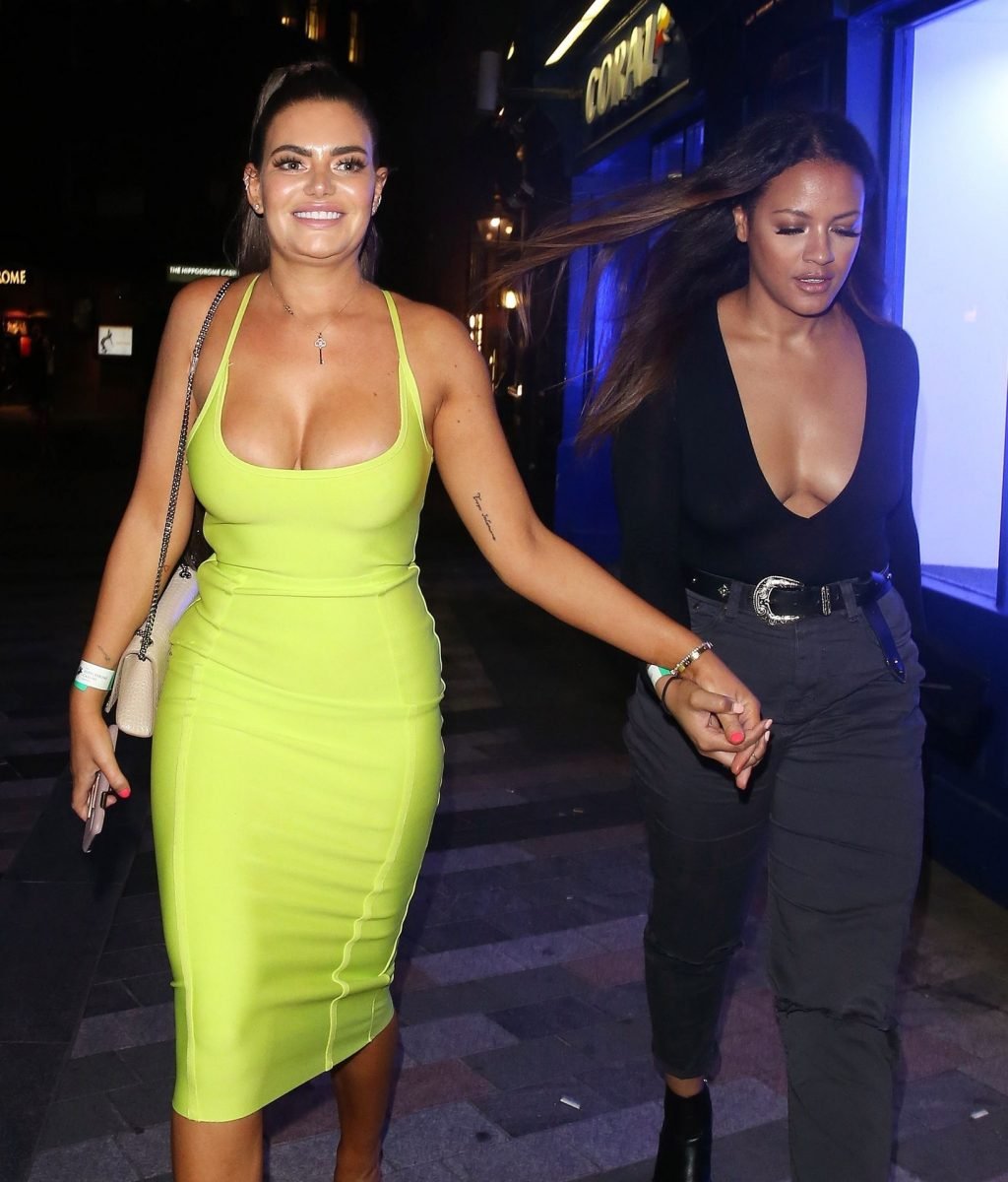 Megan Barton Hanson foi fotografada parecendo um pouco desgastada ao sair do cassino Hippodrome e depois vista posando em Soho ao lado de um cartaz dela mesma, 08/06/2019. Megan exibiu um visual chamativo usando um vestido verde brilhante.