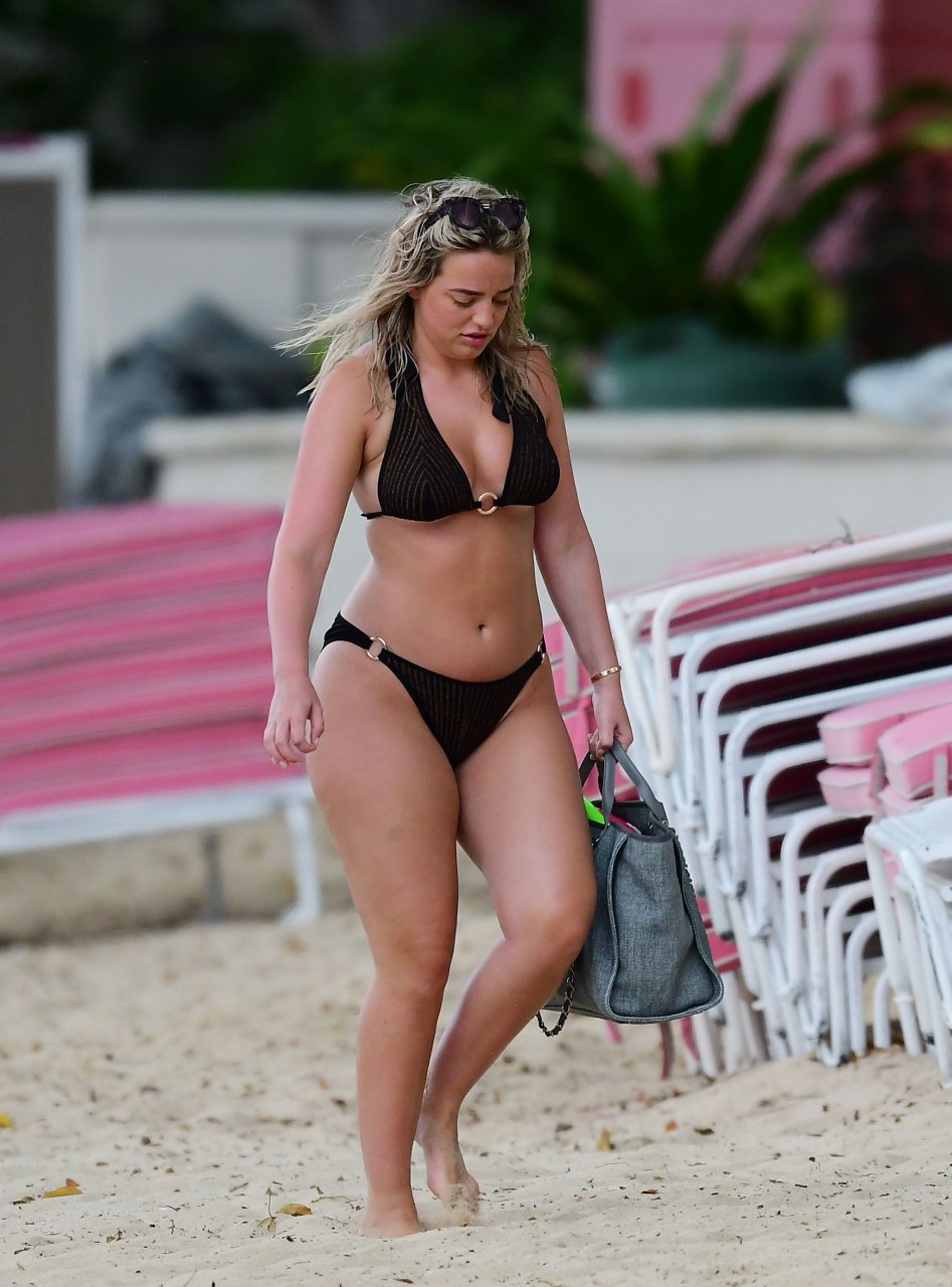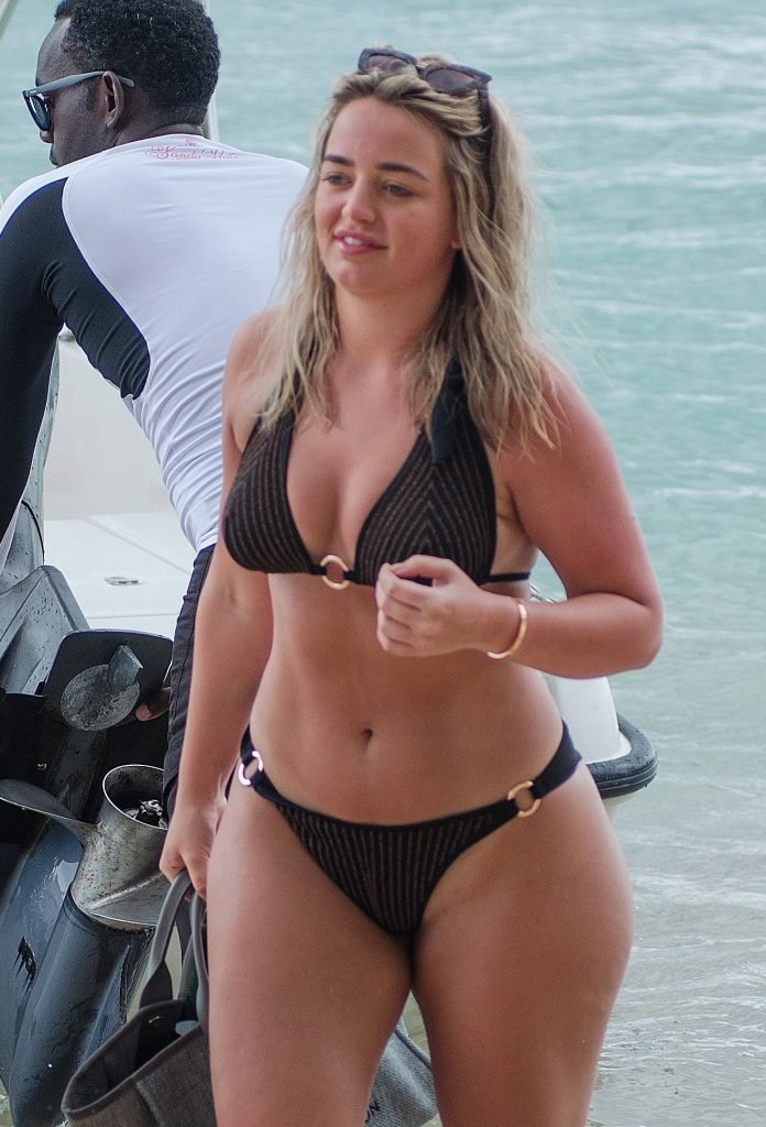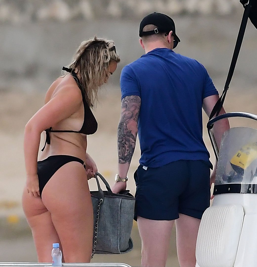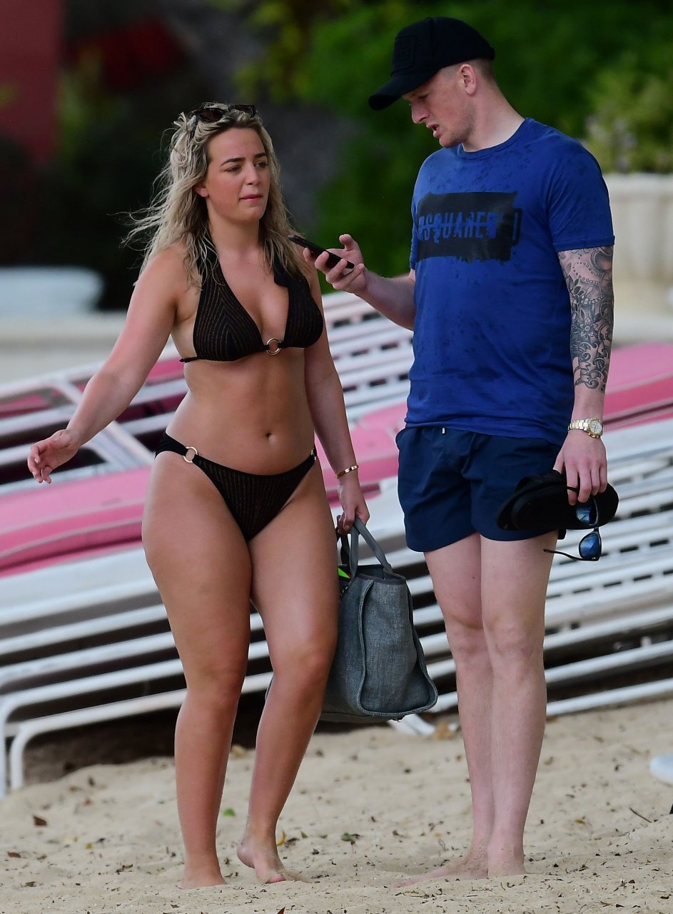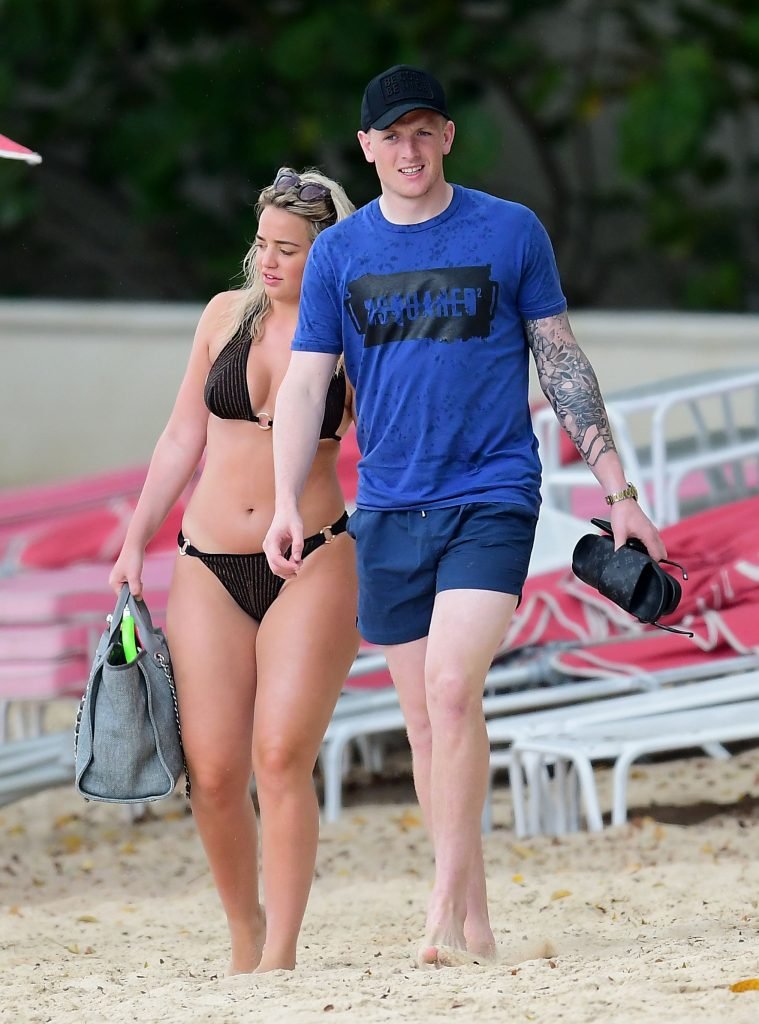 O goleiro do Everton, Jordan Pickford, e a namorada Megan Davison foram vistos na praia durante as férias em Barbados, 18/05/2018. A loira curvilínea exibiu seu grande bumbum usando um biquíni preto.
