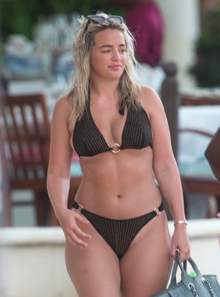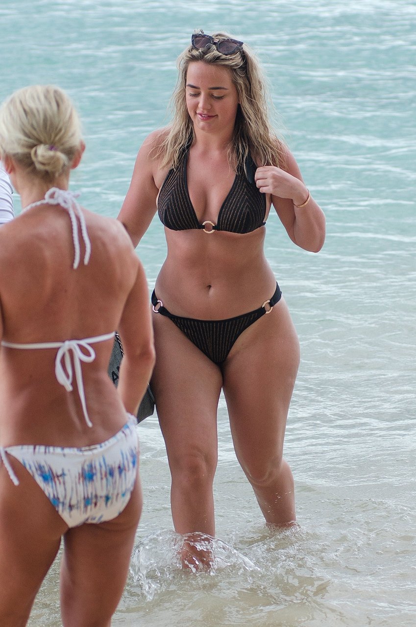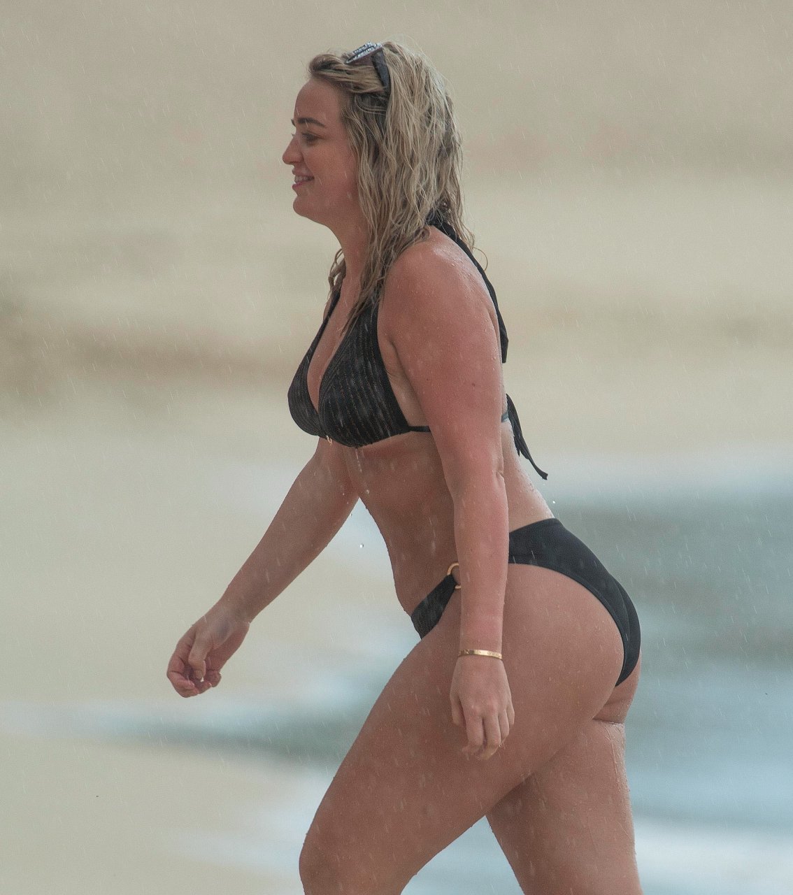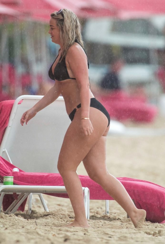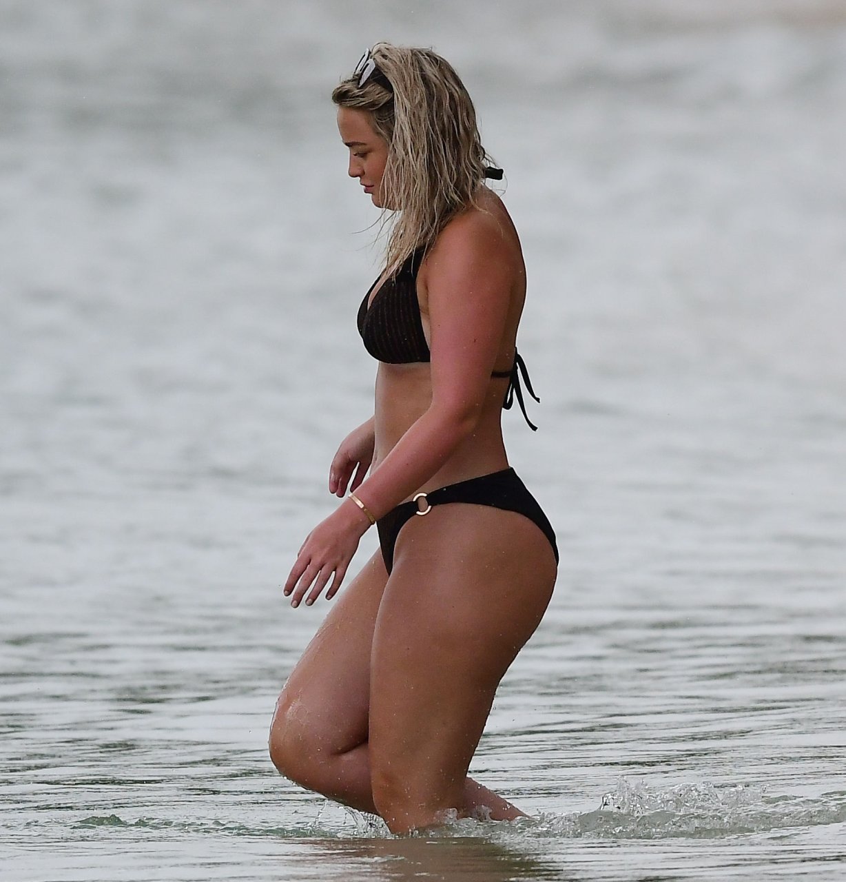O goleiro do Everton, Jordan Pickford, e a namorada Megan Davison foram vistos na praia durante as férias em Barbados, 18/05/2018. A loira curvilínea exibiu seu grande bumbum usando um biquíni preto.
