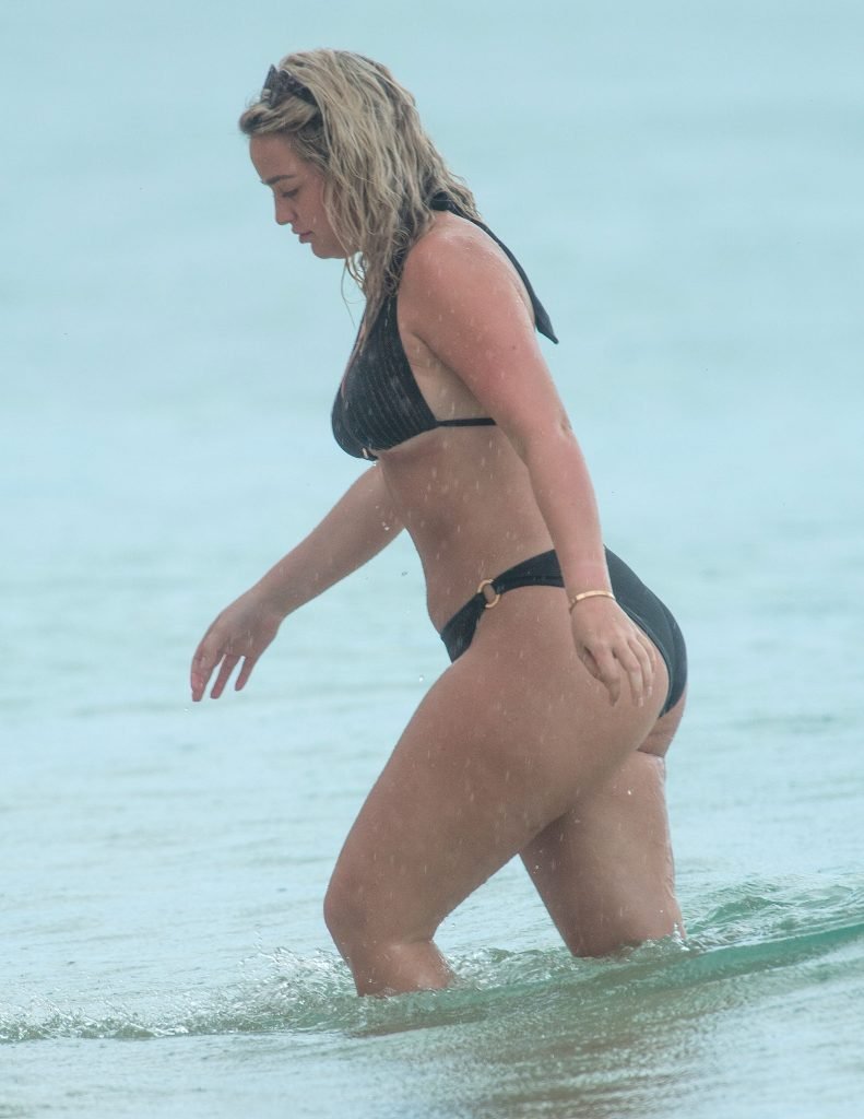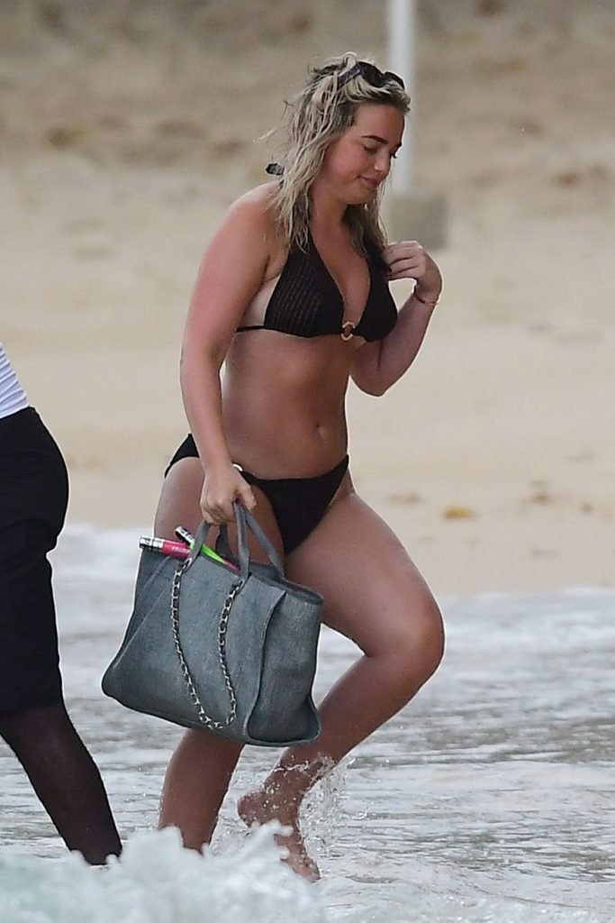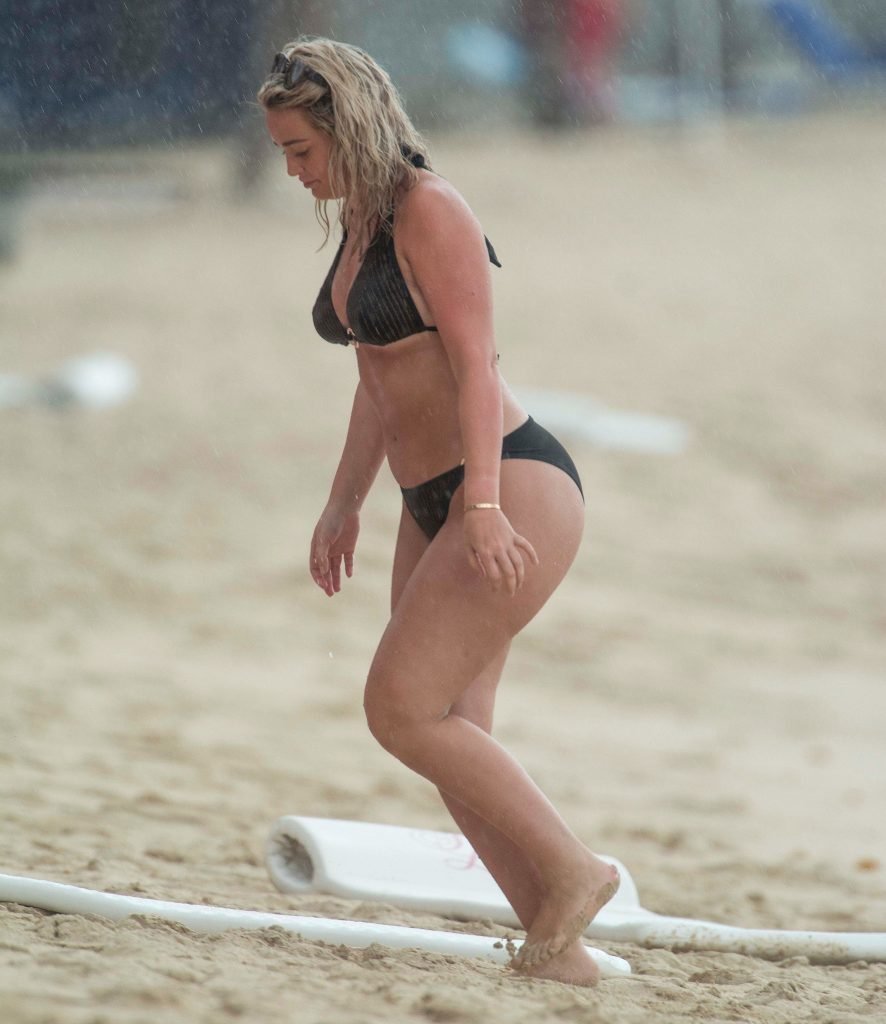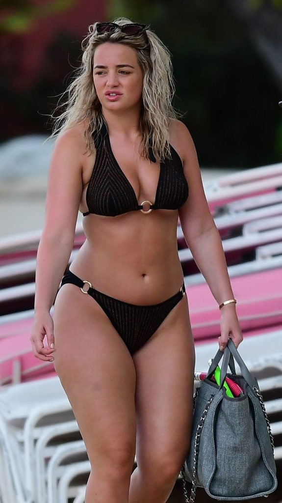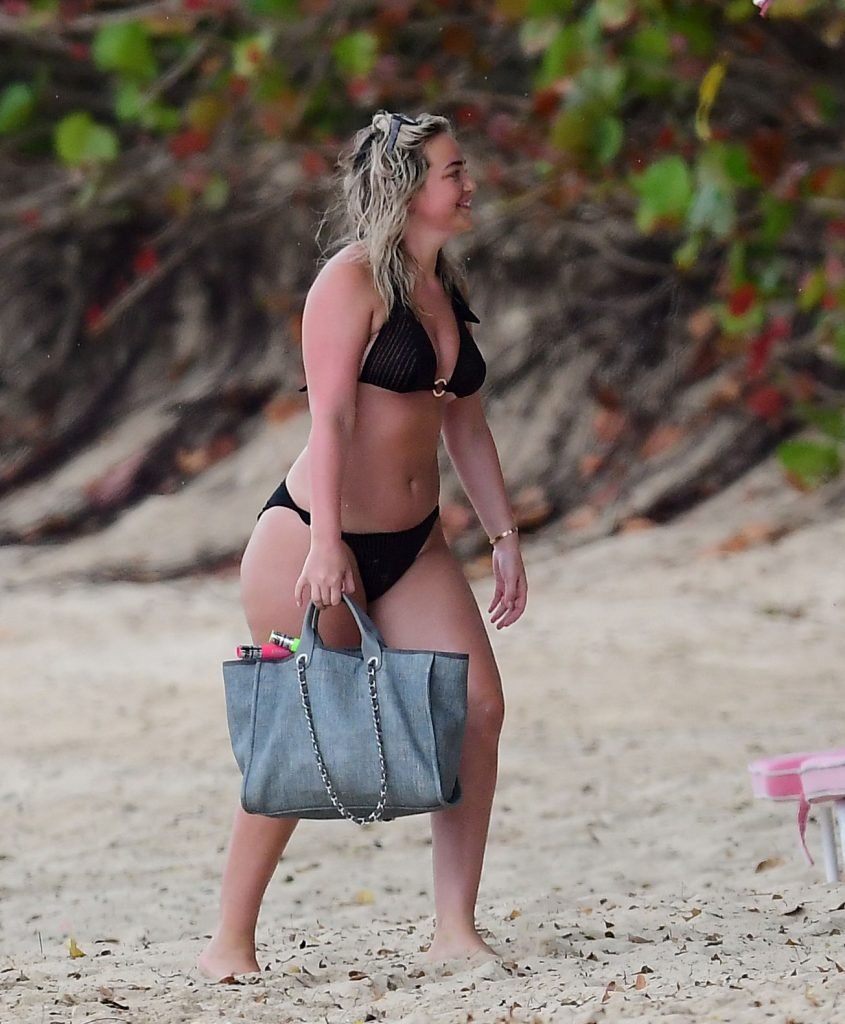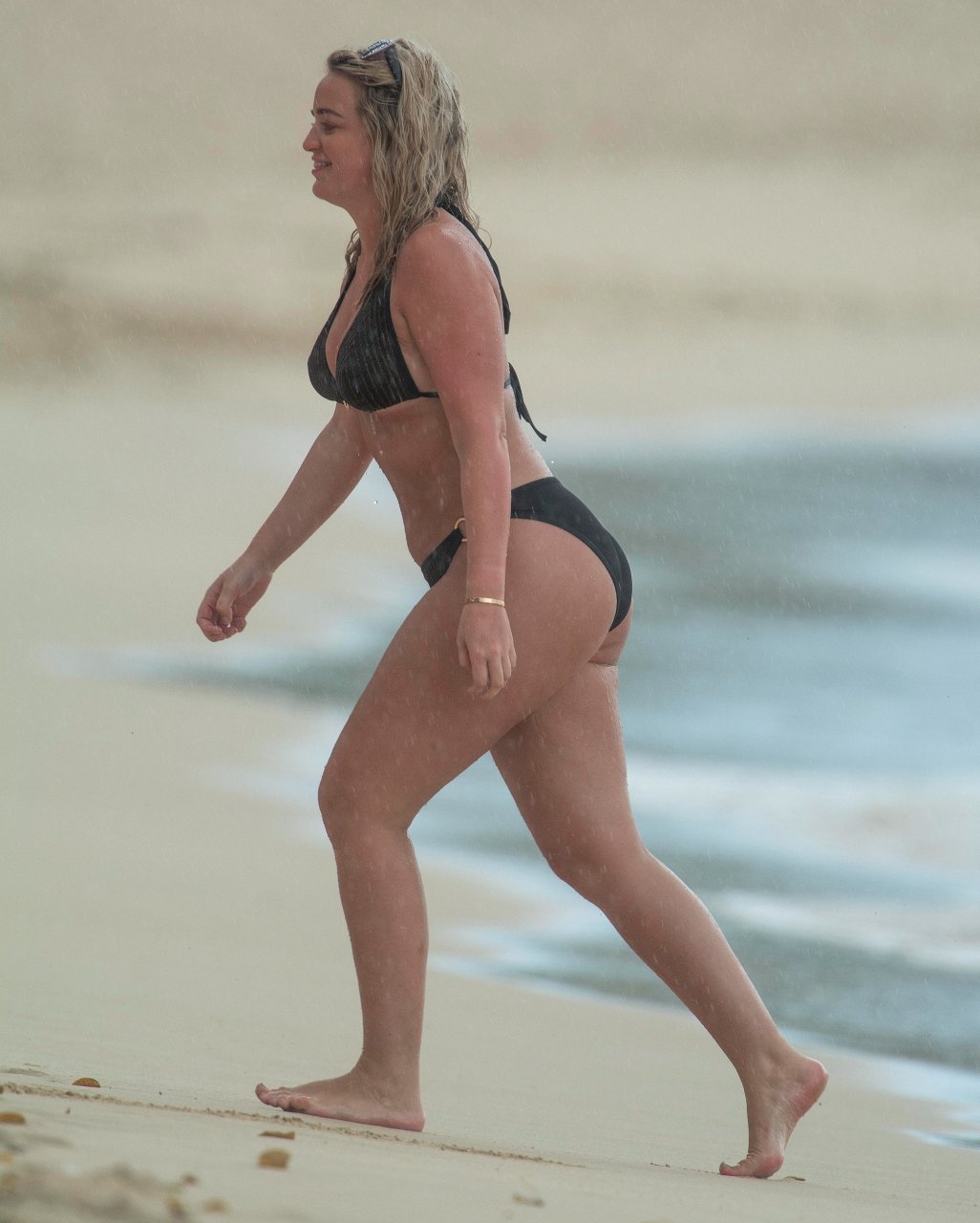 O goleiro do Everton, Jordan Pickford, e a namorada Megan Davison foram vistos na praia durante as férias em Barbados, 18/05/2018. A loira curvilínea exibiu seu grande bumbum usando um biquíni preto.