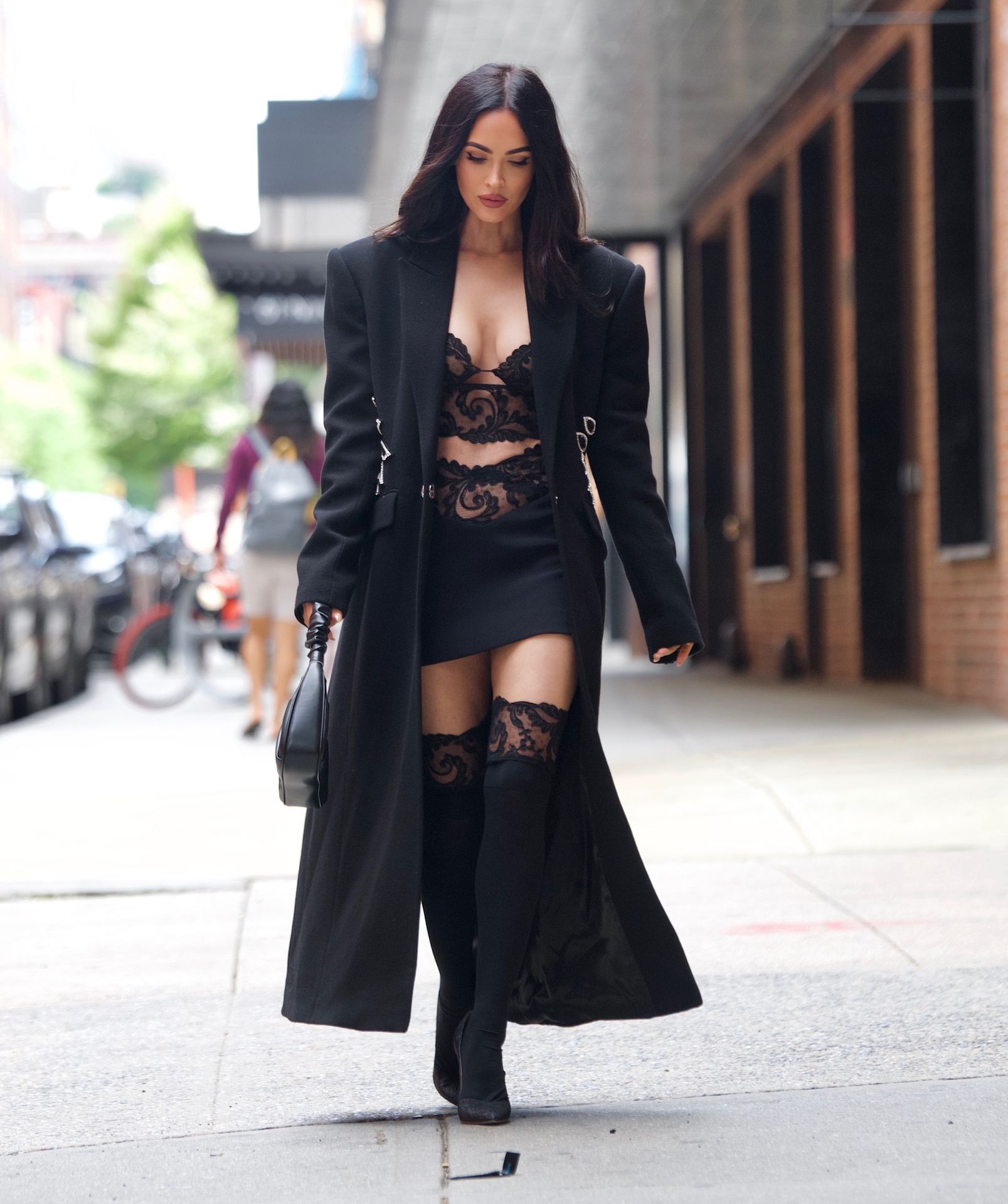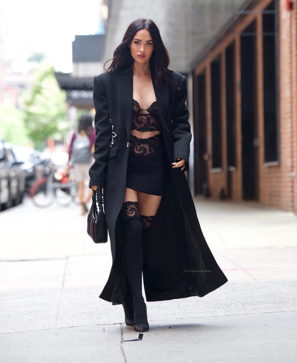 Atriz Megan Fox é vista com um top revelador, minissaia e botas, indo para uma prova em Nova York, 11/09/2021.