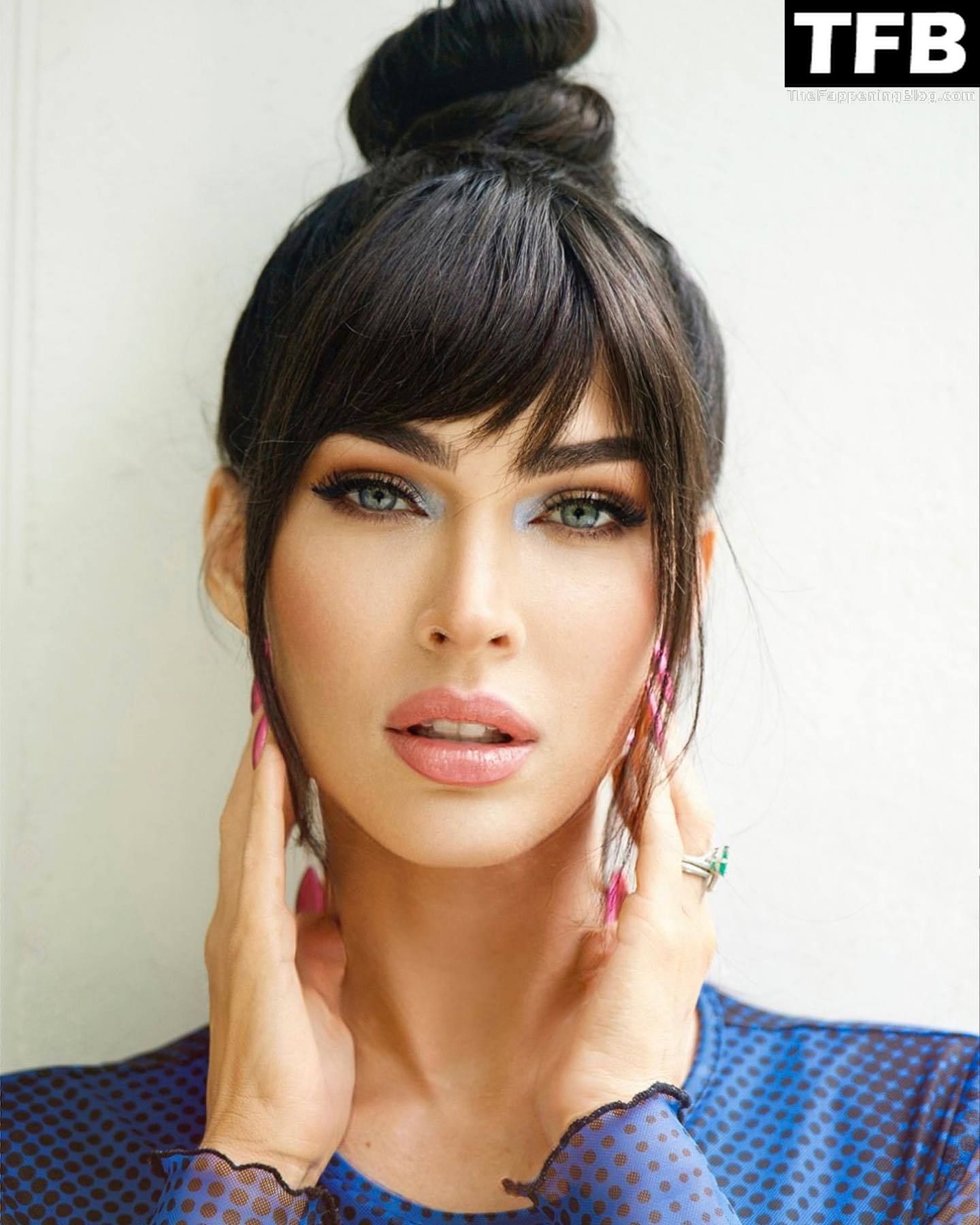 A estrela de The Fappening Megan Fox posa com saia azul, top e botas pretas em um ensaio fotográfico de Cibelle Levi (abril de 2022).