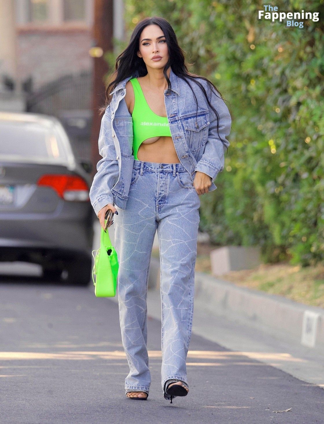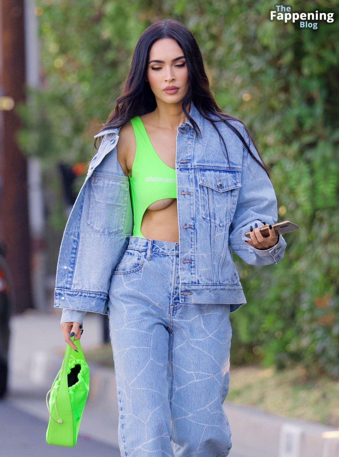 Esse visual não é apenas sobre a vida pessoal dela – é também uma grande mudança de estilistas. Este é um look de outono seriamente sexy. Esse conjunto oversized de jeans Alexander Wang, com a textura legal que lembra mármore, é um verdadeiro chamariz. Mas, honestamente, todos estão olhando para o maiô neon da Megan com seu decote super baixo — ele praticamente mostra o colo dela. A figura da Megan é, como sempre, incrível.