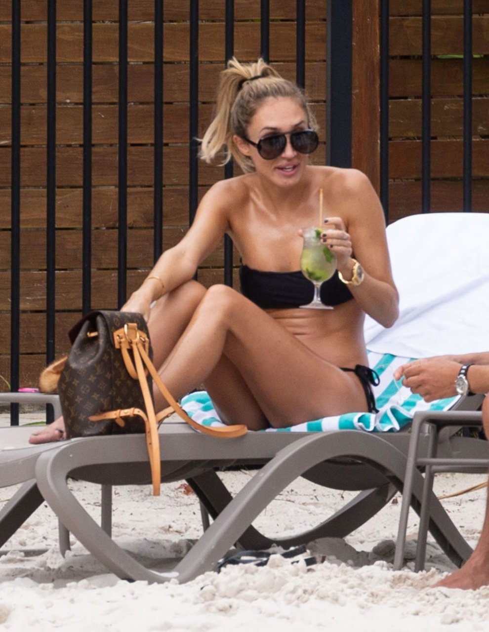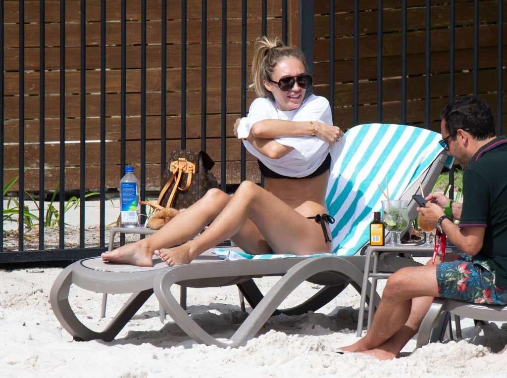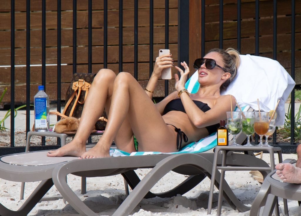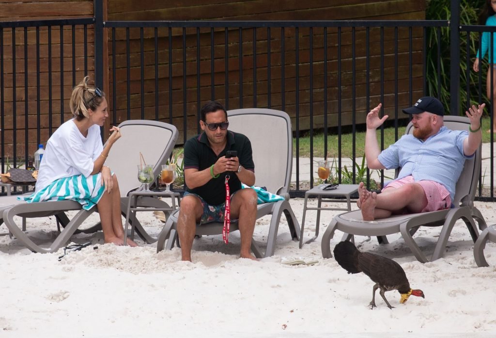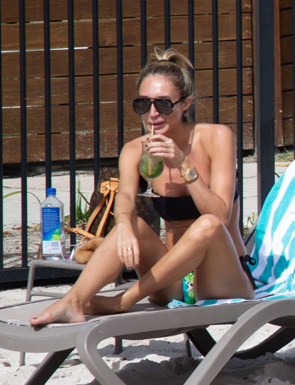 A estrela inglesa de reality show Megan McKenna aproveita o sol enquanto desfruta de uma bebida à beira da piscina em Queensland, 18/11/2018. Megan aproveitou ao máximo o tempo ensolarado, bronzeando-se à beira da piscina com um biquíni preto.