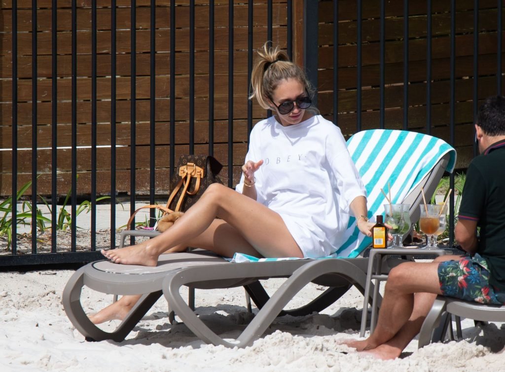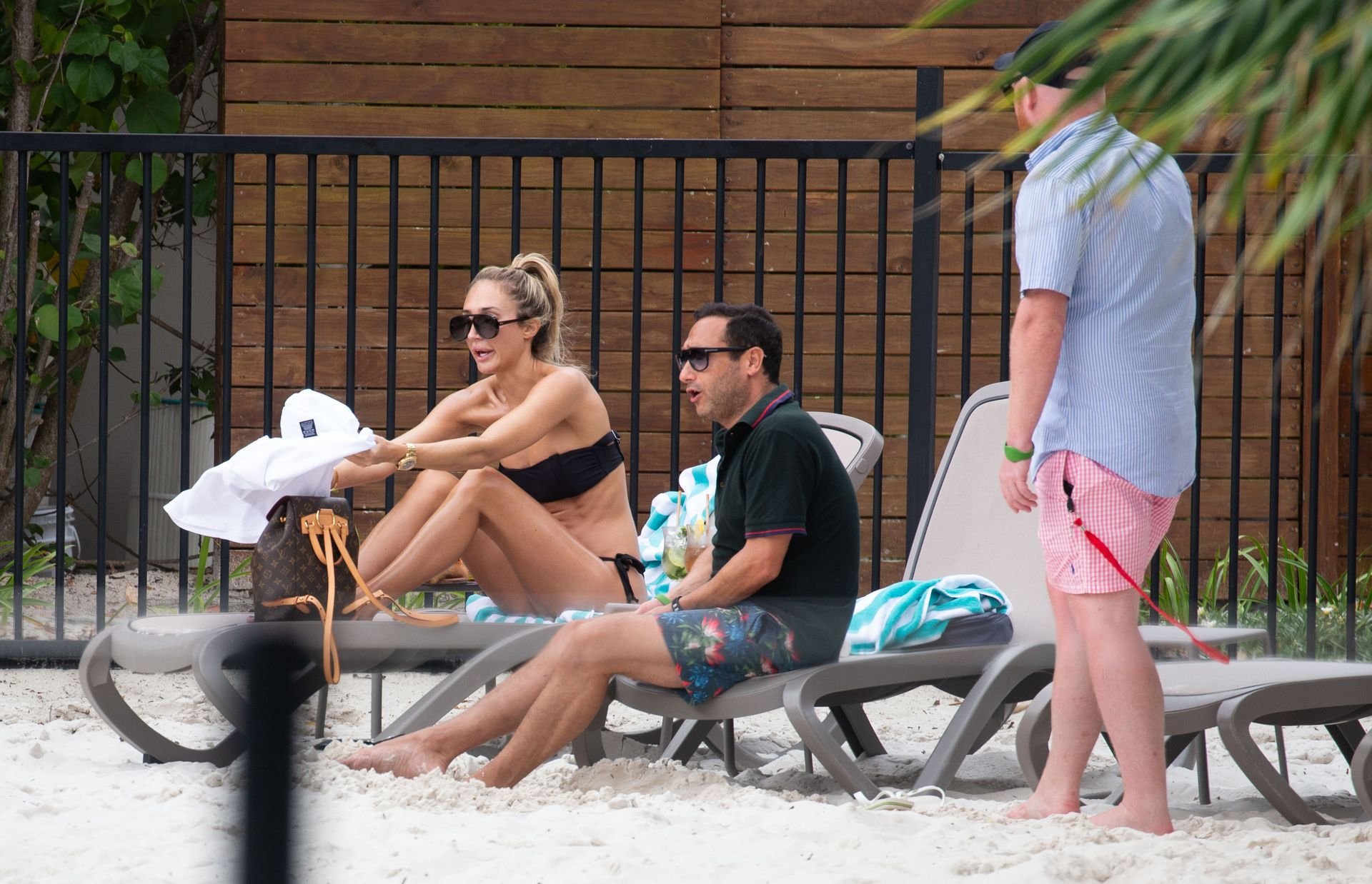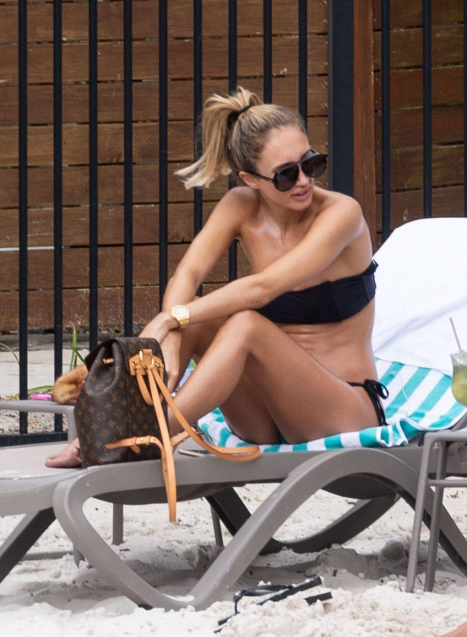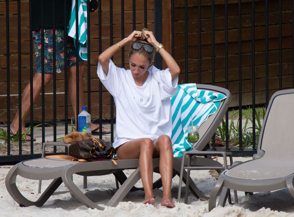 A estrela inglesa de reality show Megan McKenna aproveita o sol enquanto desfruta de uma bebida à beira da piscina em Queensland, 18/11/2018. Megan aproveitou ao máximo o tempo ensolarado, bronzeando-se à beira da piscina com um biquíni preto.