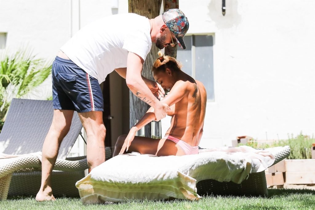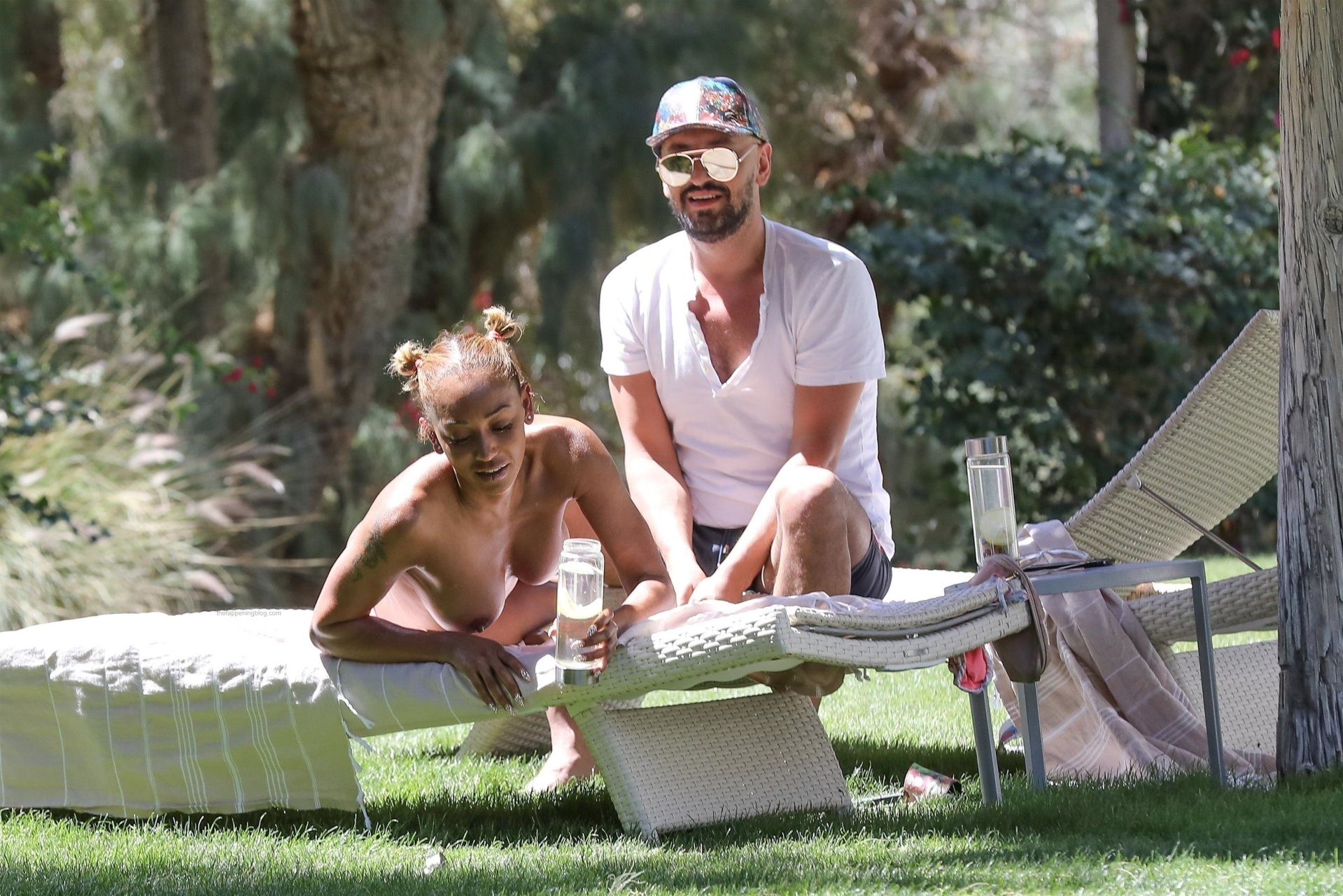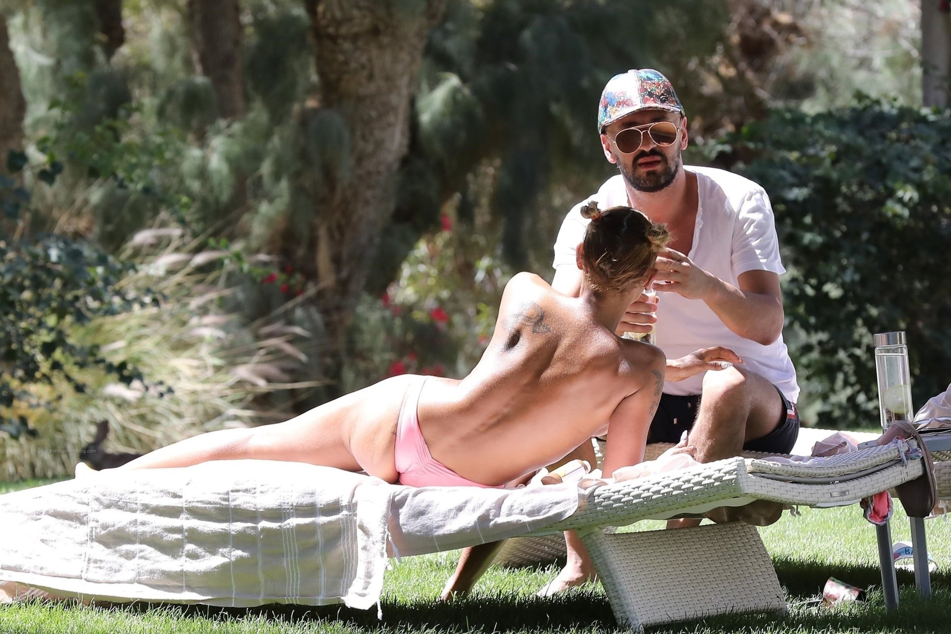 Mel B, 42, exibe seus grandes seios falsos pretos enquanto aproveita as férias com o novo namorado Gary Madatyan em um resort 5 estrelas em Desert Hot Springs, Califórnia, 19/04/2018. A Spice Girl mais velha parecia estar se divertindo enquanto sua amiga espalhava loção bronzeadora por todo o seu corpo!