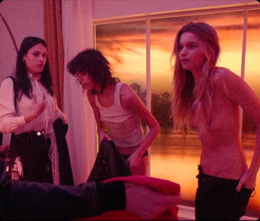 Abbey Lee e Mica Argañaraz estão ambas sem sutiã enquanto se trocam nos bastidores de um set de filmagem, as garotas terminando de calcinha (Abbey à direita, Mica à esquerda com uma regata com mamilos pontudos no começo).