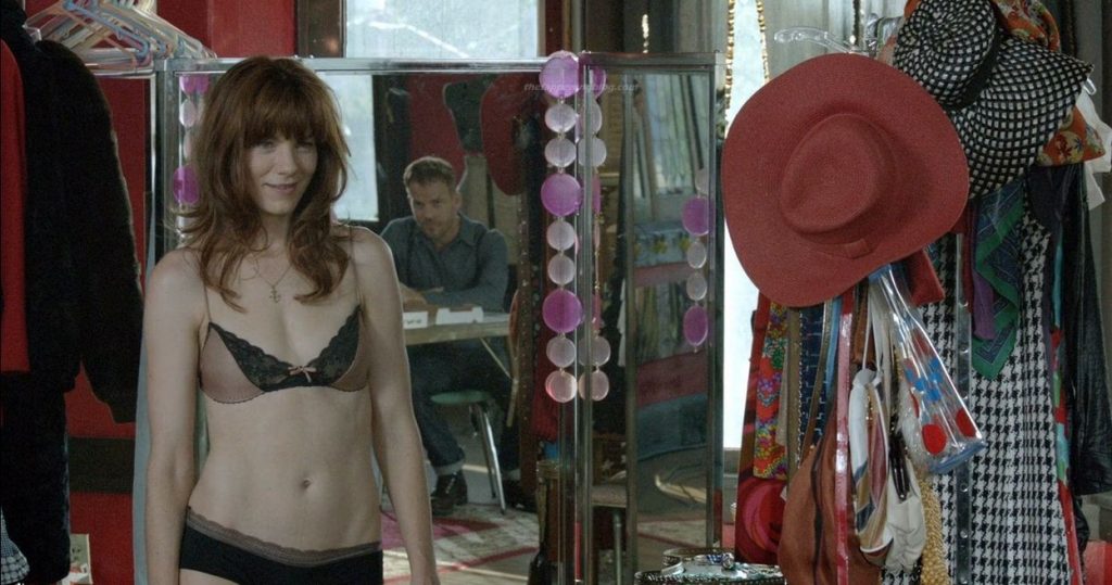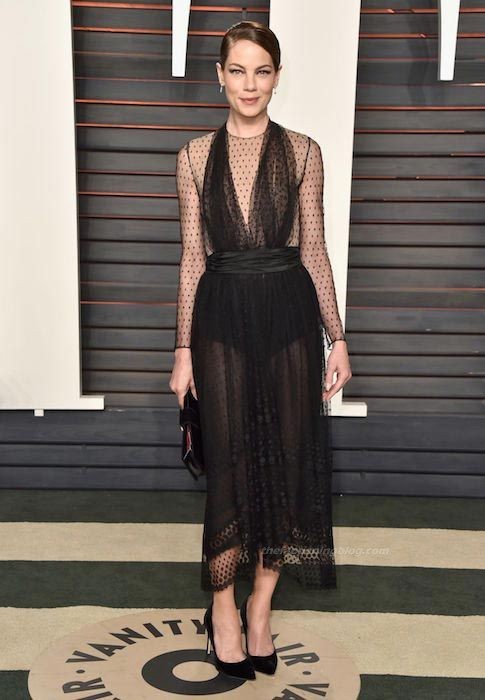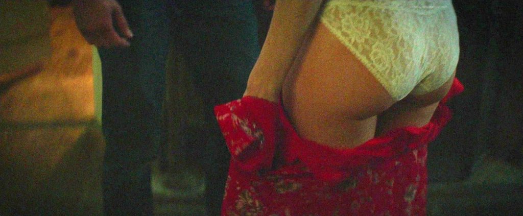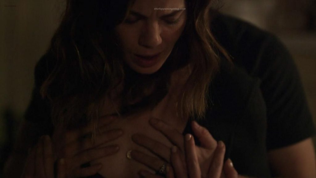 Michelle Monaghan está discutindo com um homem usando um vestido decotado que mostra um pouco do colo até que seu mamilo direito aparece pelo vestido enquanto o homem não consegue parar de olhar para isso.