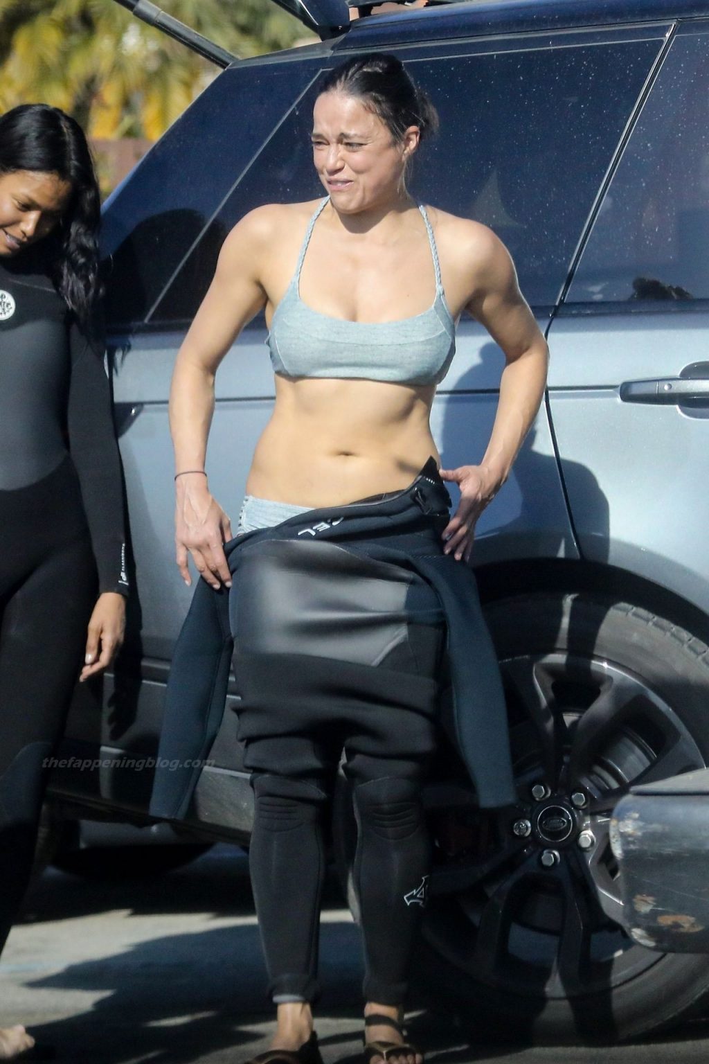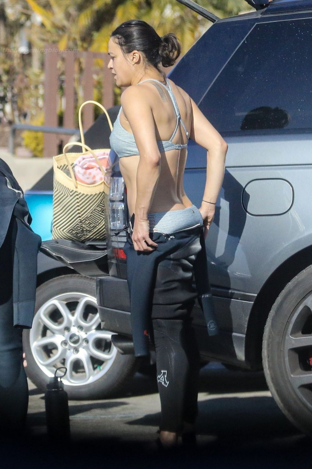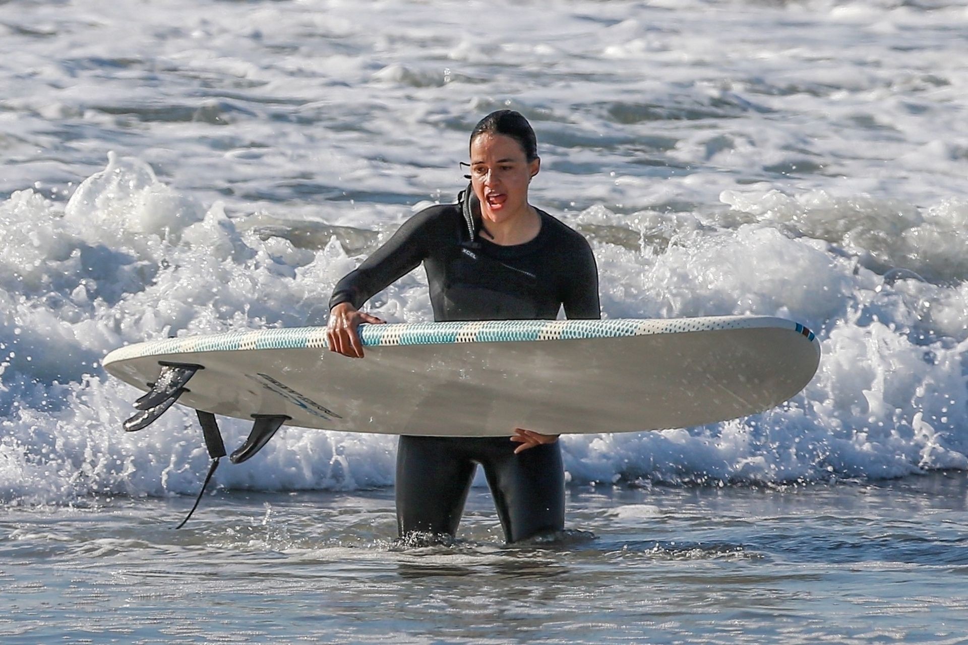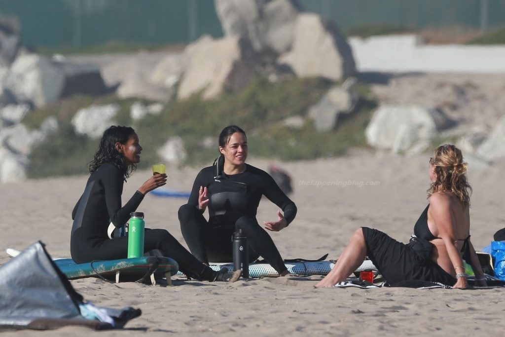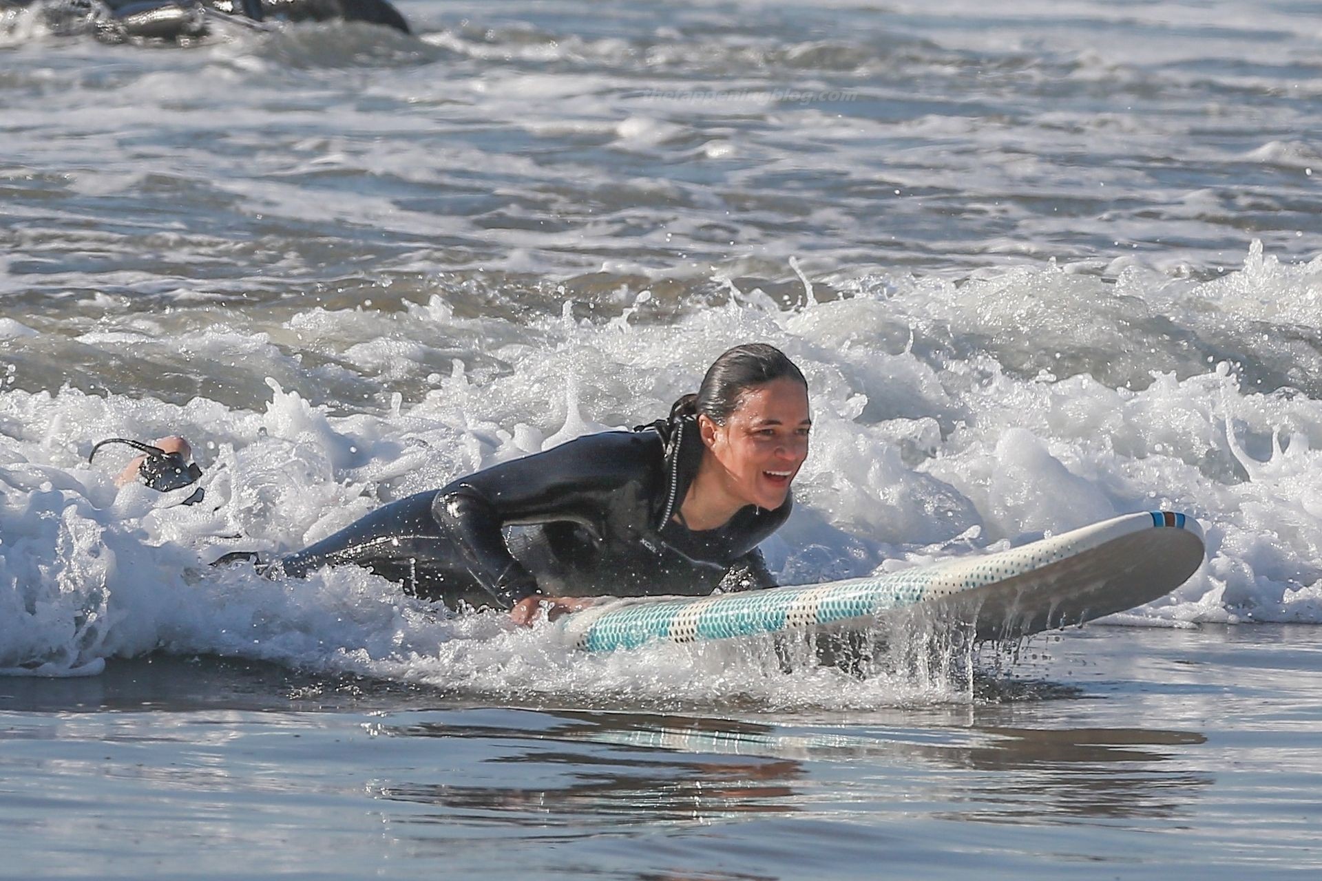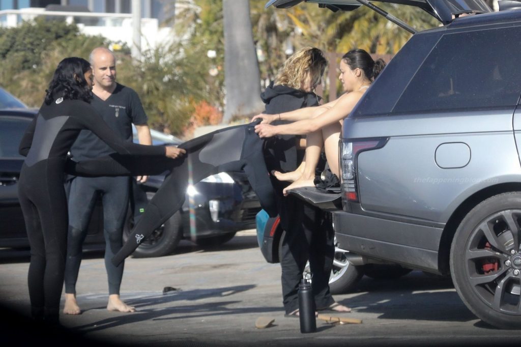 Michelle Rodriguez vai surfar com amigos em Malibu, 12/04/2020. A atriz mostra seu corpo sexy e em forma, trocando a roupa de mergulho.