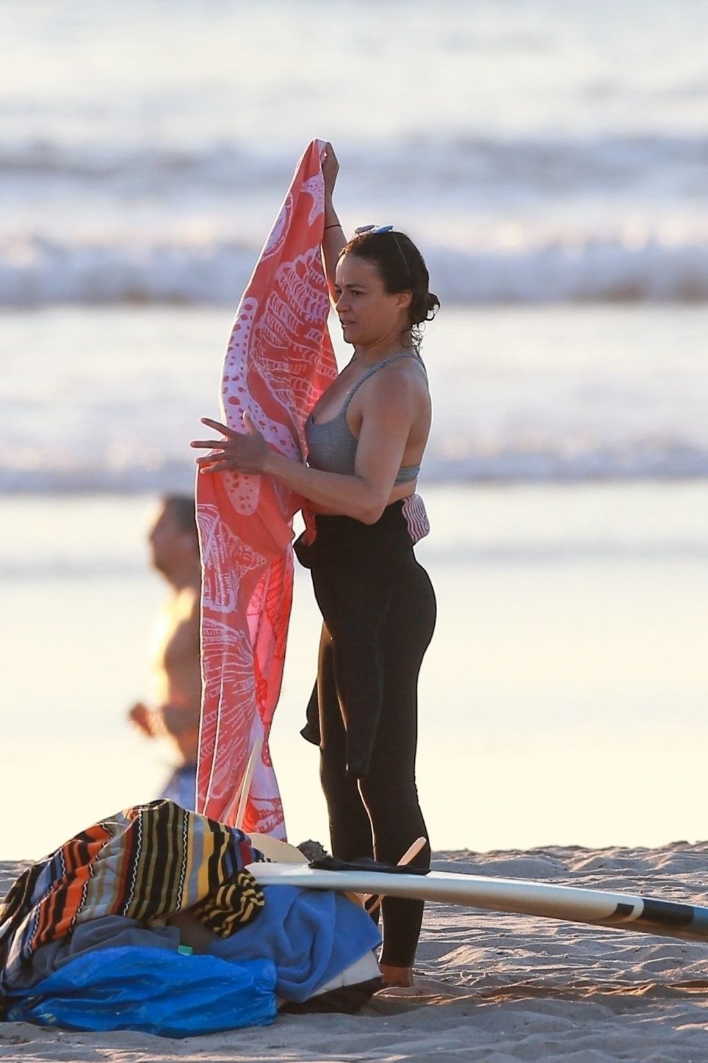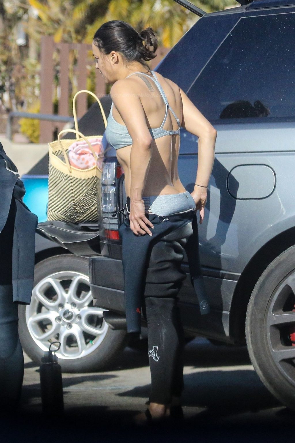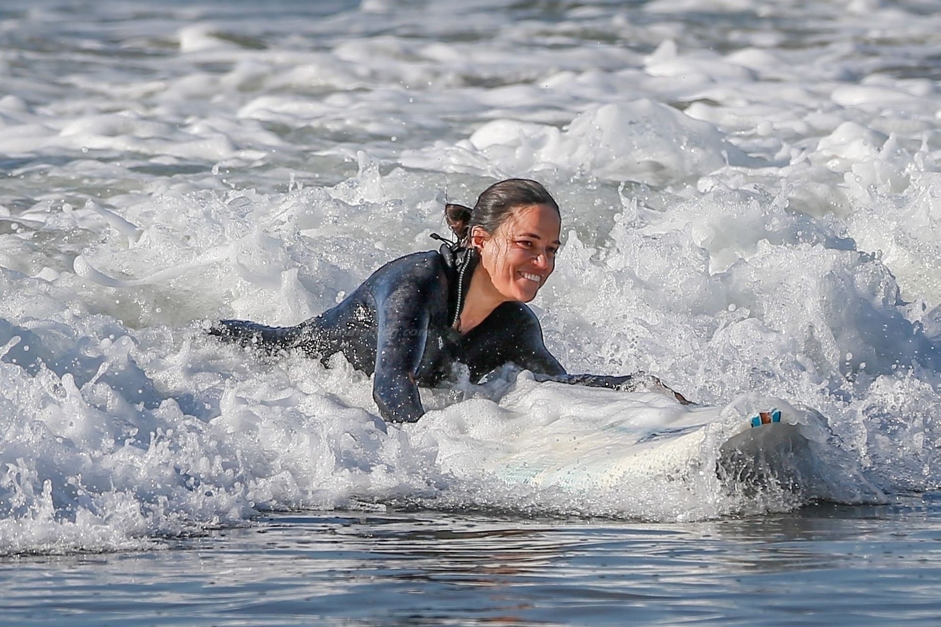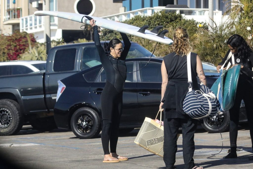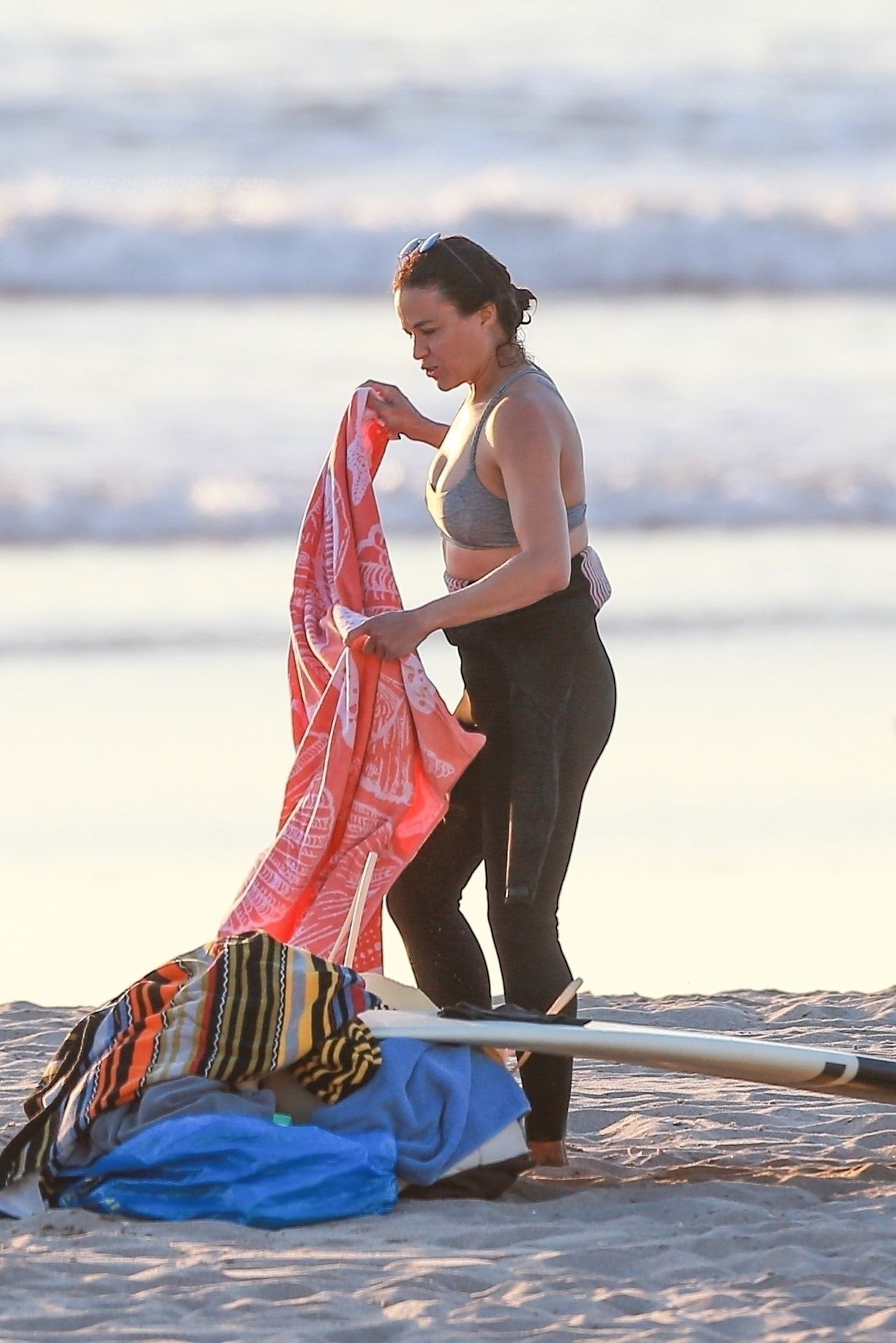 Michelle Rodriguez vai surfar com amigos em Malibu, 12/04/2020. A atriz mostra seu corpo sexy e em forma, trocando a roupa de mergulho.