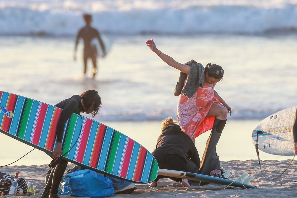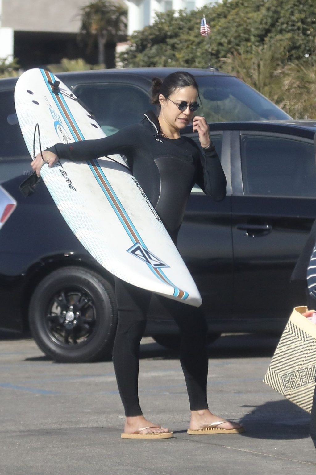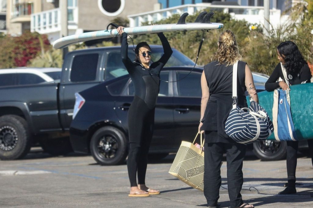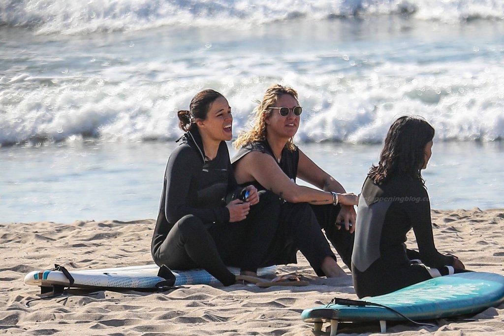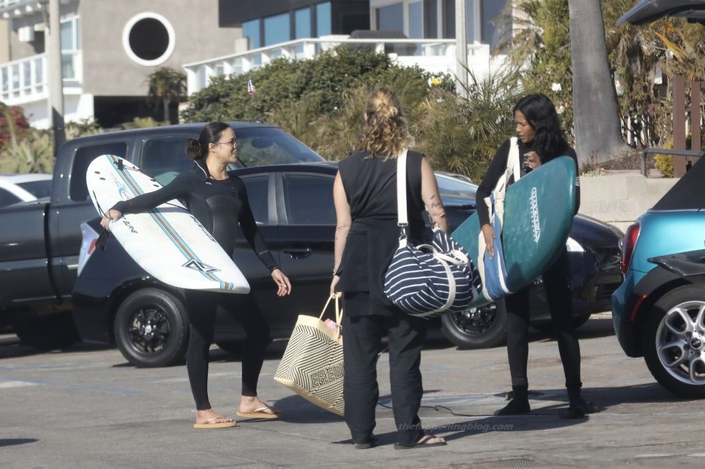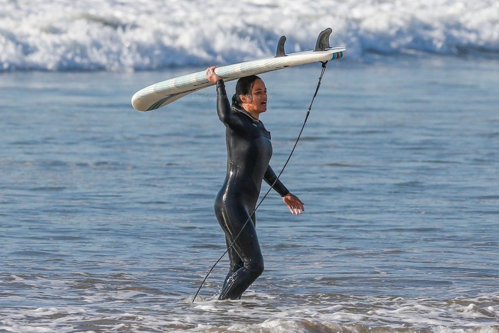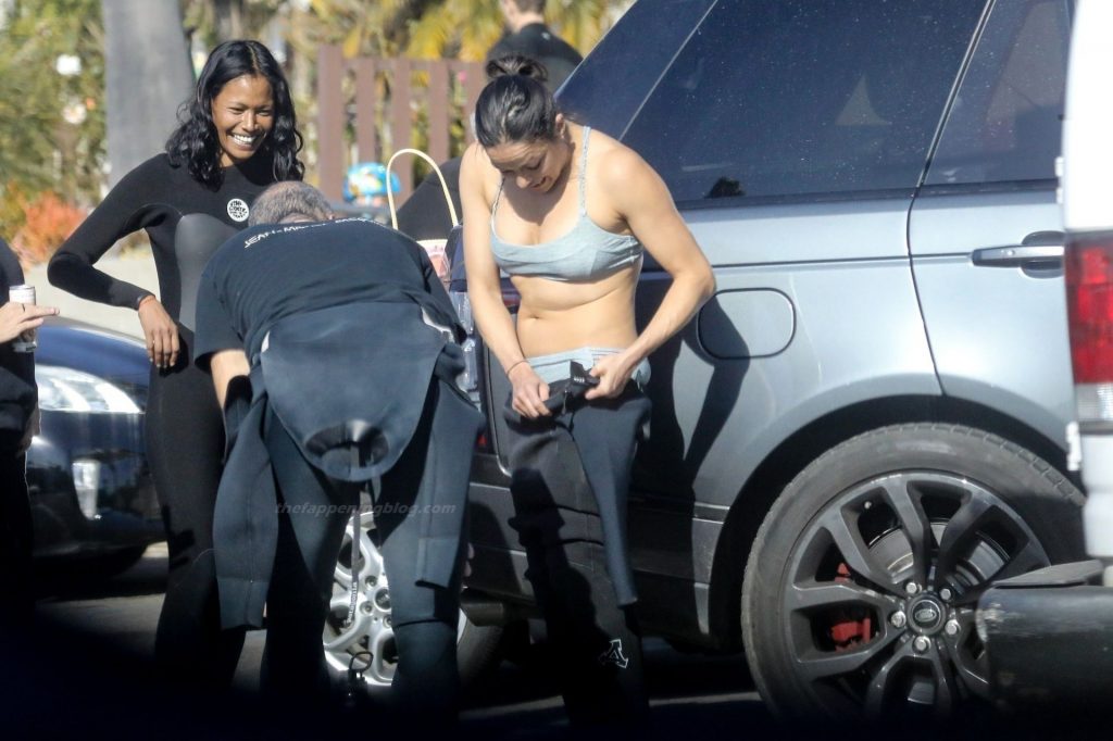 Michelle Rodriguez vai surfar com amigos em Malibu, 12/04/2020. A atriz mostra seu corpo sexy e em forma, trocando a roupa de mergulho.