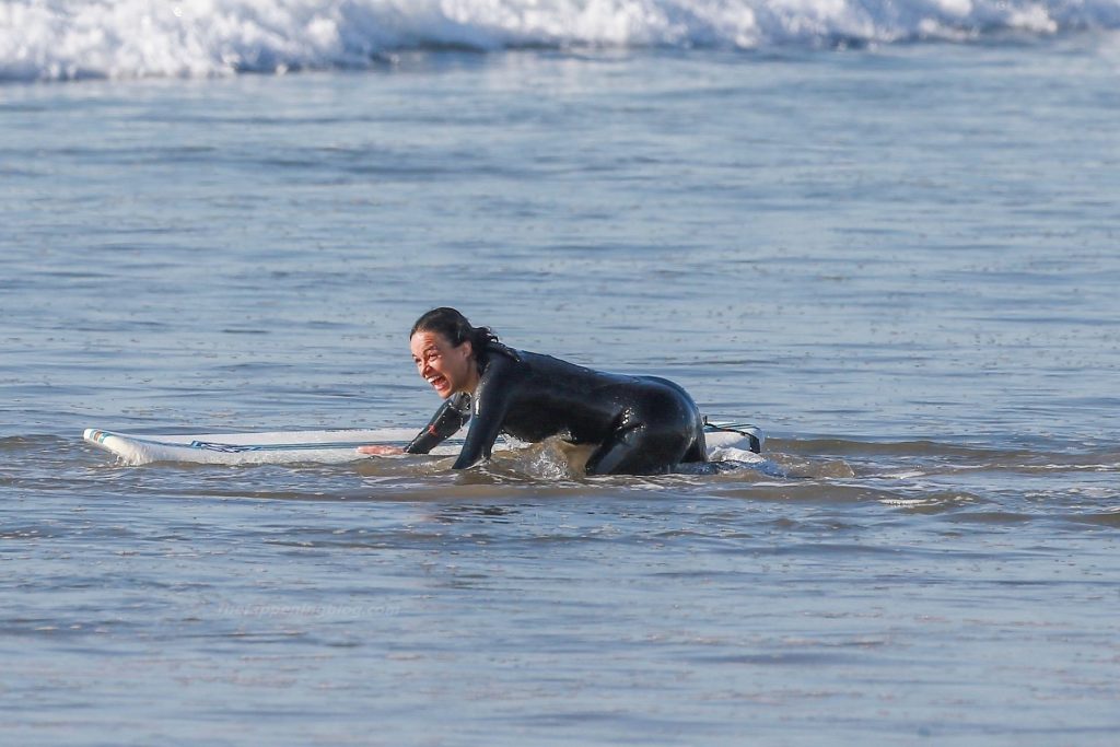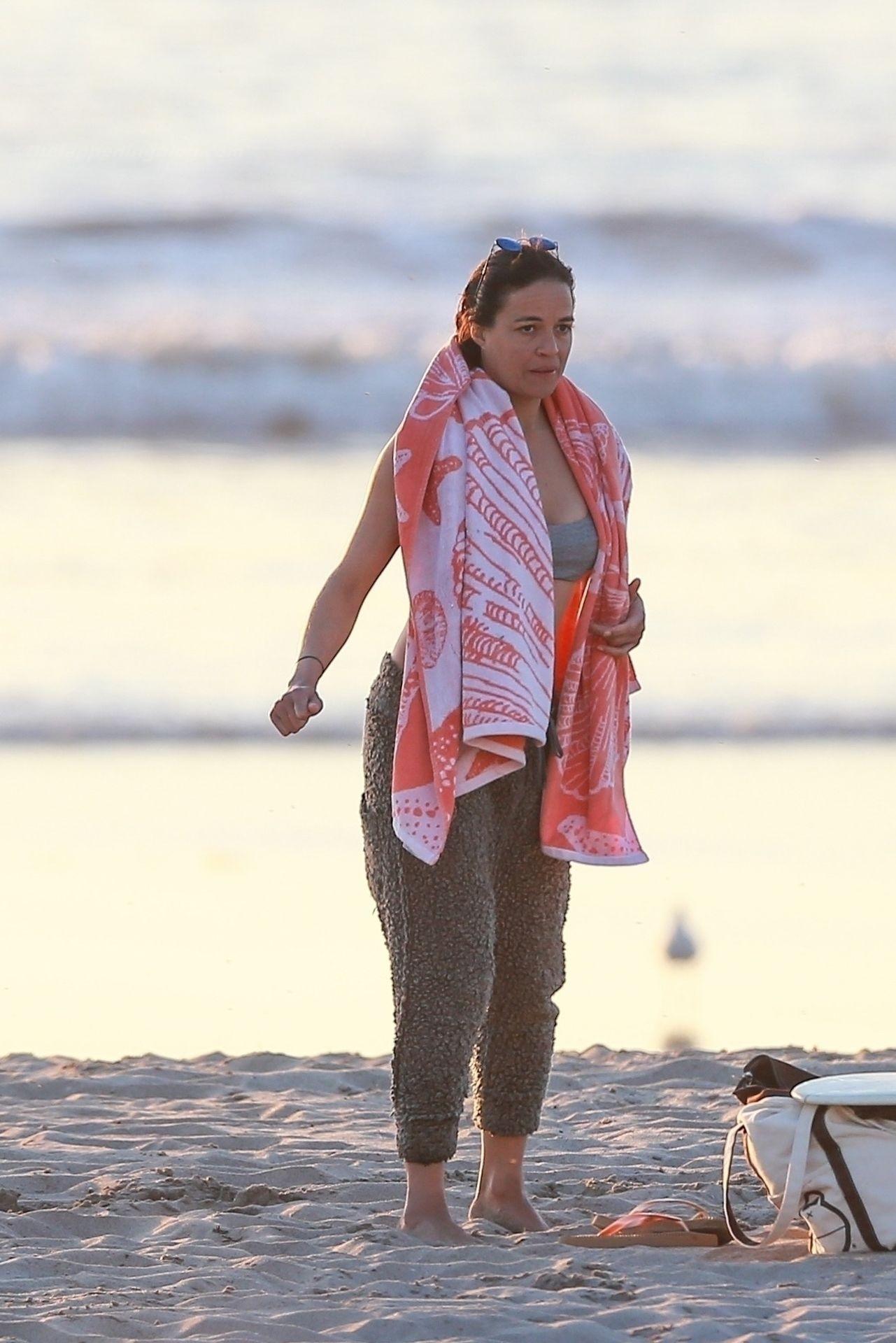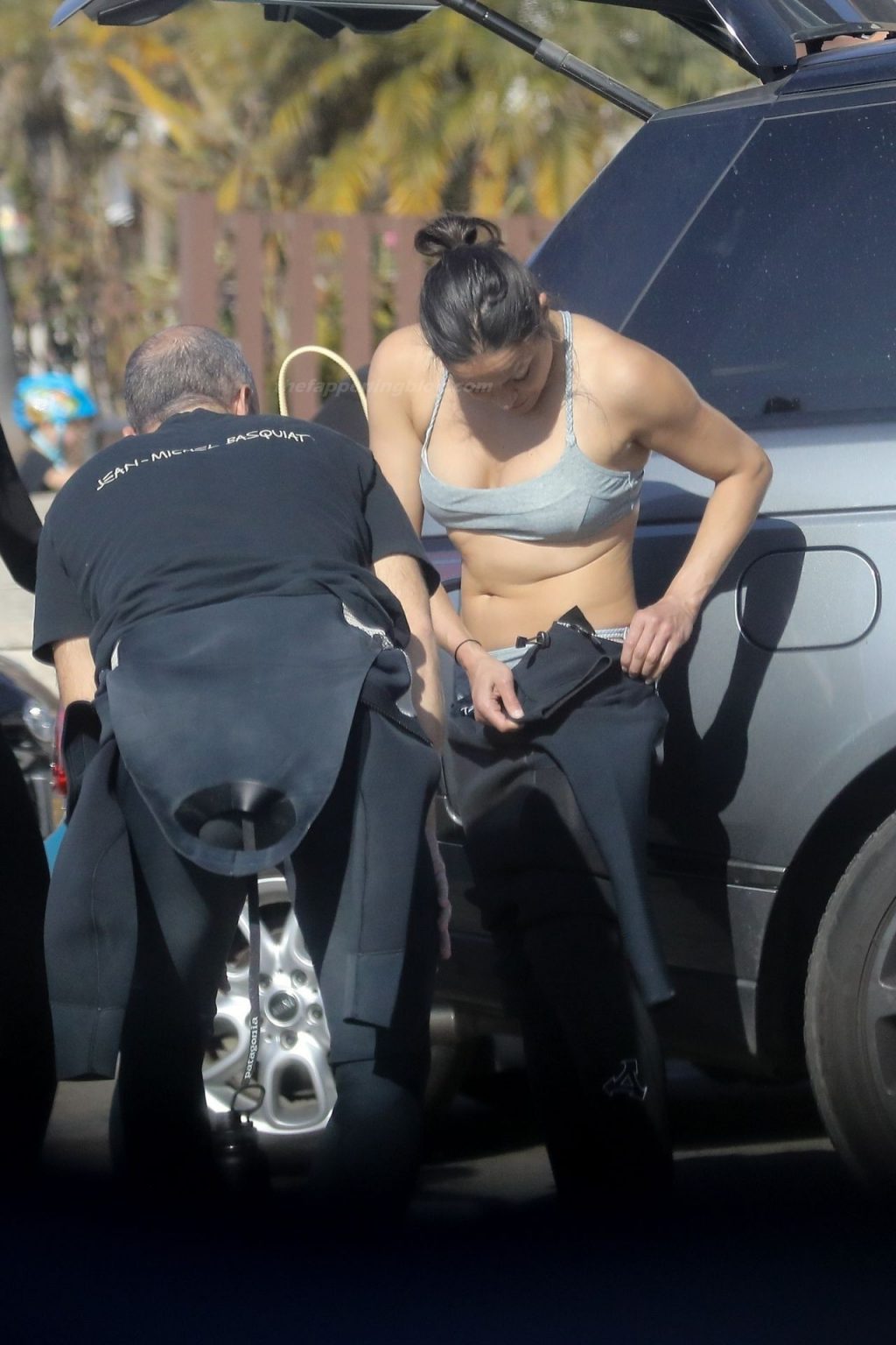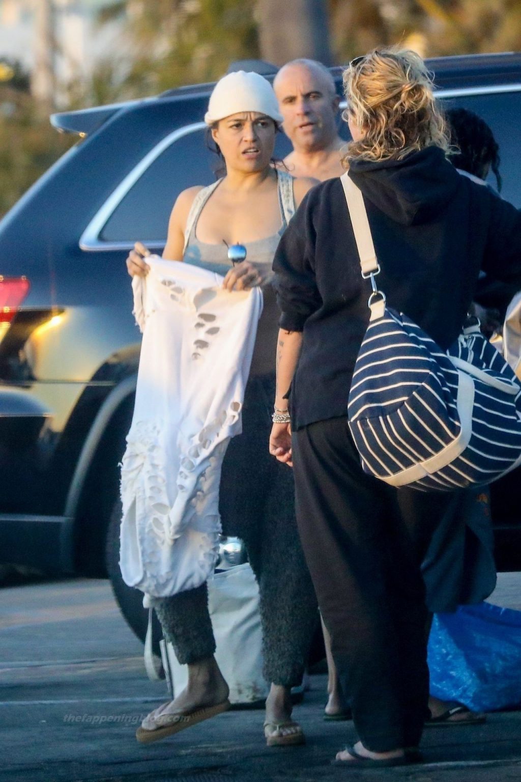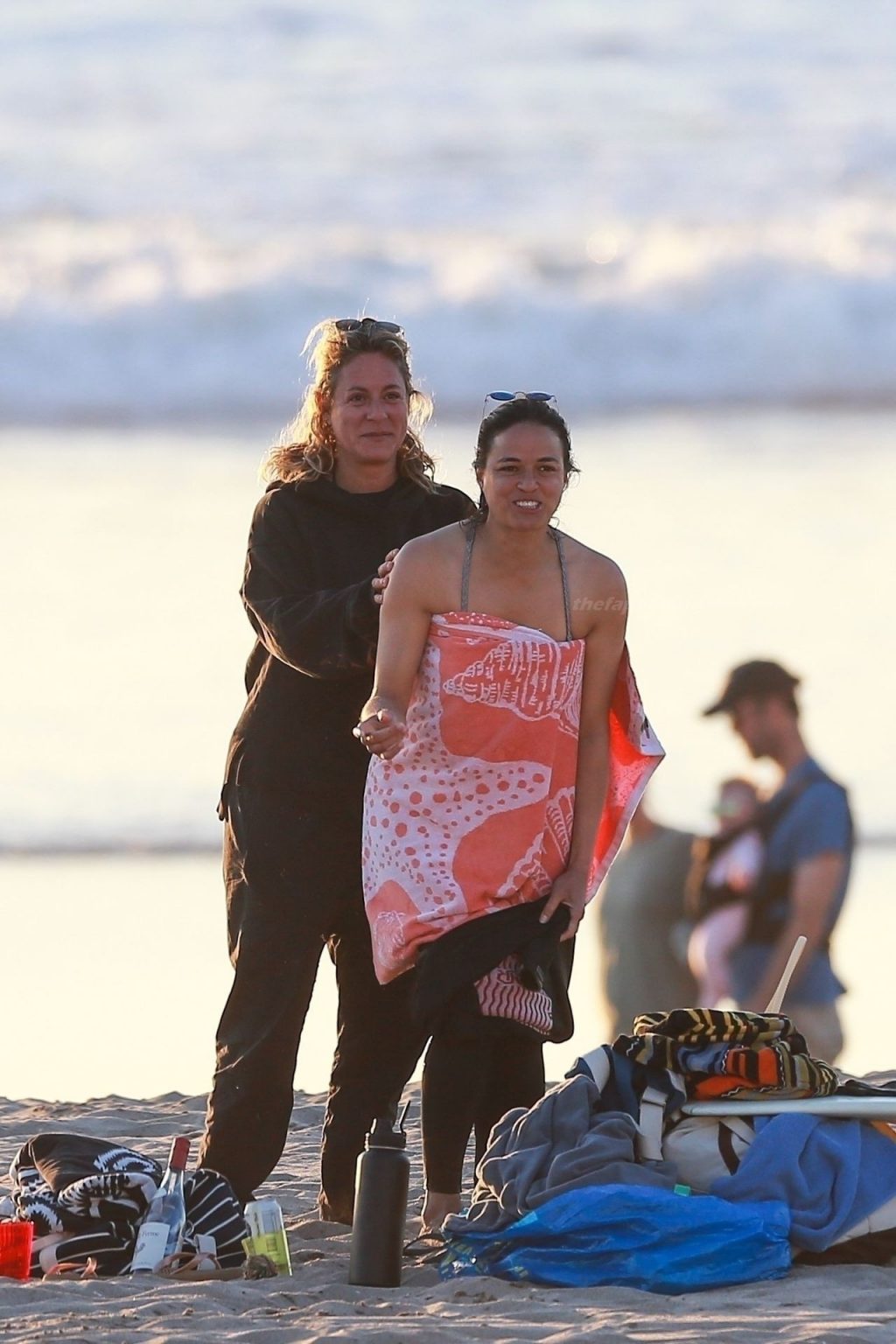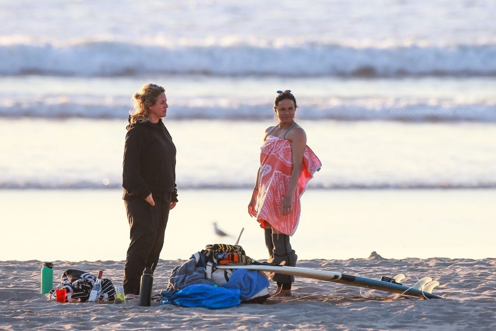 Michelle Rodriguez vai surfar com amigos em Malibu, 12/04/2020. A atriz mostra seu corpo sexy e em forma, trocando a roupa de mergulho.
