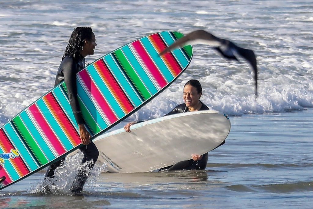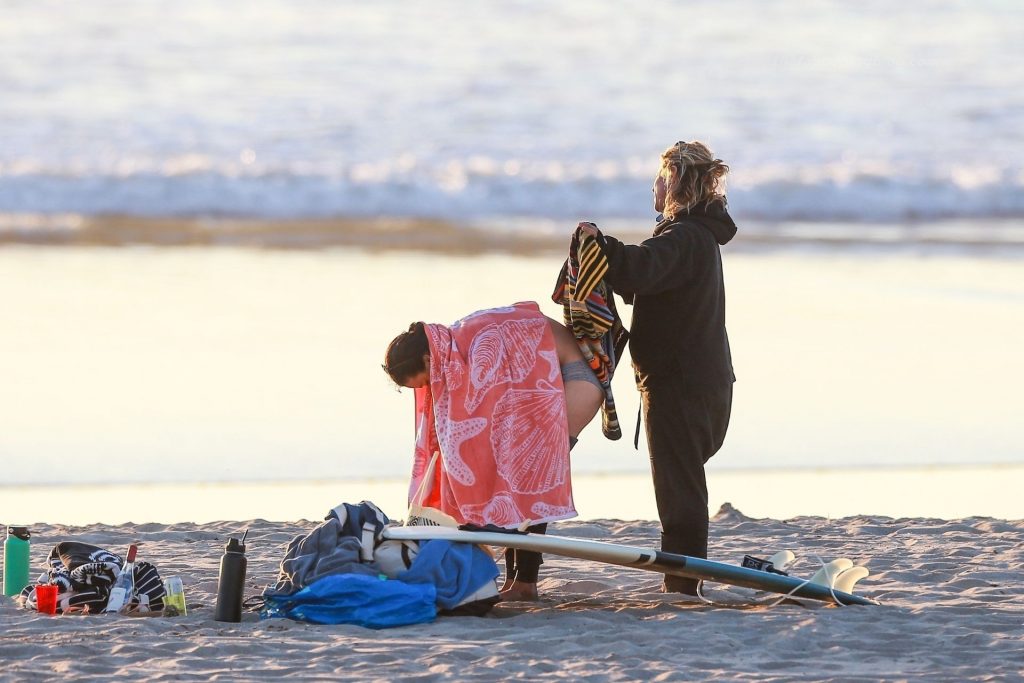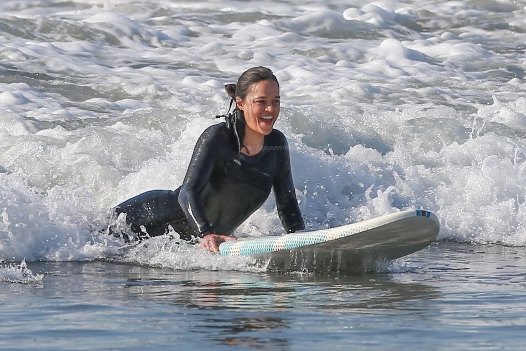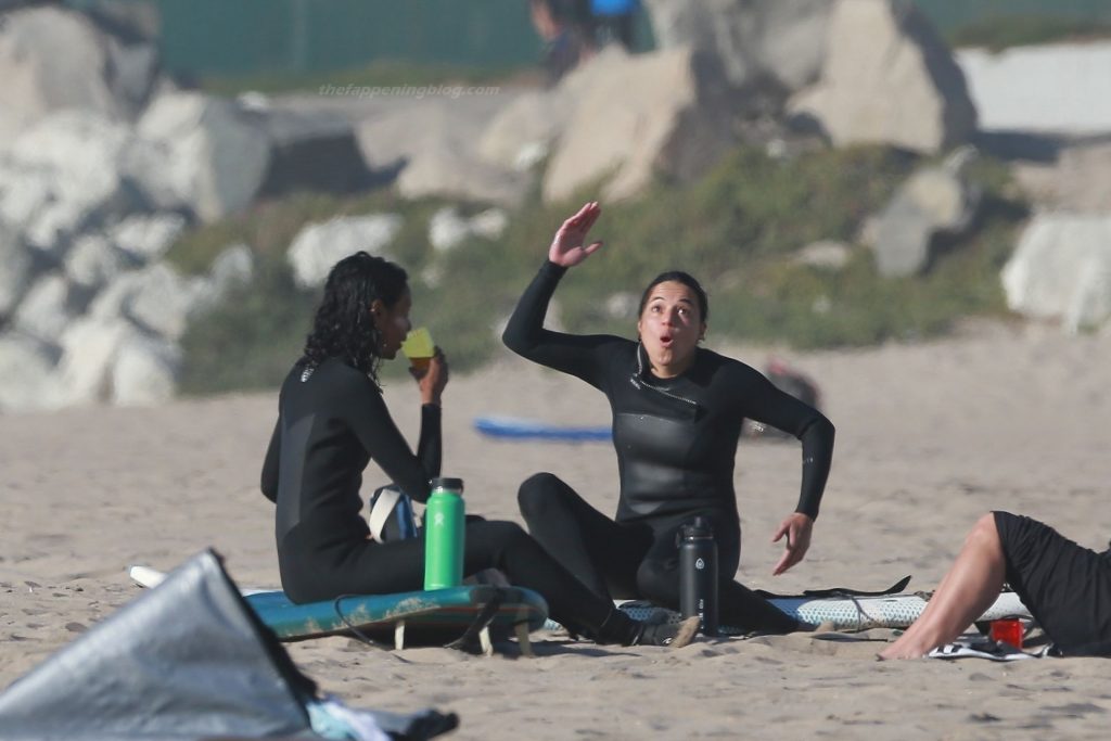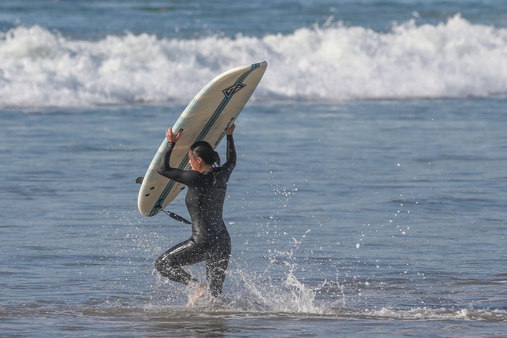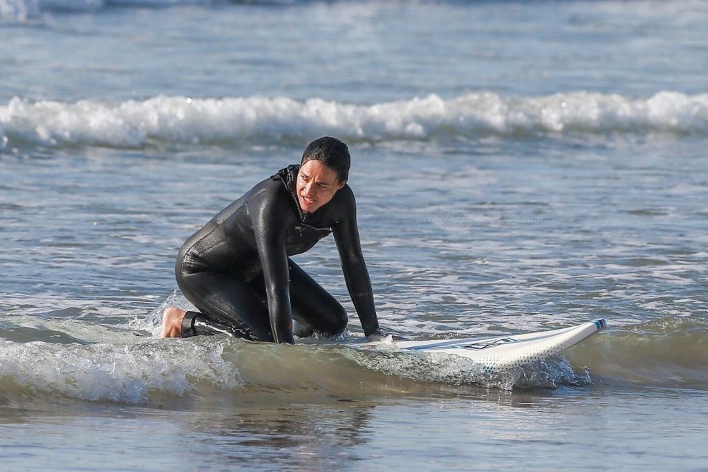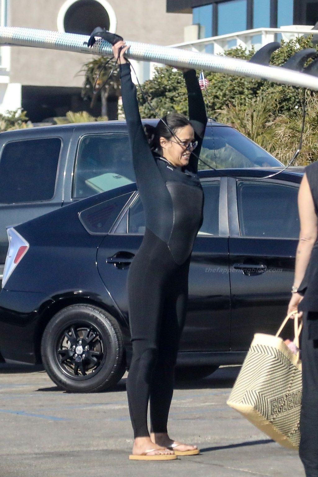 Michelle Rodriguez vai surfar com amigos em Malibu, 12/04/2020. A atriz mostra seu corpo sexy e em forma, trocando a roupa de mergulho.