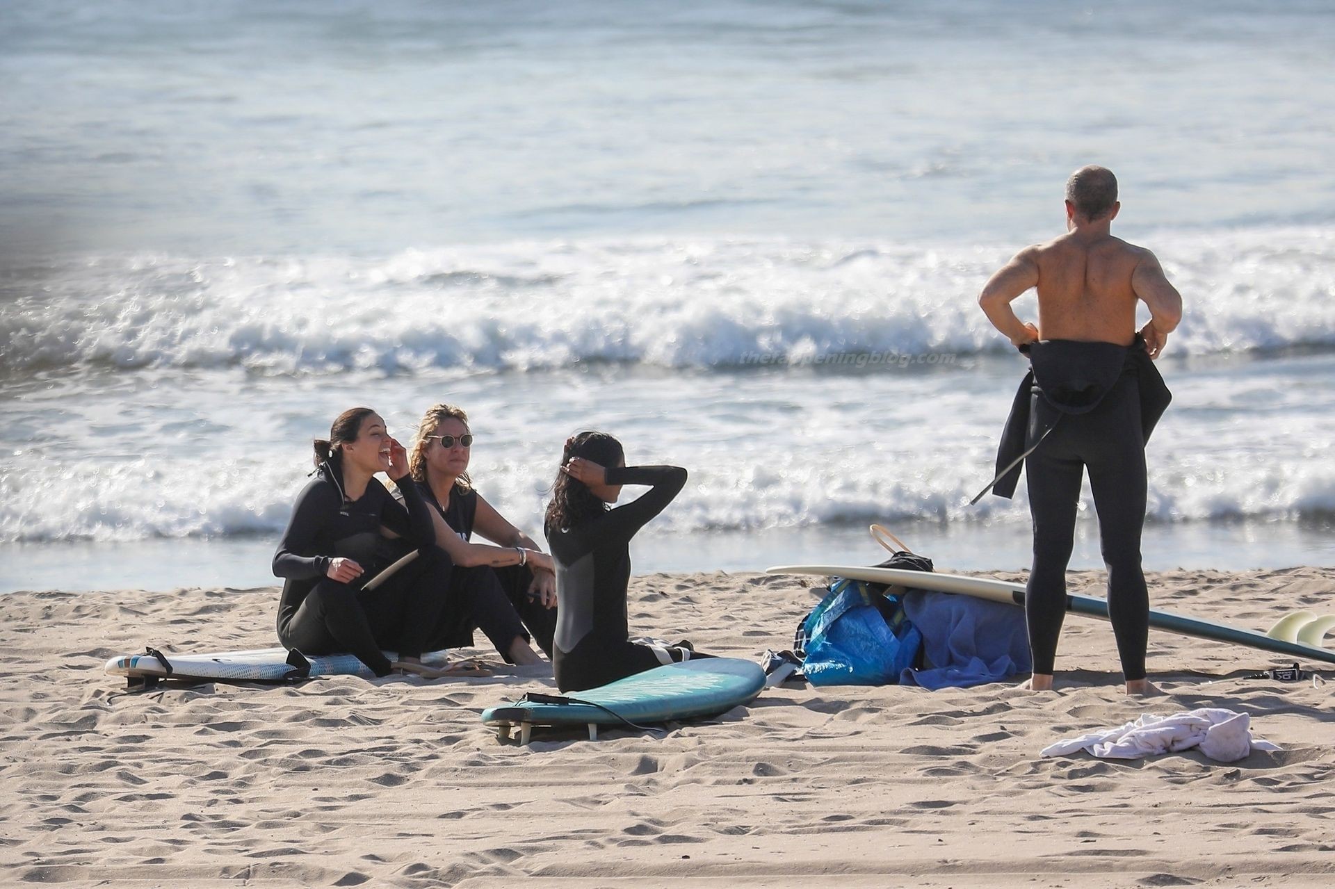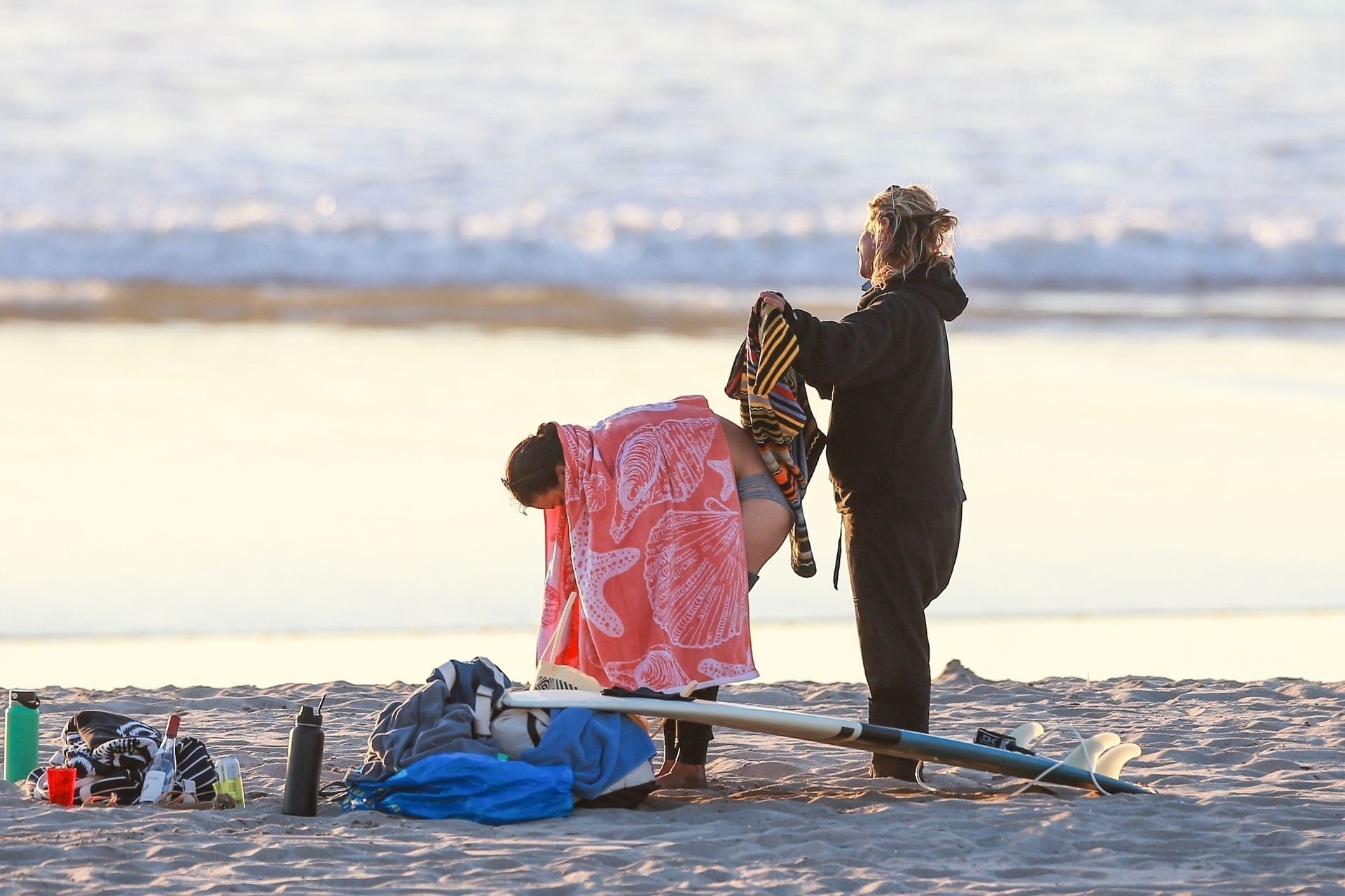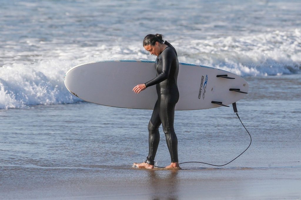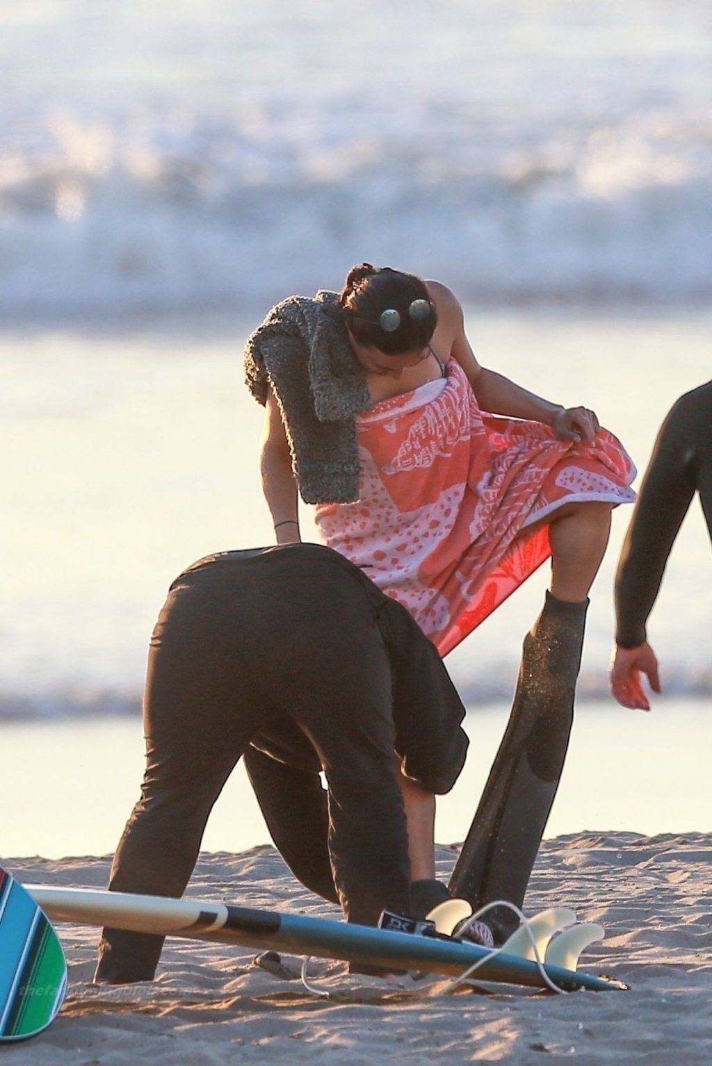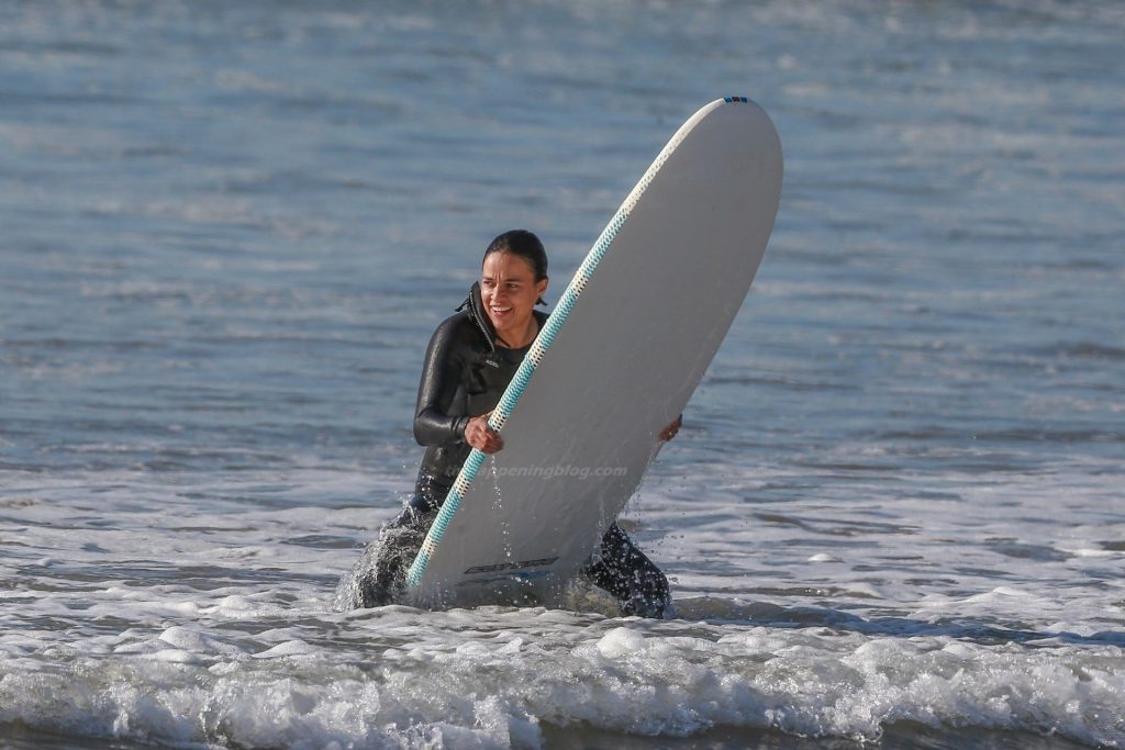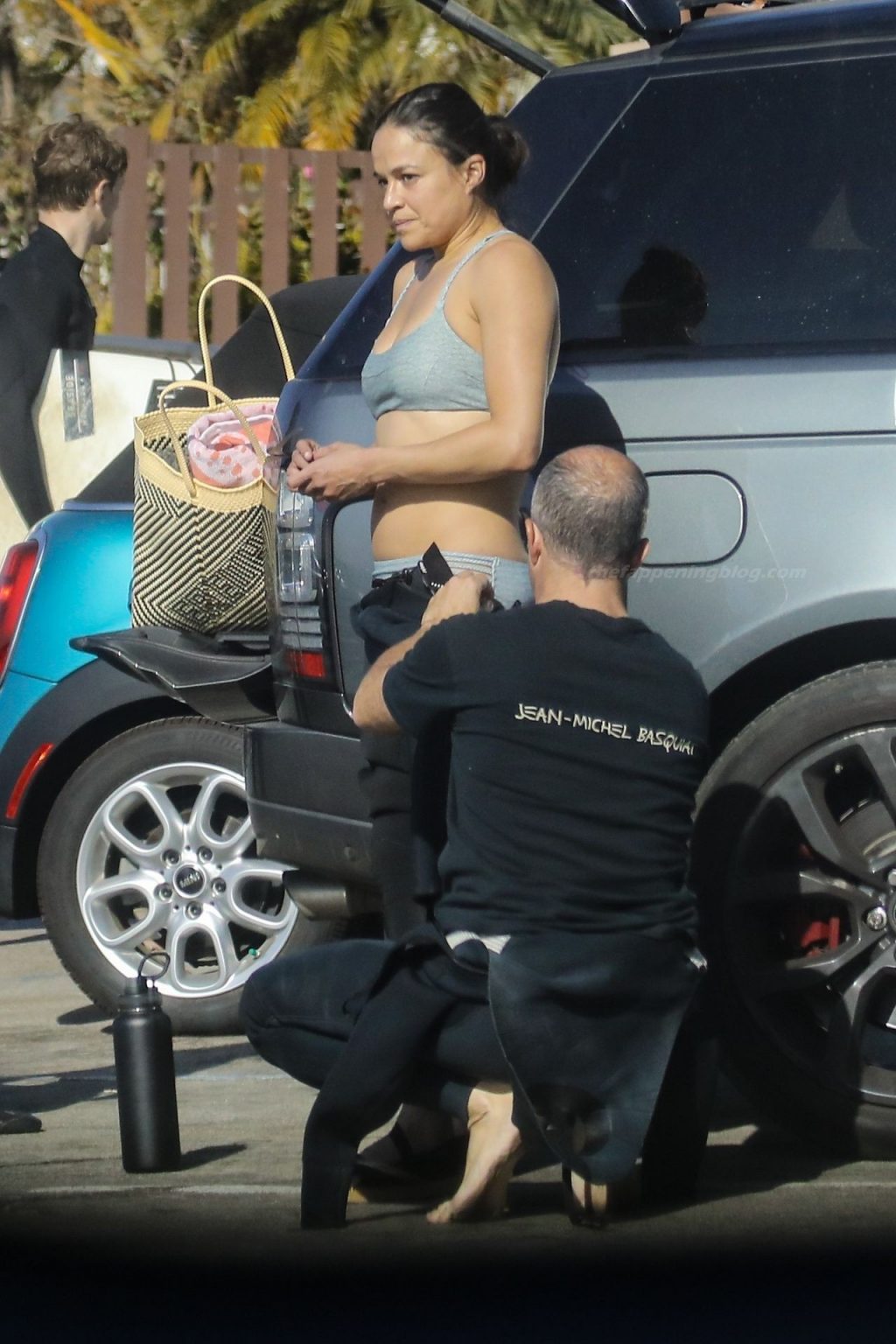 Michelle Rodriguez vai surfar com amigos em Malibu, 12/04/2020. A atriz mostra seu corpo sexy e em forma, trocando a roupa de mergulho.