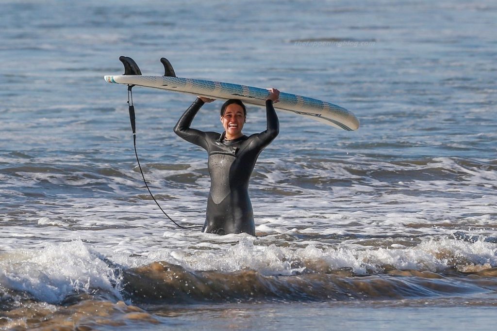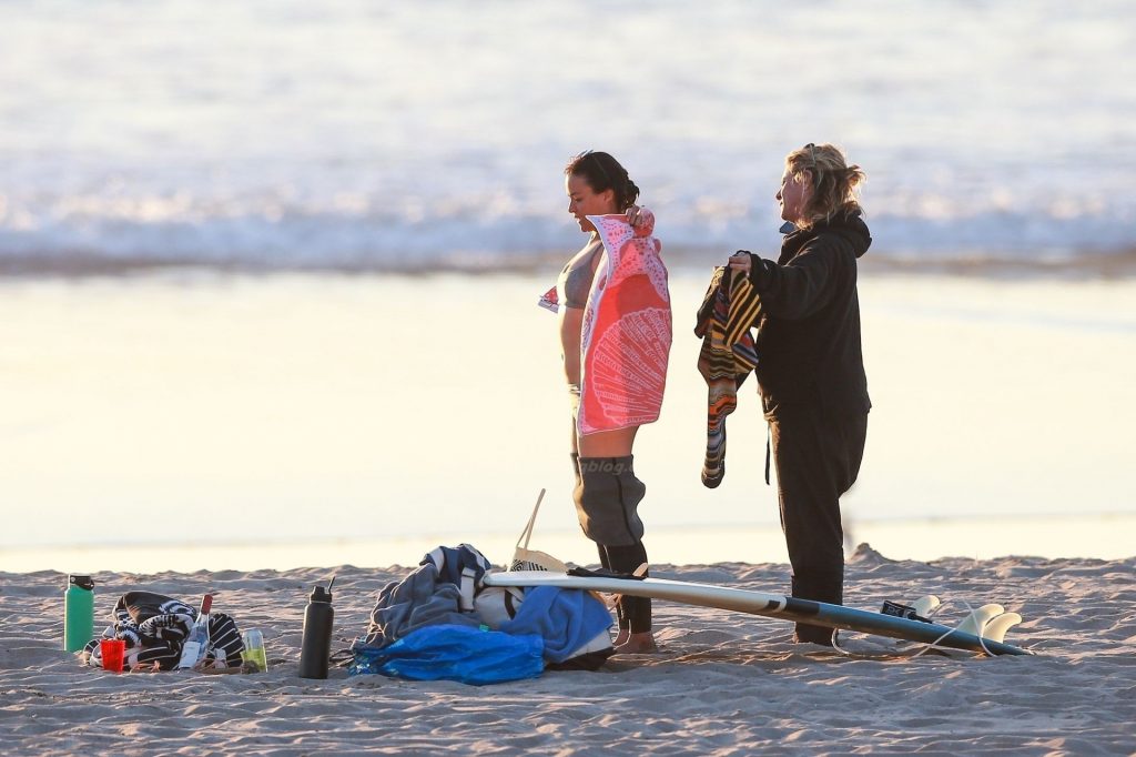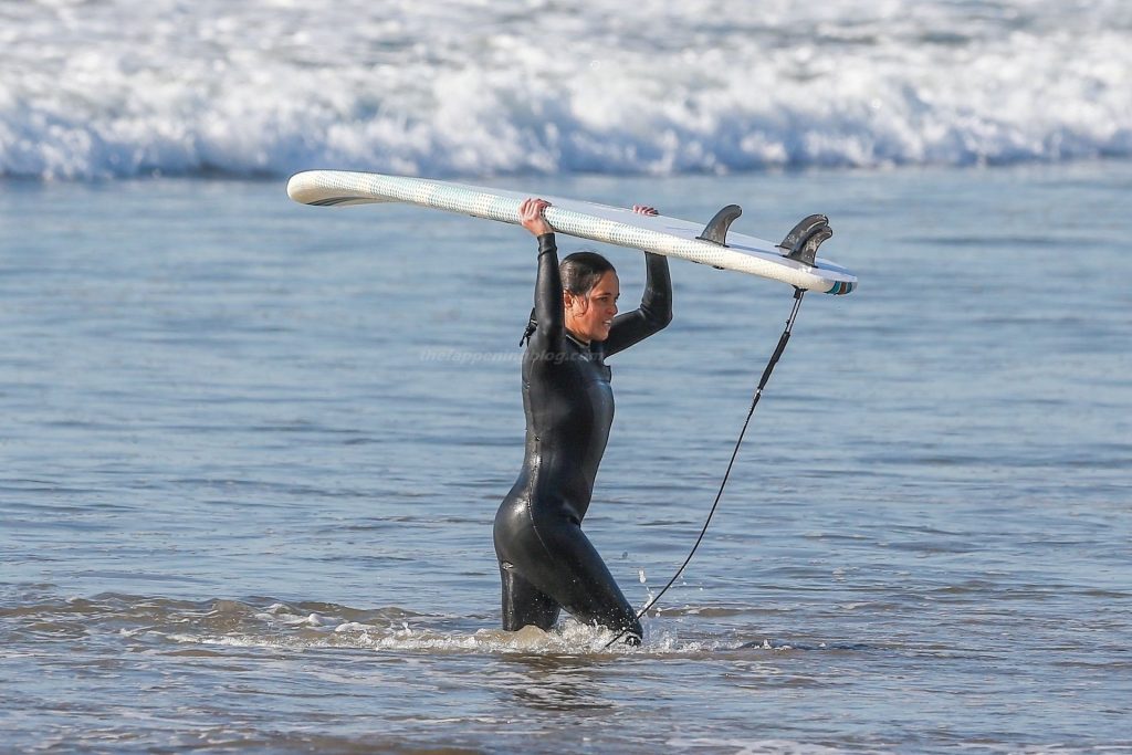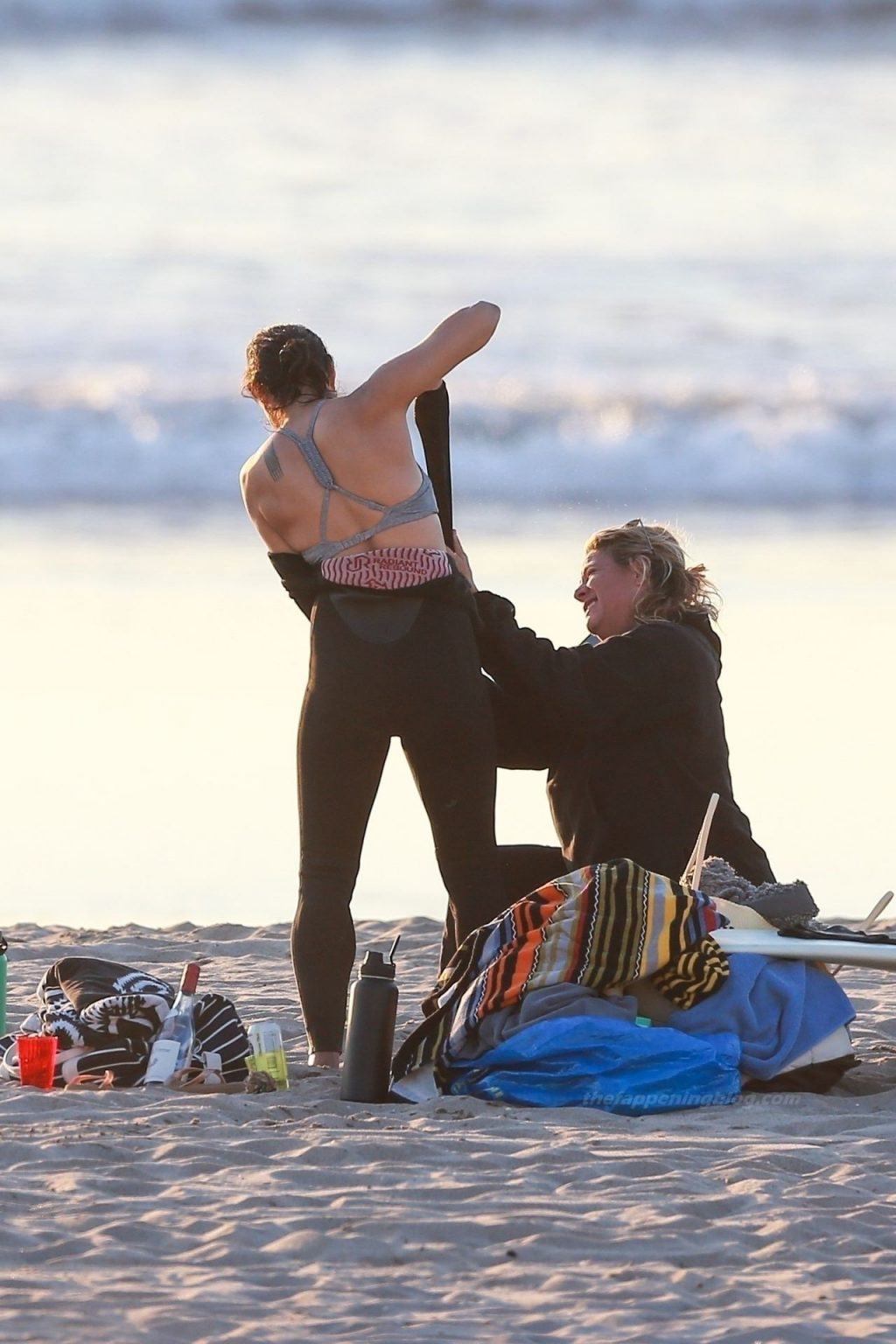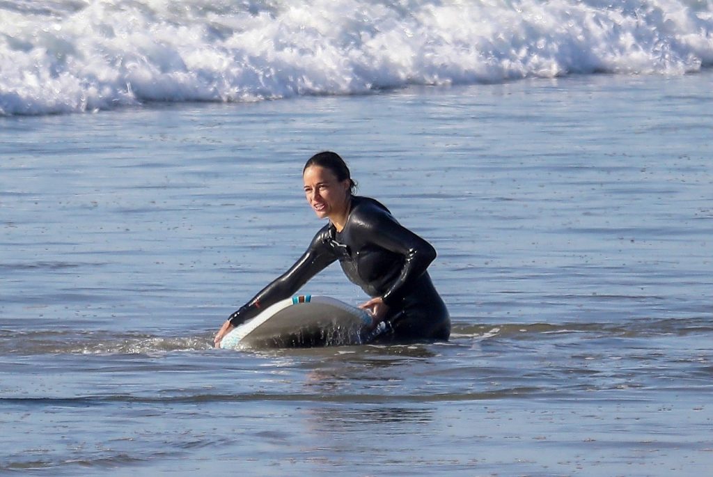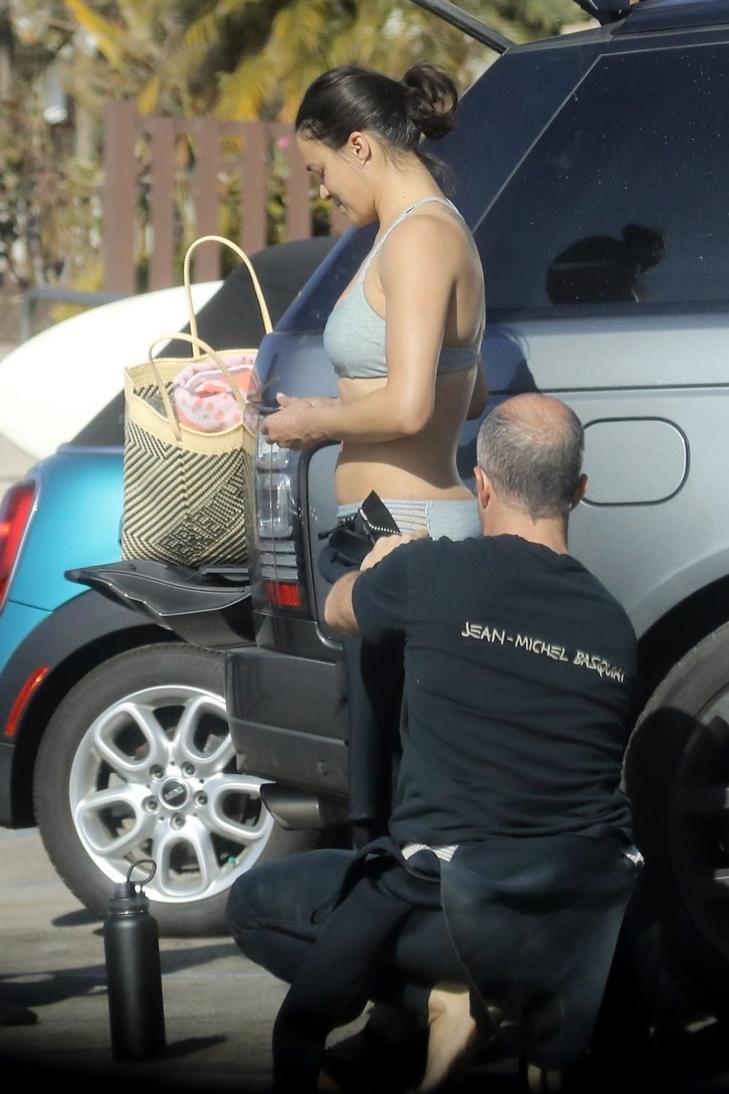 Michelle Rodriguez vai surfar com amigos em Malibu, 12/04/2020. A atriz mostra seu corpo sexy e em forma, trocando a roupa de mergulho.