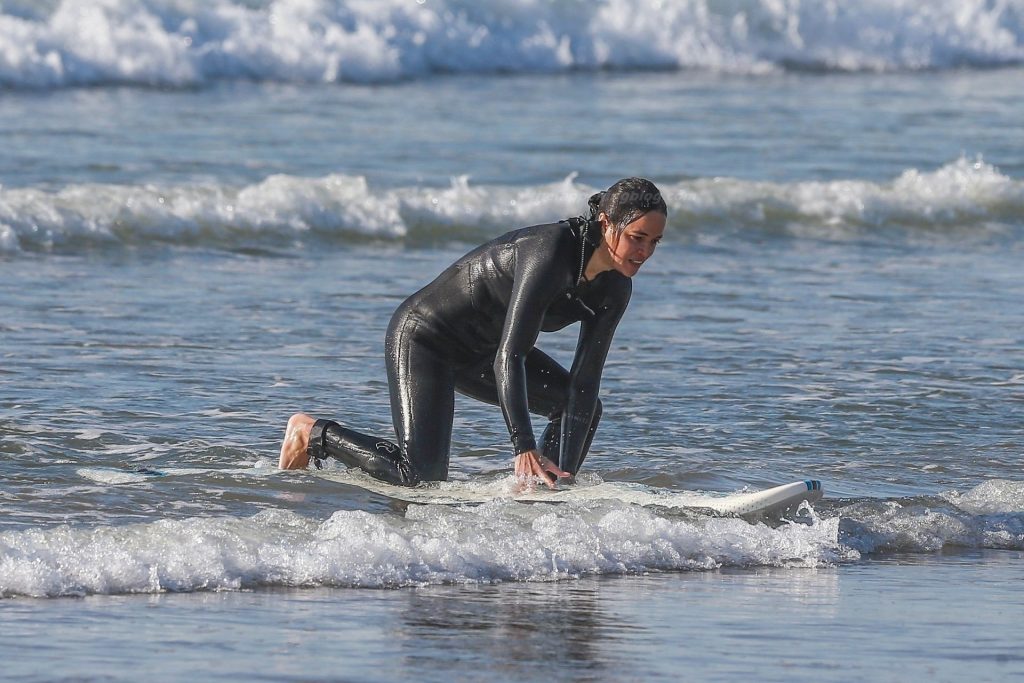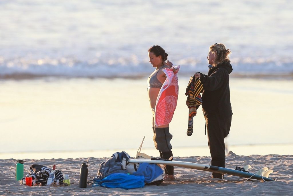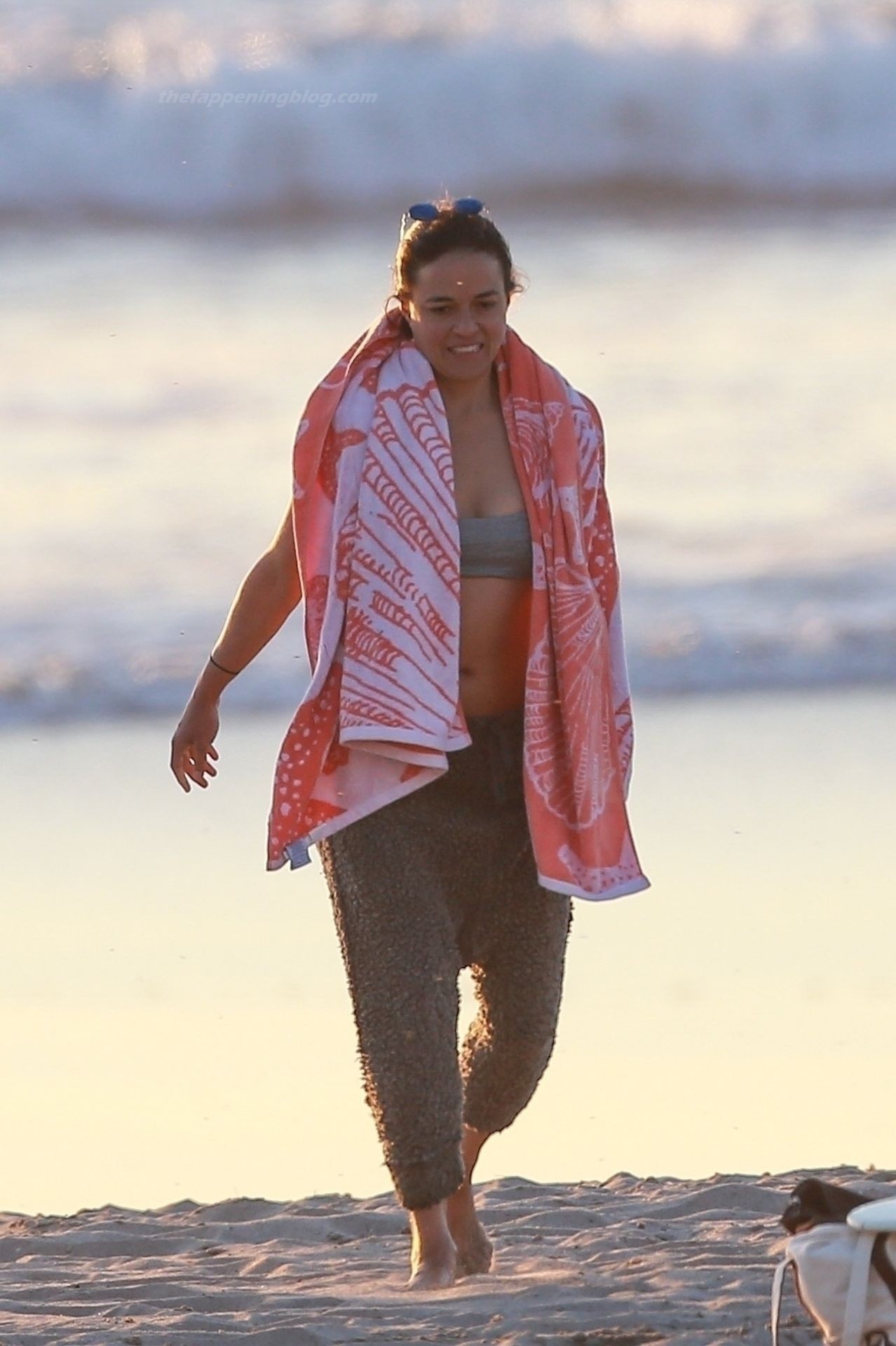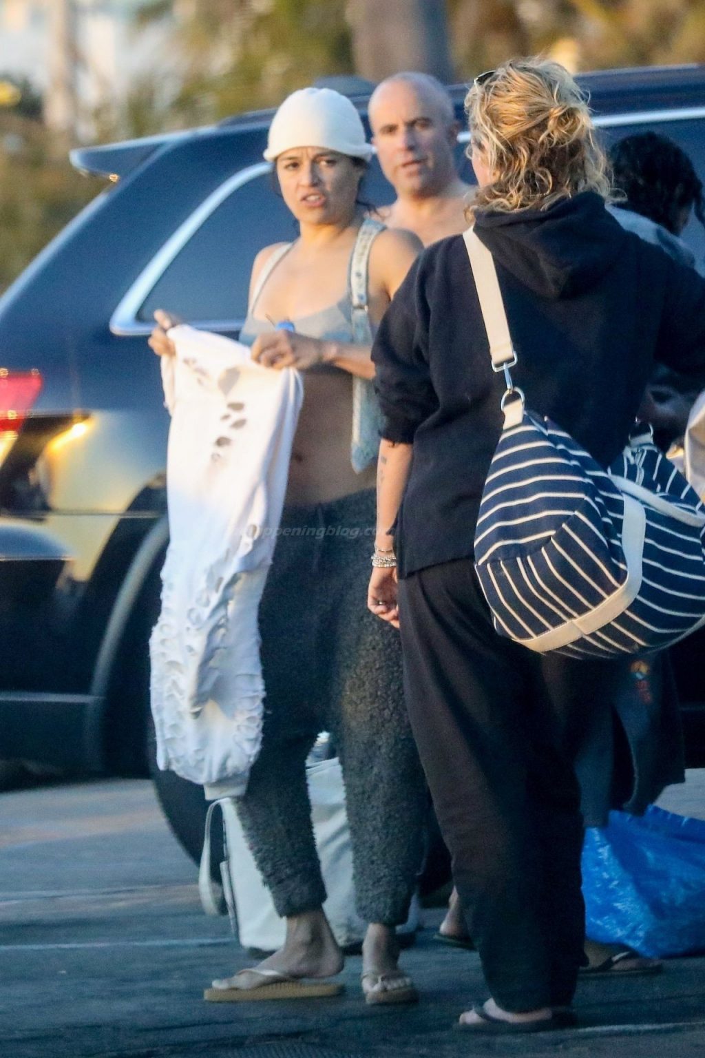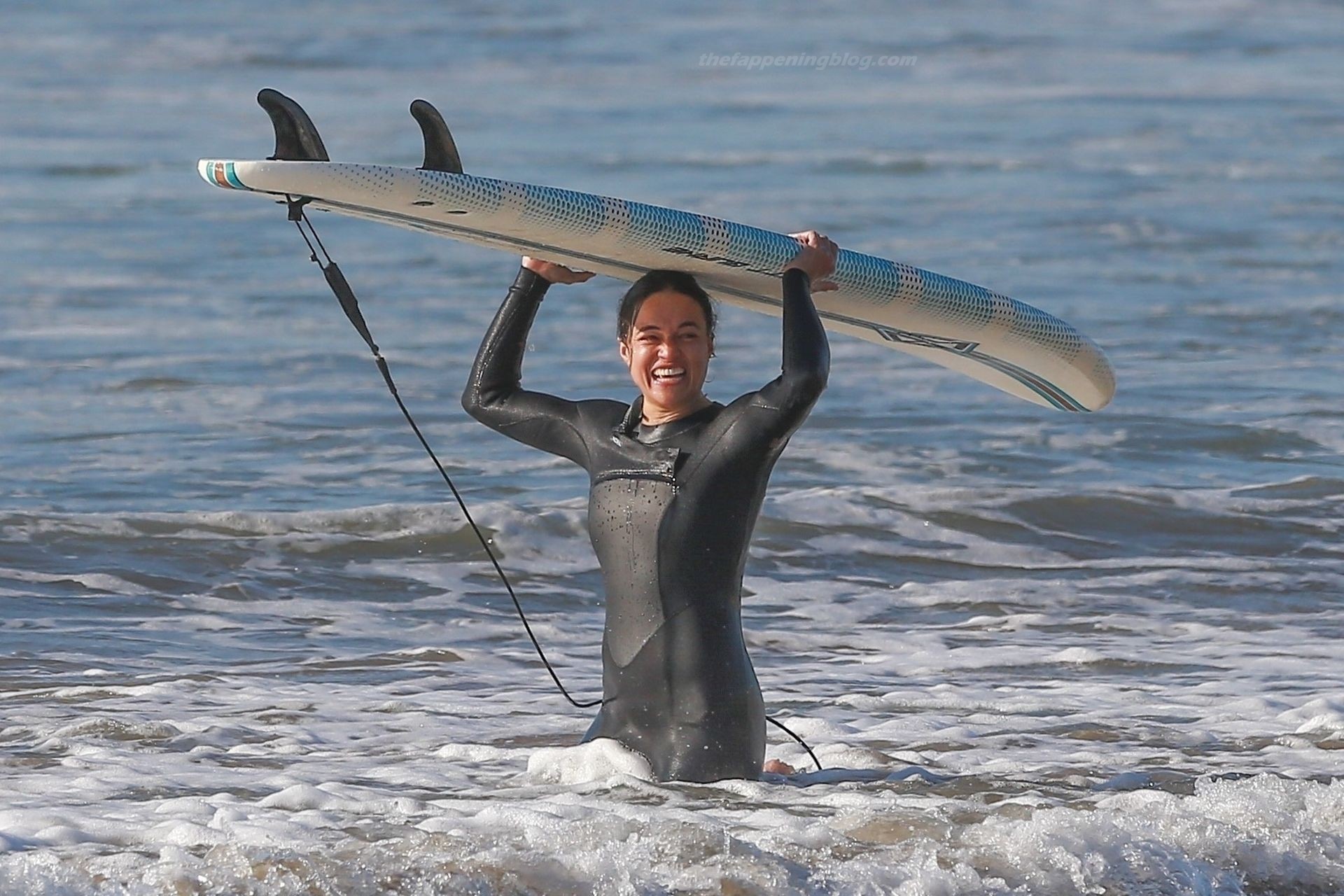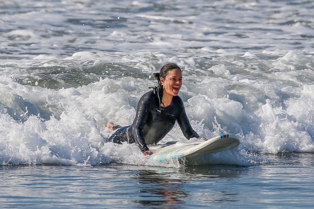 Michelle Rodriguez vai surfar com amigos em Malibu, 12/04/2020. A atriz mostra seu corpo sexy e em forma, trocando a roupa de mergulho.