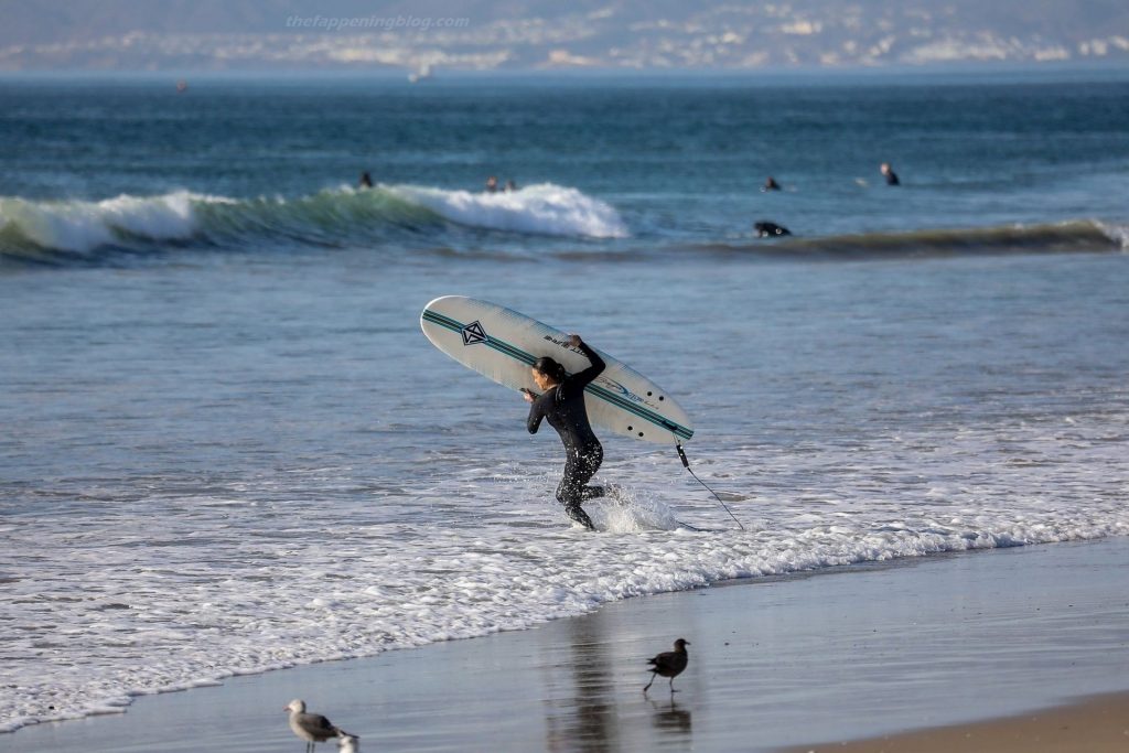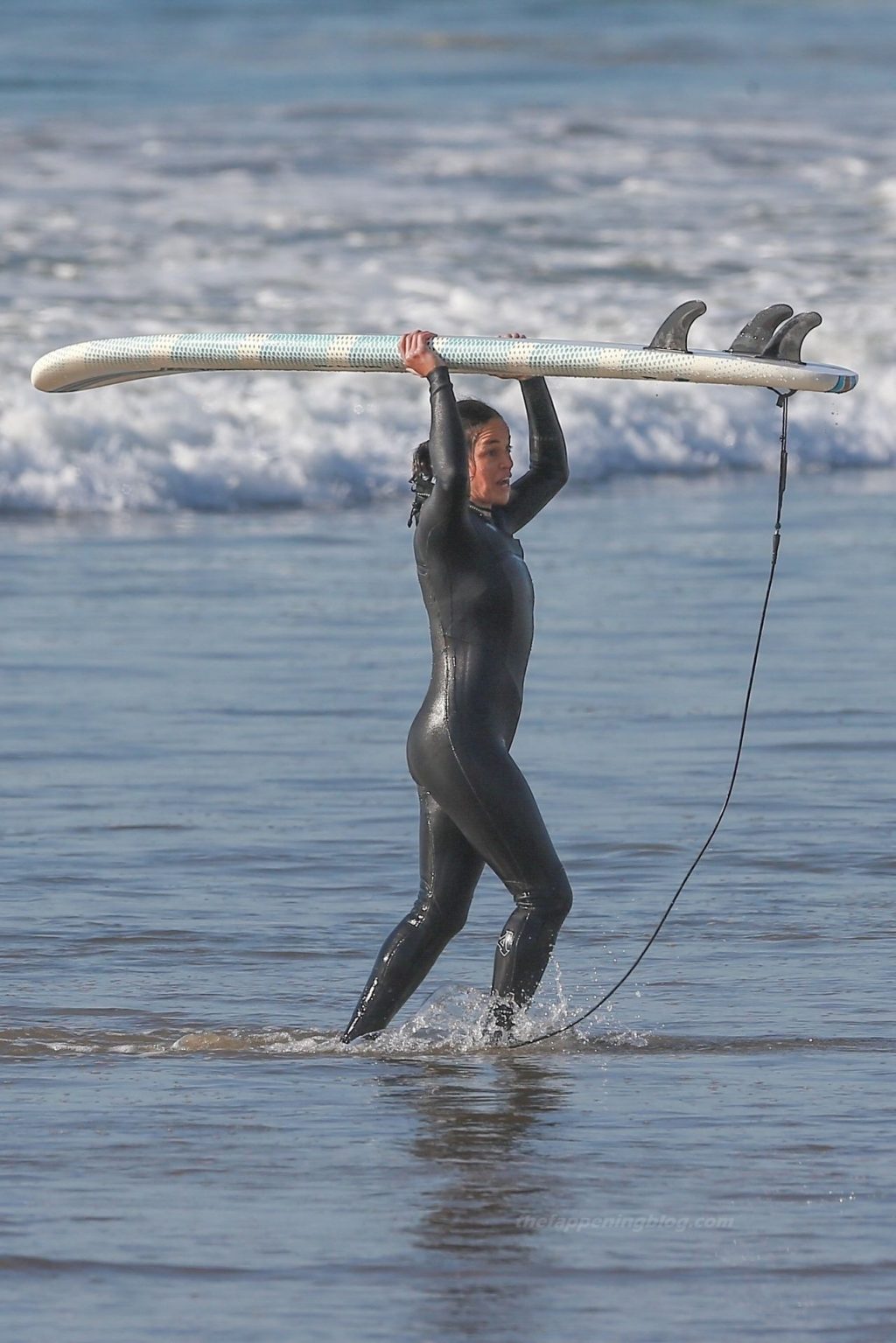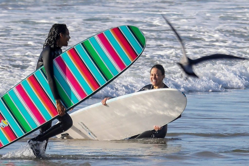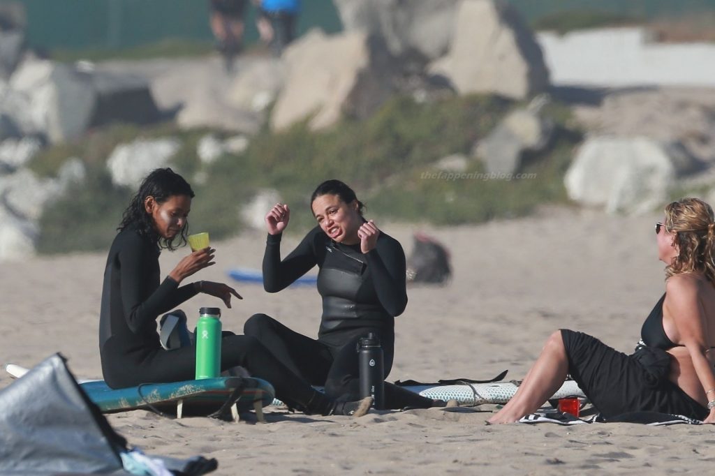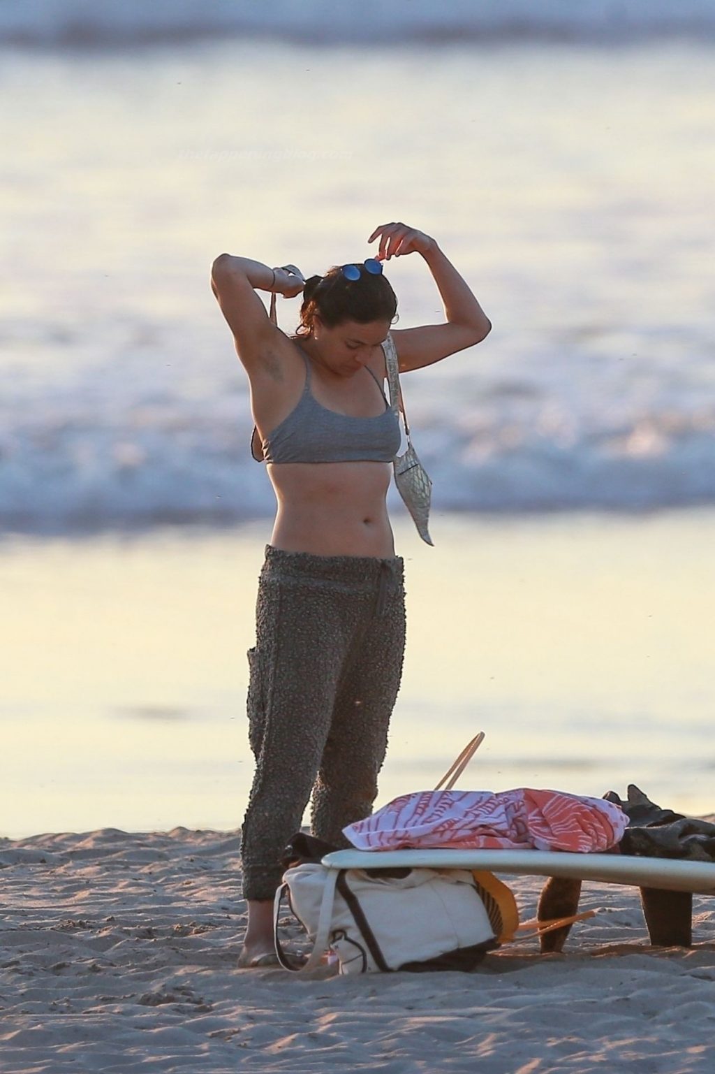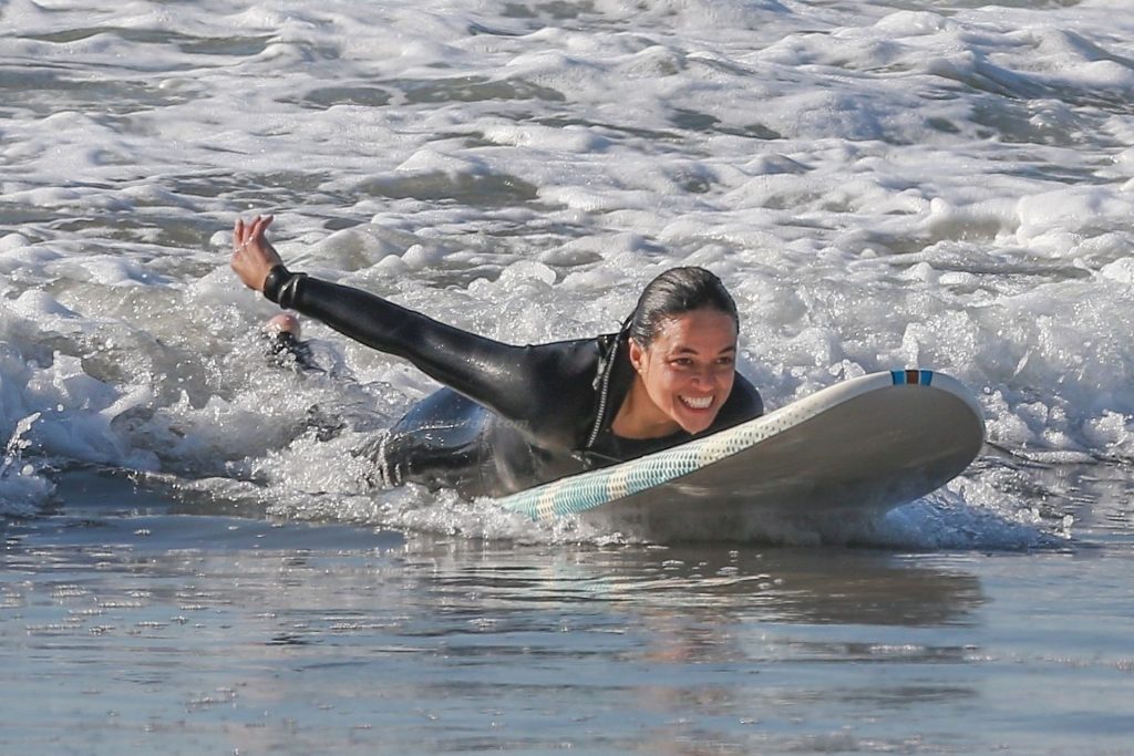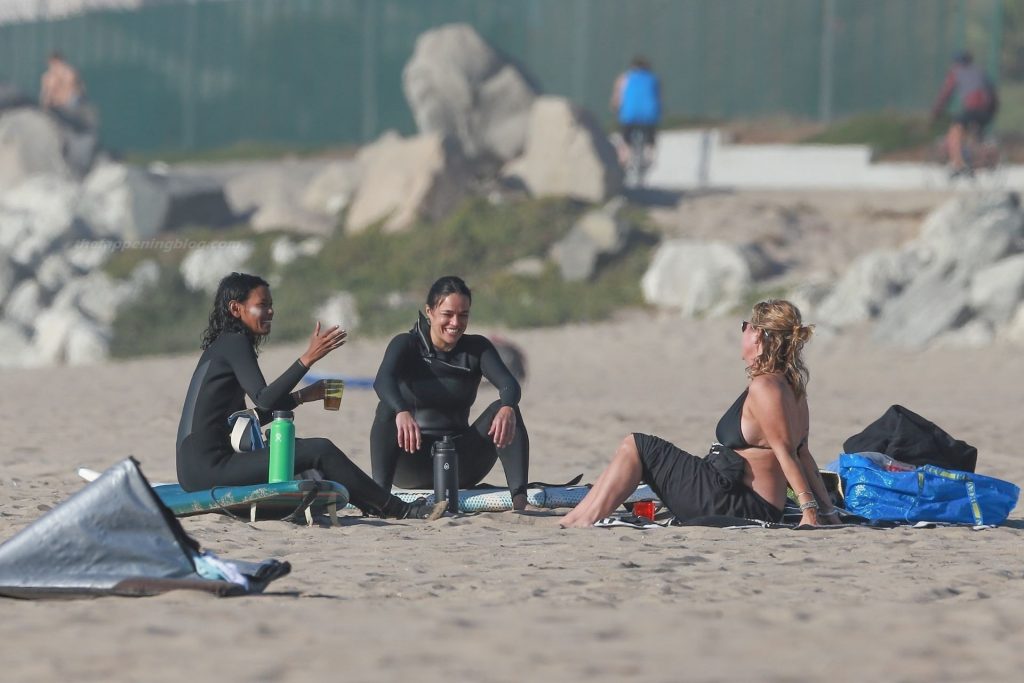 Michelle Rodriguez vai surfar com amigos em Malibu, 12/04/2020. A atriz mostra seu corpo sexy e em forma, trocando a roupa de mergulho.