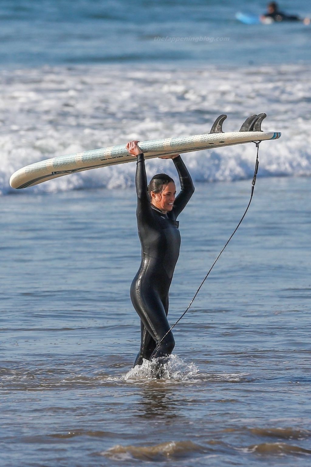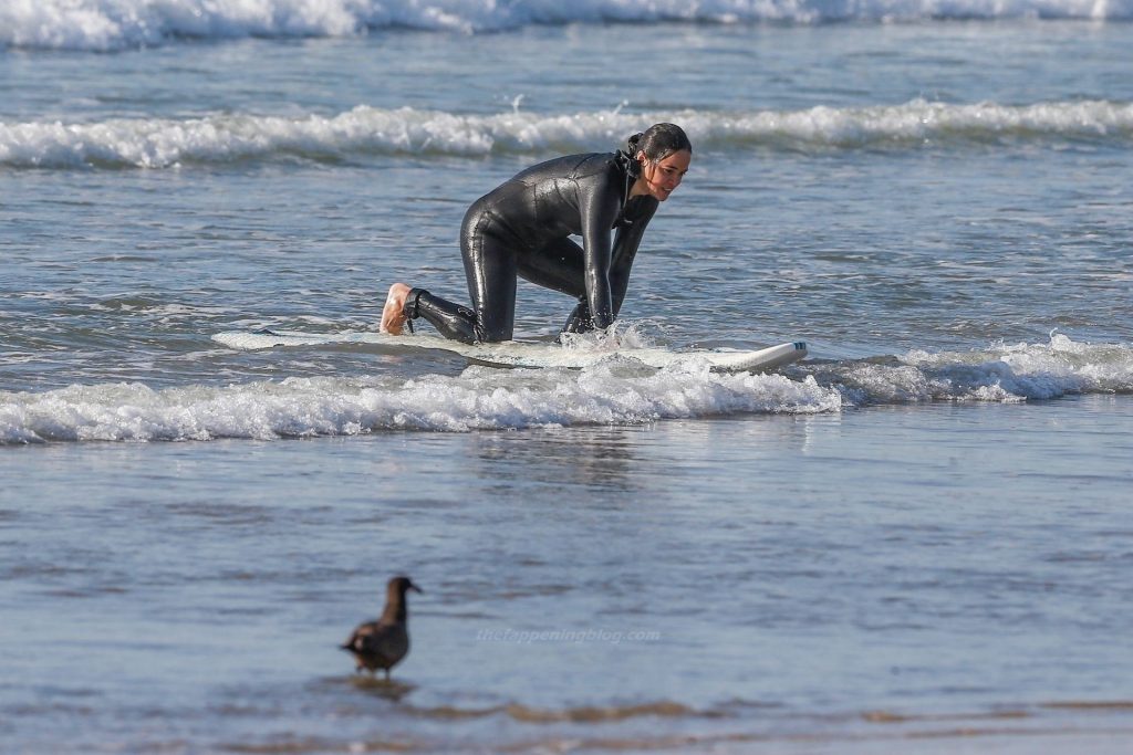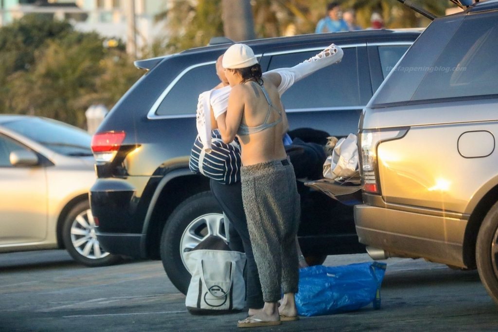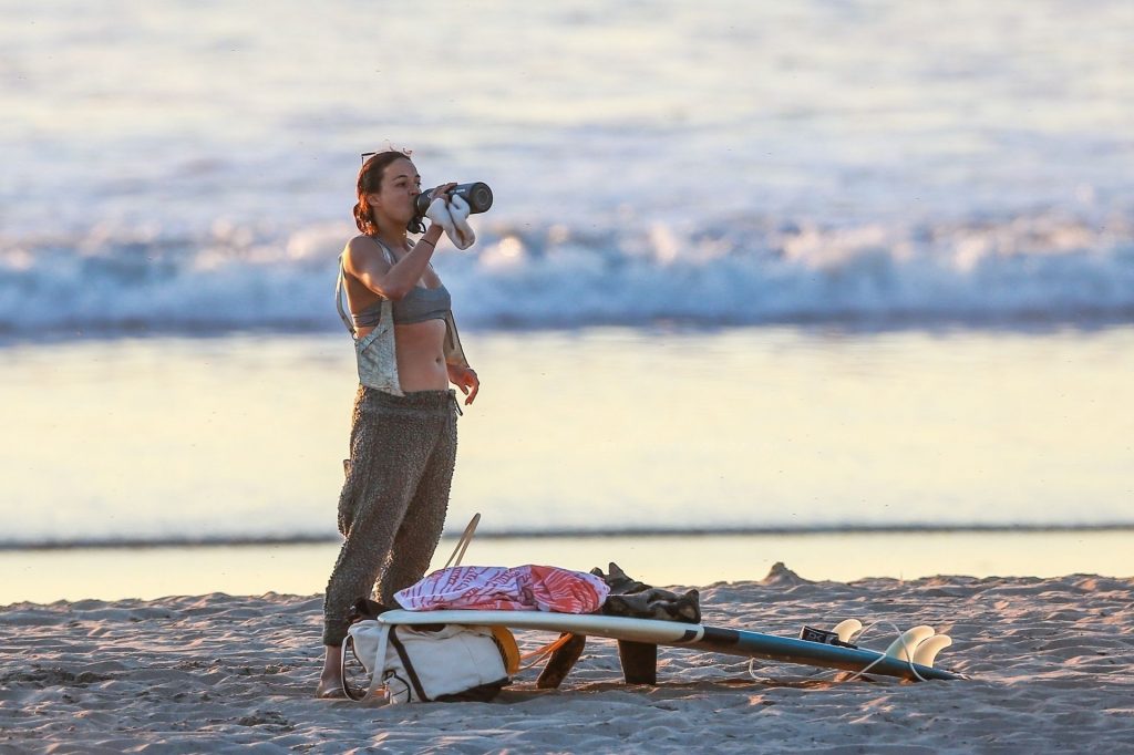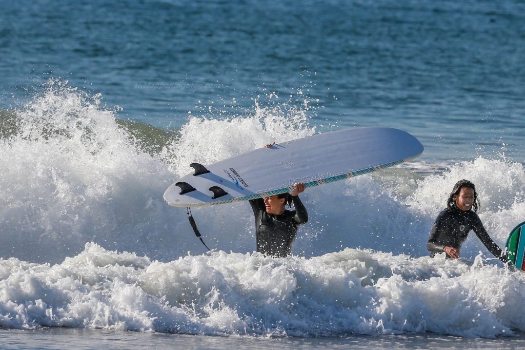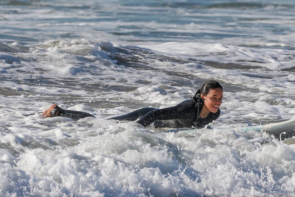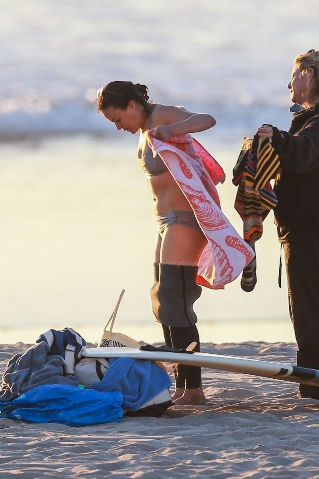 Michelle Rodriguez vai surfar com amigos em Malibu, 12/04/2020. A atriz mostra seu corpo sexy e em forma, trocando a roupa de mergulho.