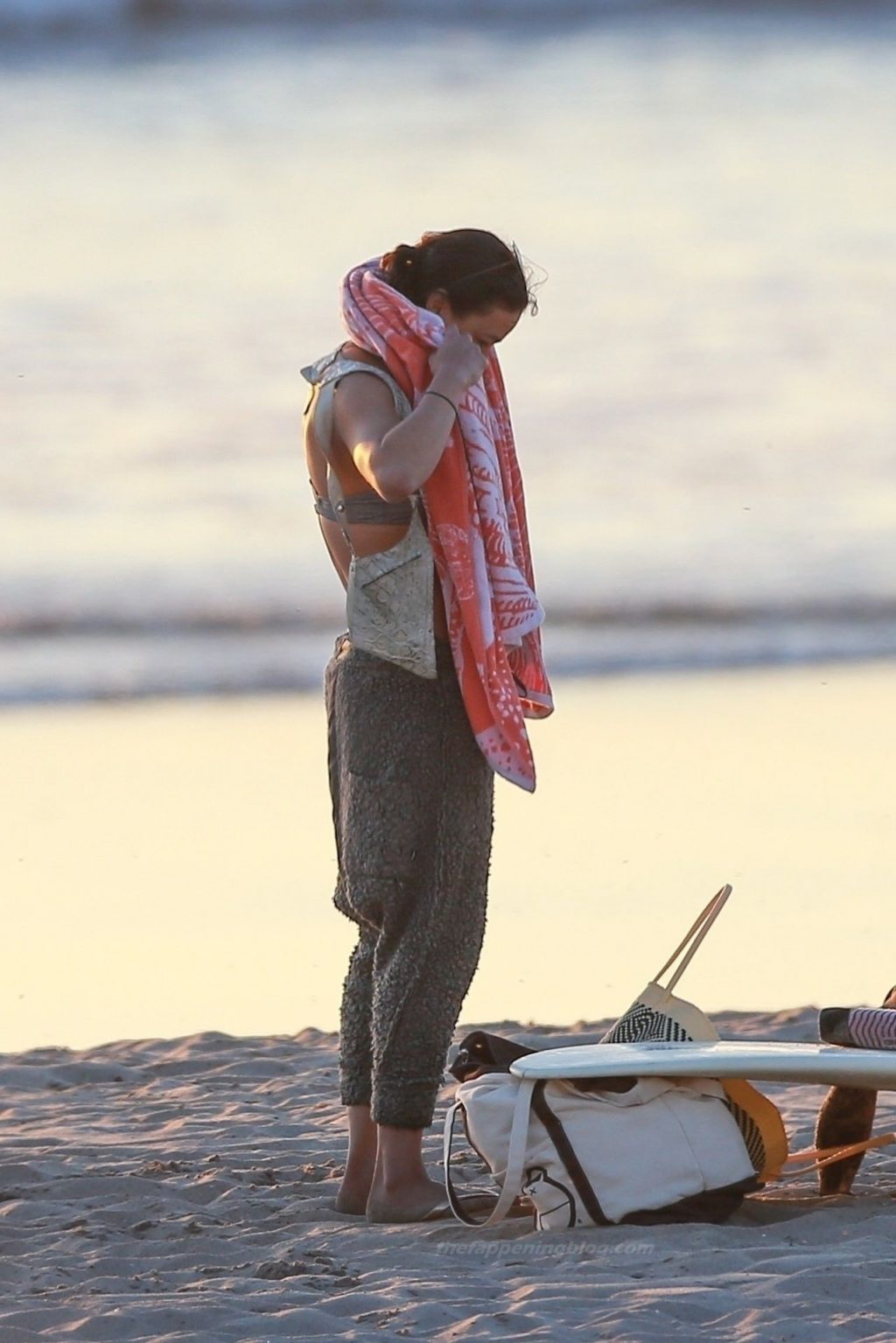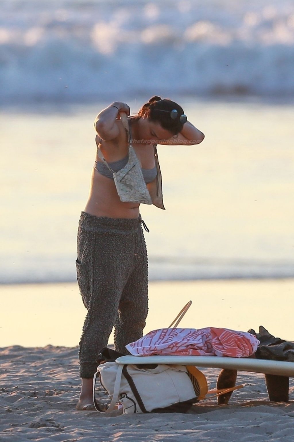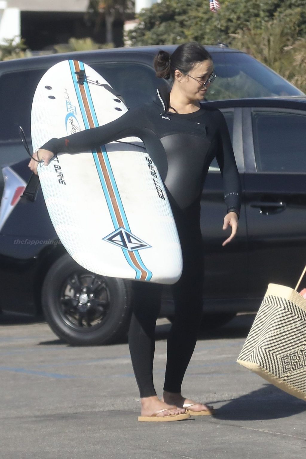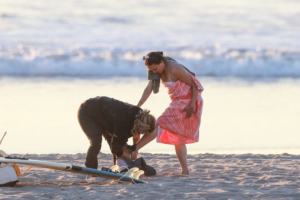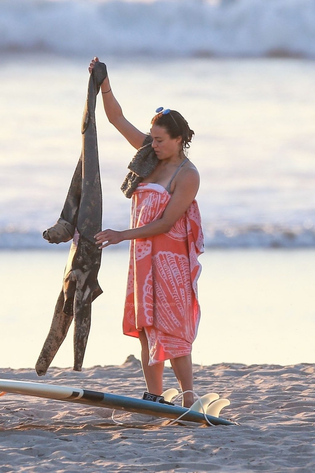 Michelle Rodriguez vai surfar com amigos em Malibu, 12/04/2020. A atriz mostra seu corpo sexy e em forma, trocando a roupa de mergulho.