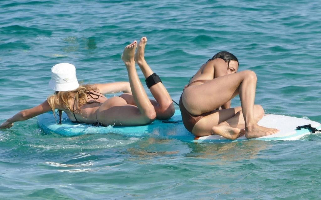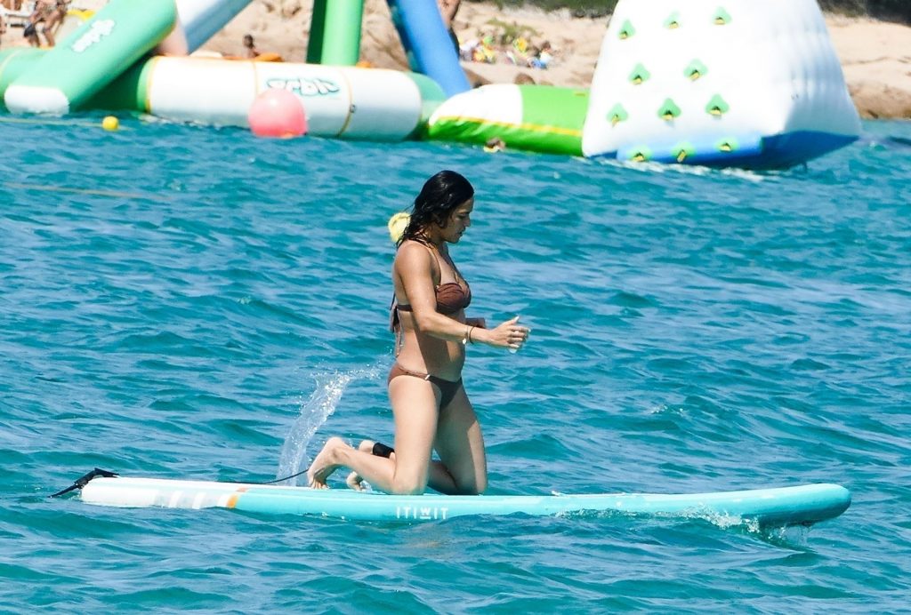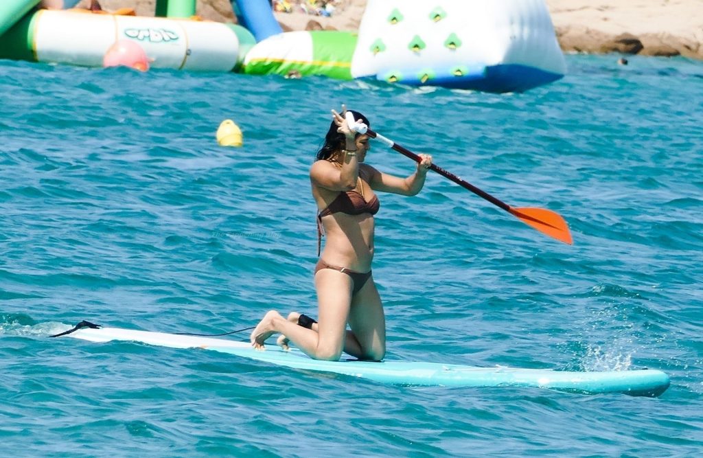 Exibindo seu corpo bronzeado dourado e figura voluptuosa usando seu sexy biquíni marrom, Michelle exalava sensualidade enquanto se aventurava nas águas para praticar paddle boarding no mar.