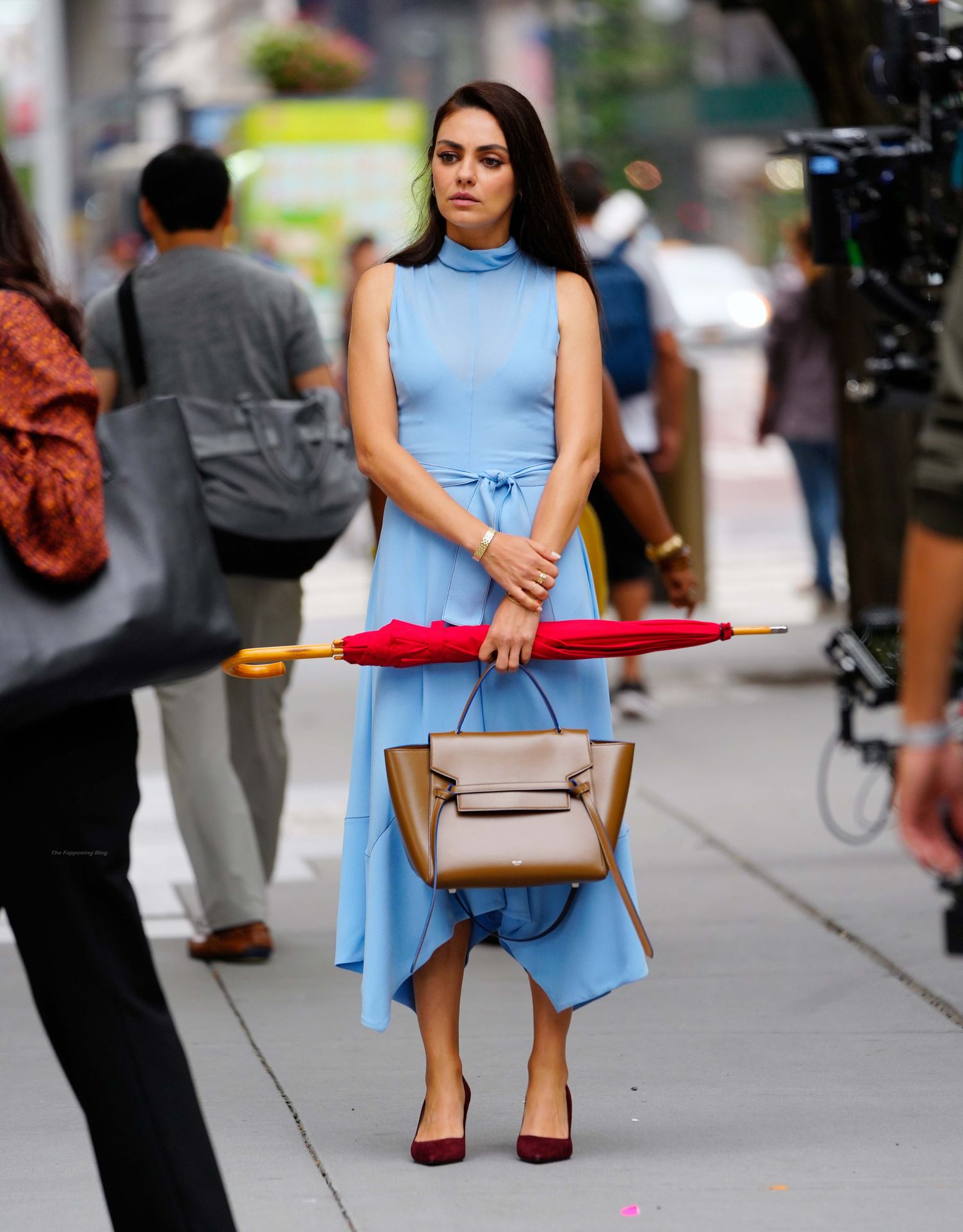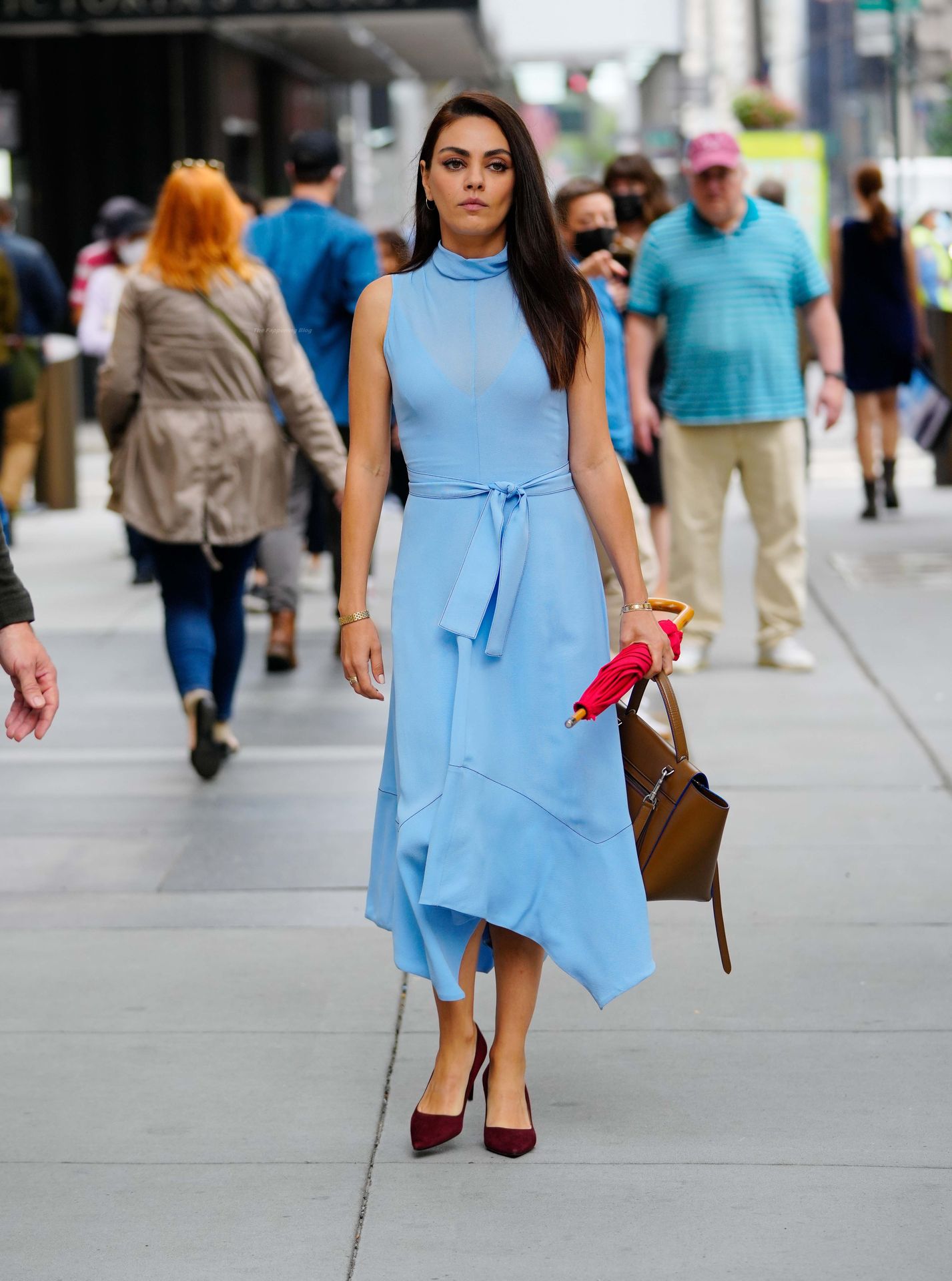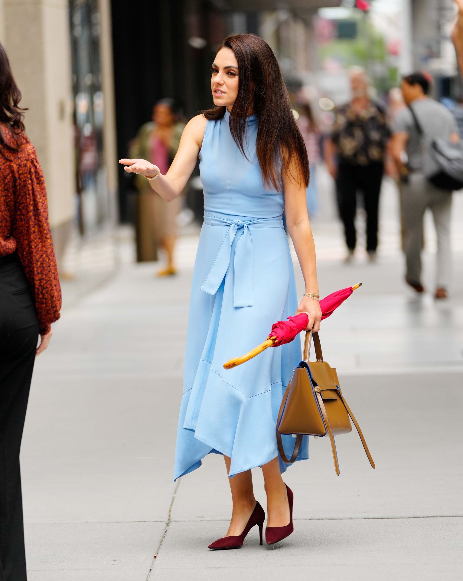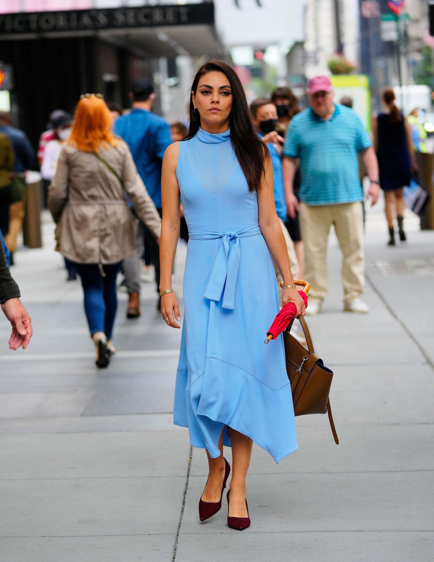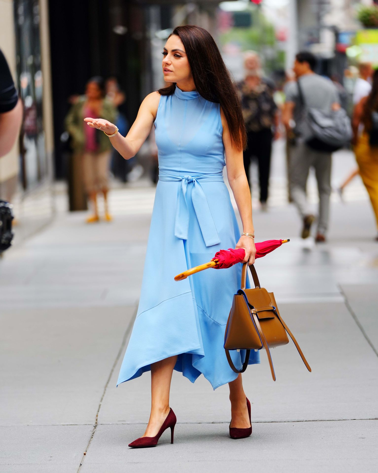 A atriz americana de 38 anos parecia elegante na rua movimentada, vestindo um vestido azul claro combinado com saltos vermelhos e carregando um guarda-chuva vermelho e uma bolsa marrom.