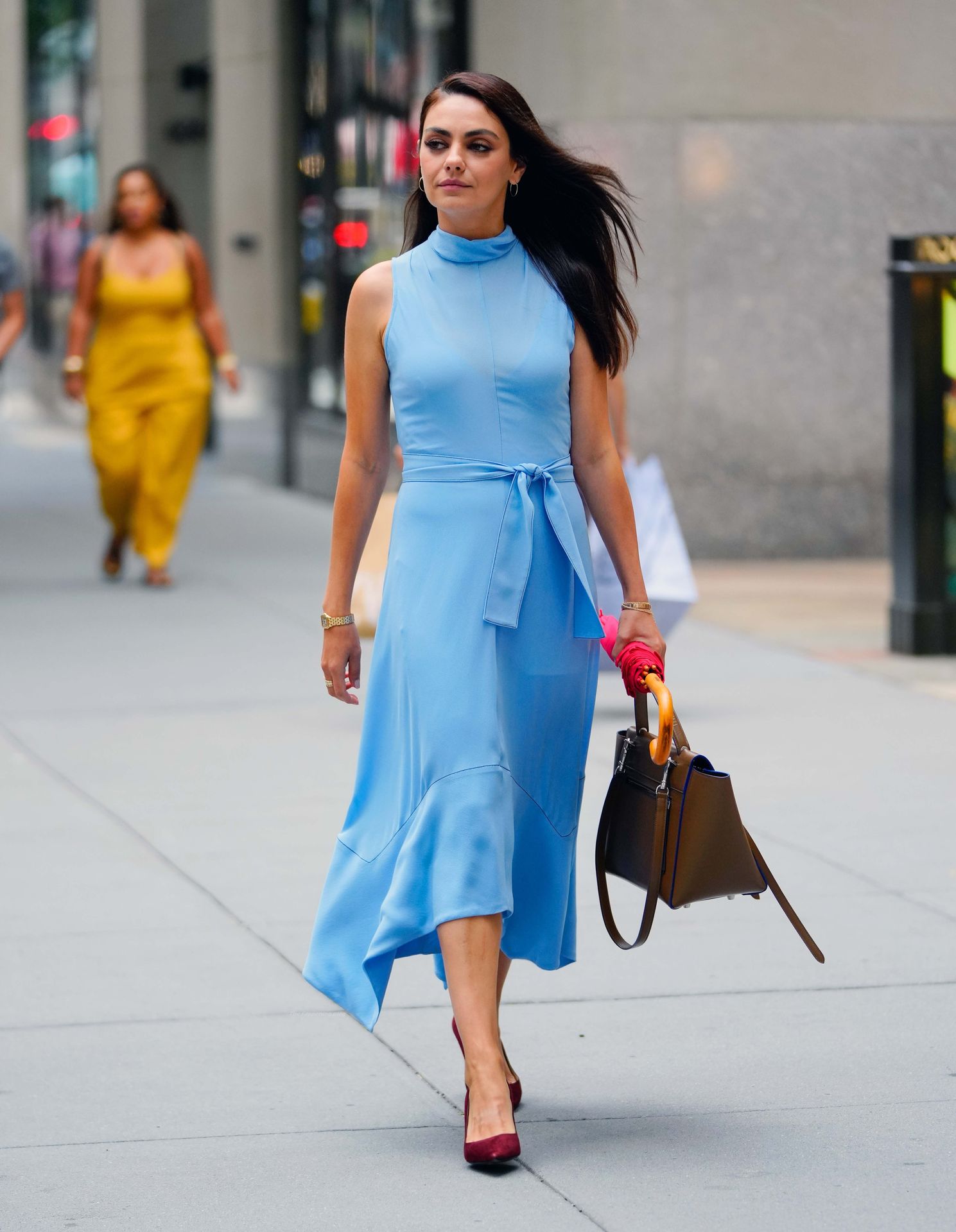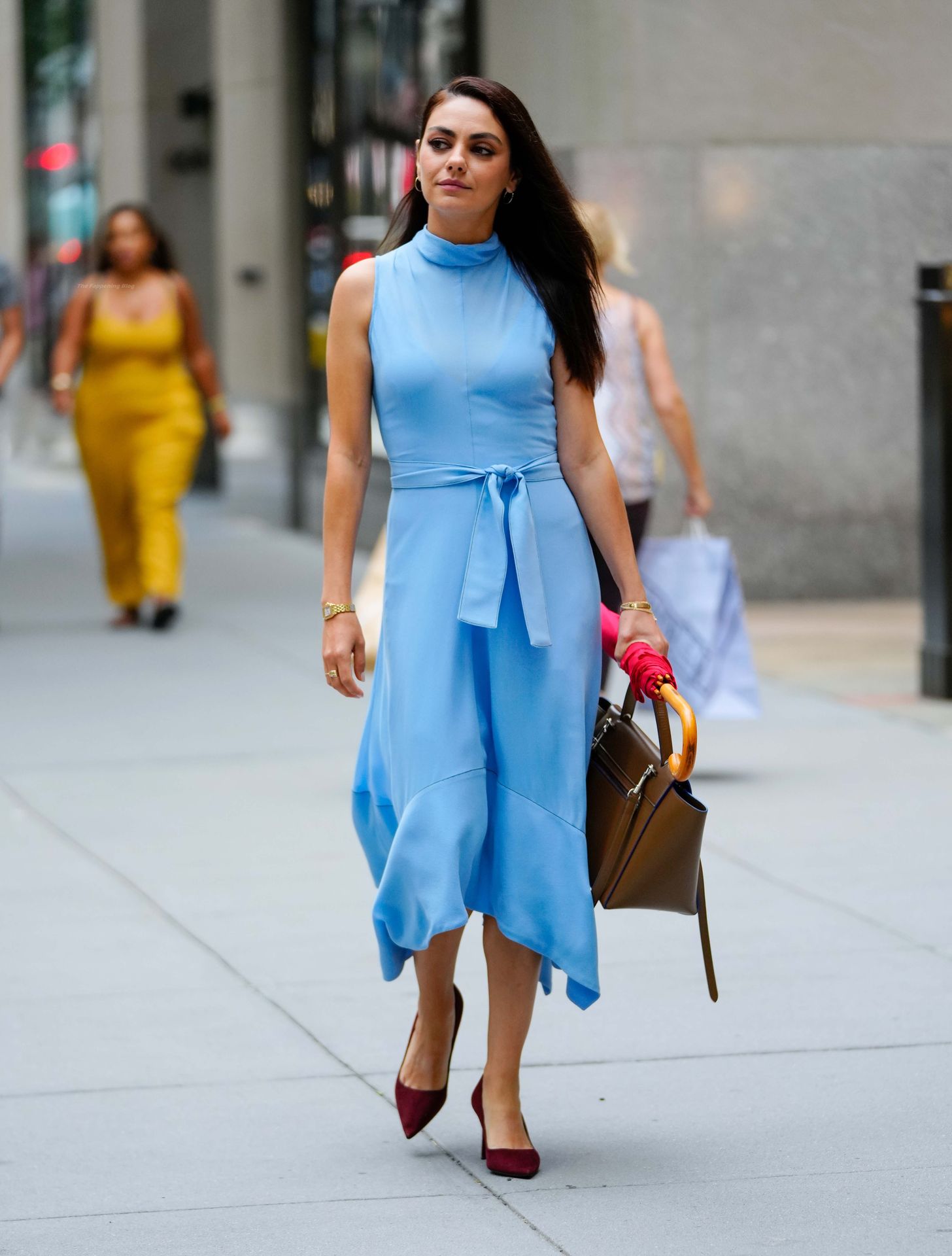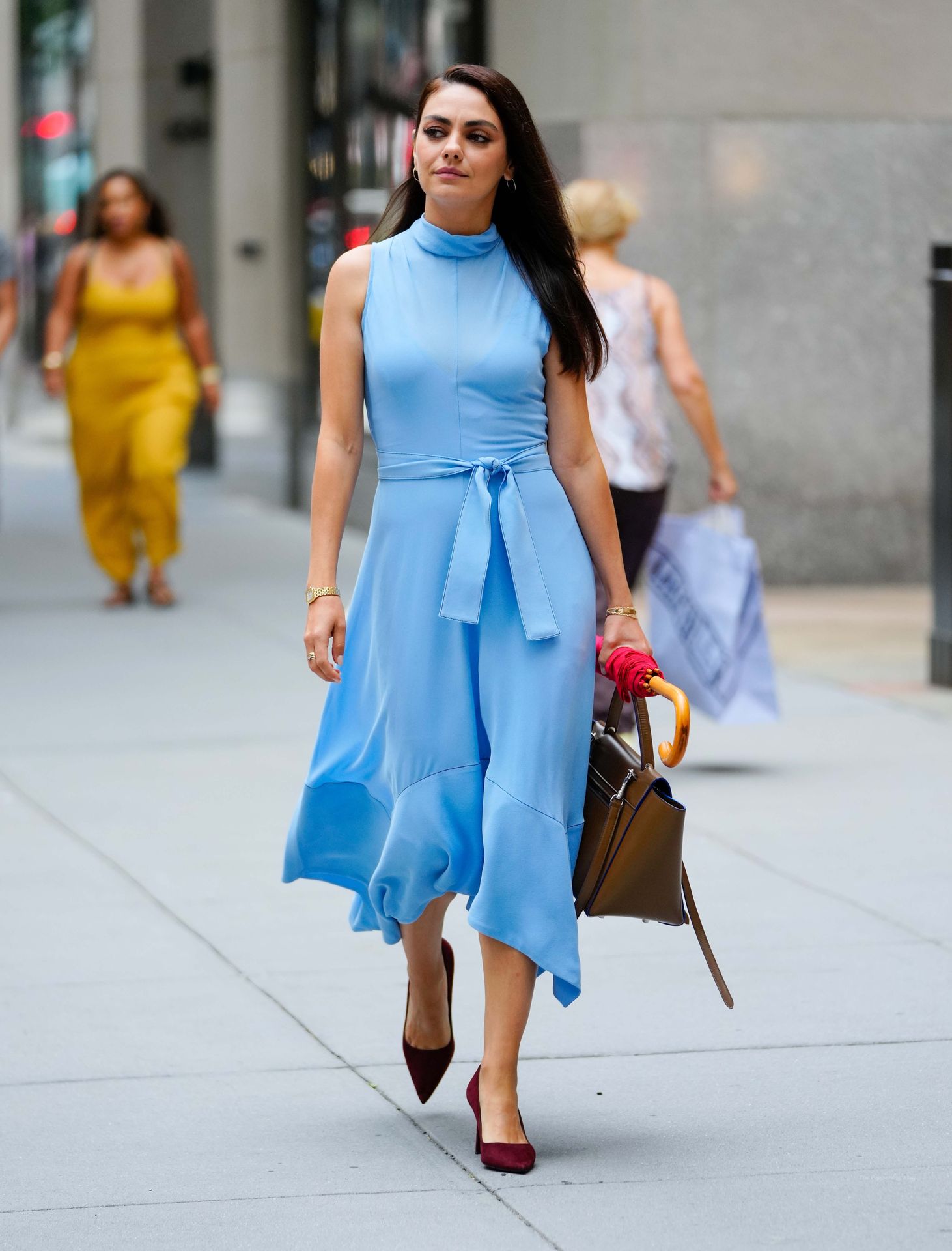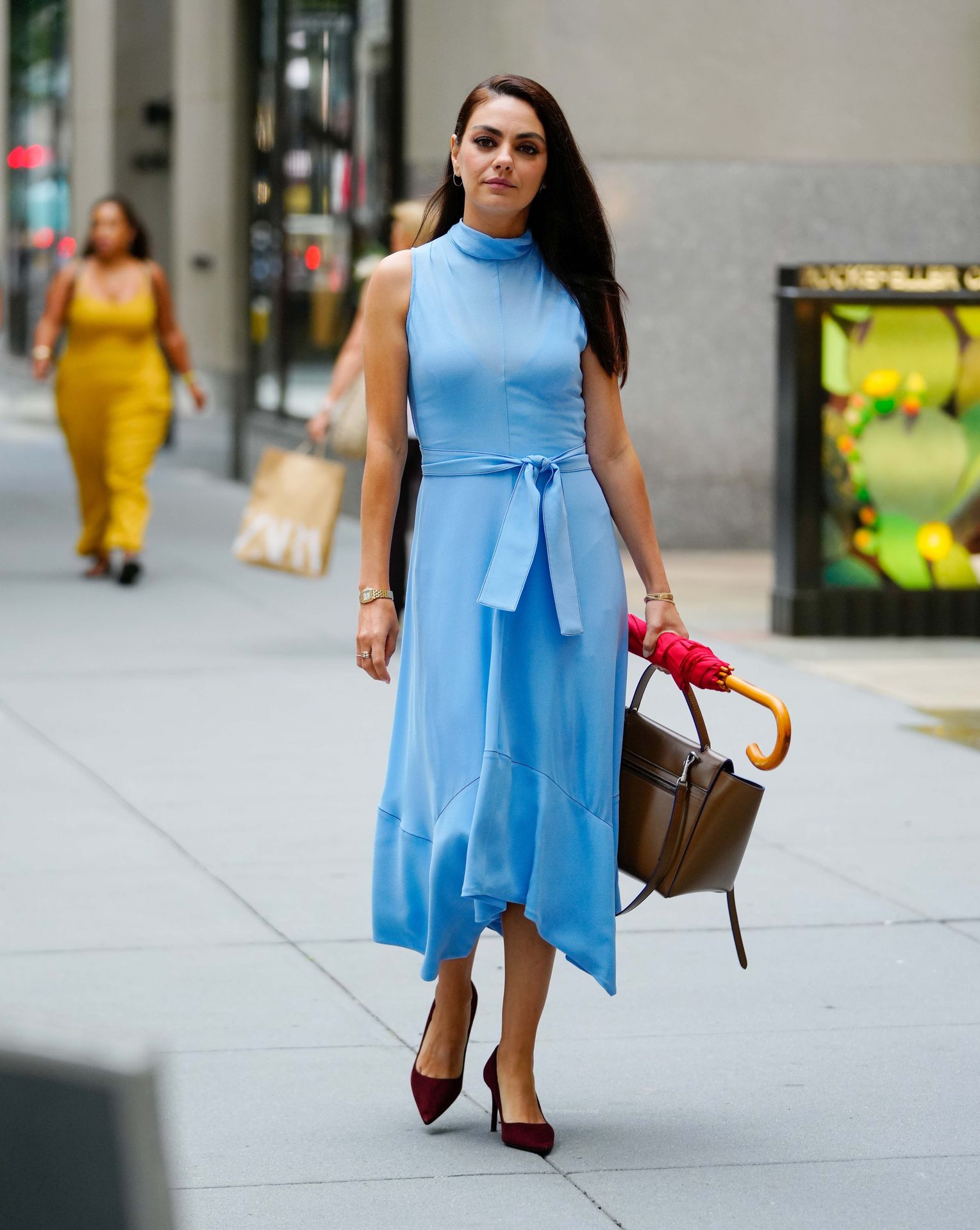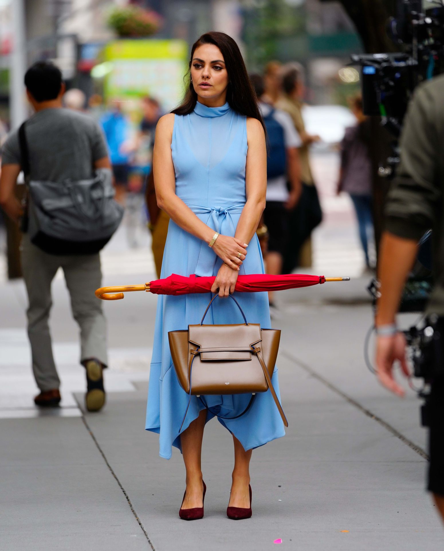 A atriz americana de 38 anos parecia elegante na rua movimentada, vestindo um vestido azul claro combinado com saltos vermelhos e carregando um guarda-chuva vermelho e uma bolsa marrom.