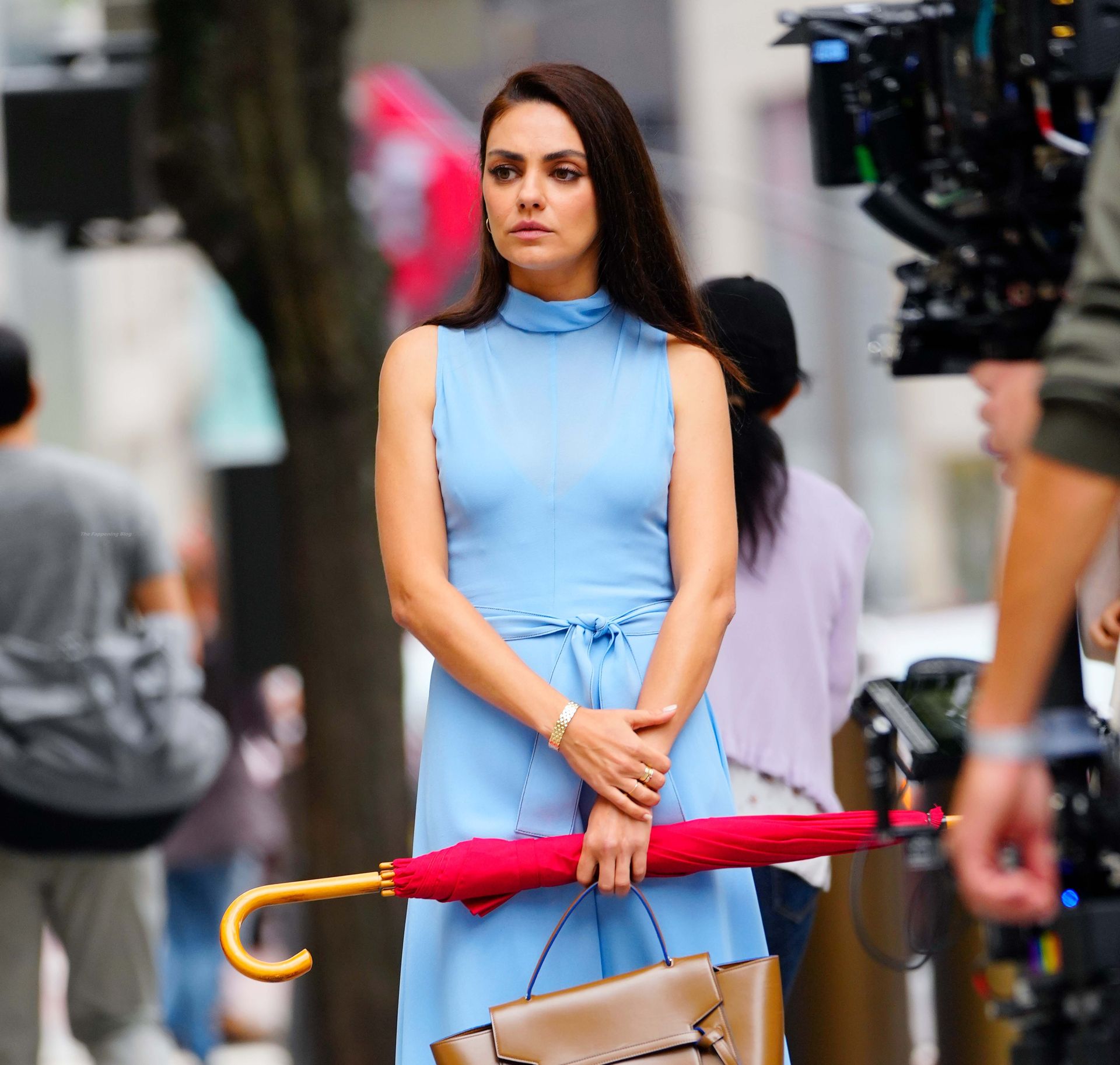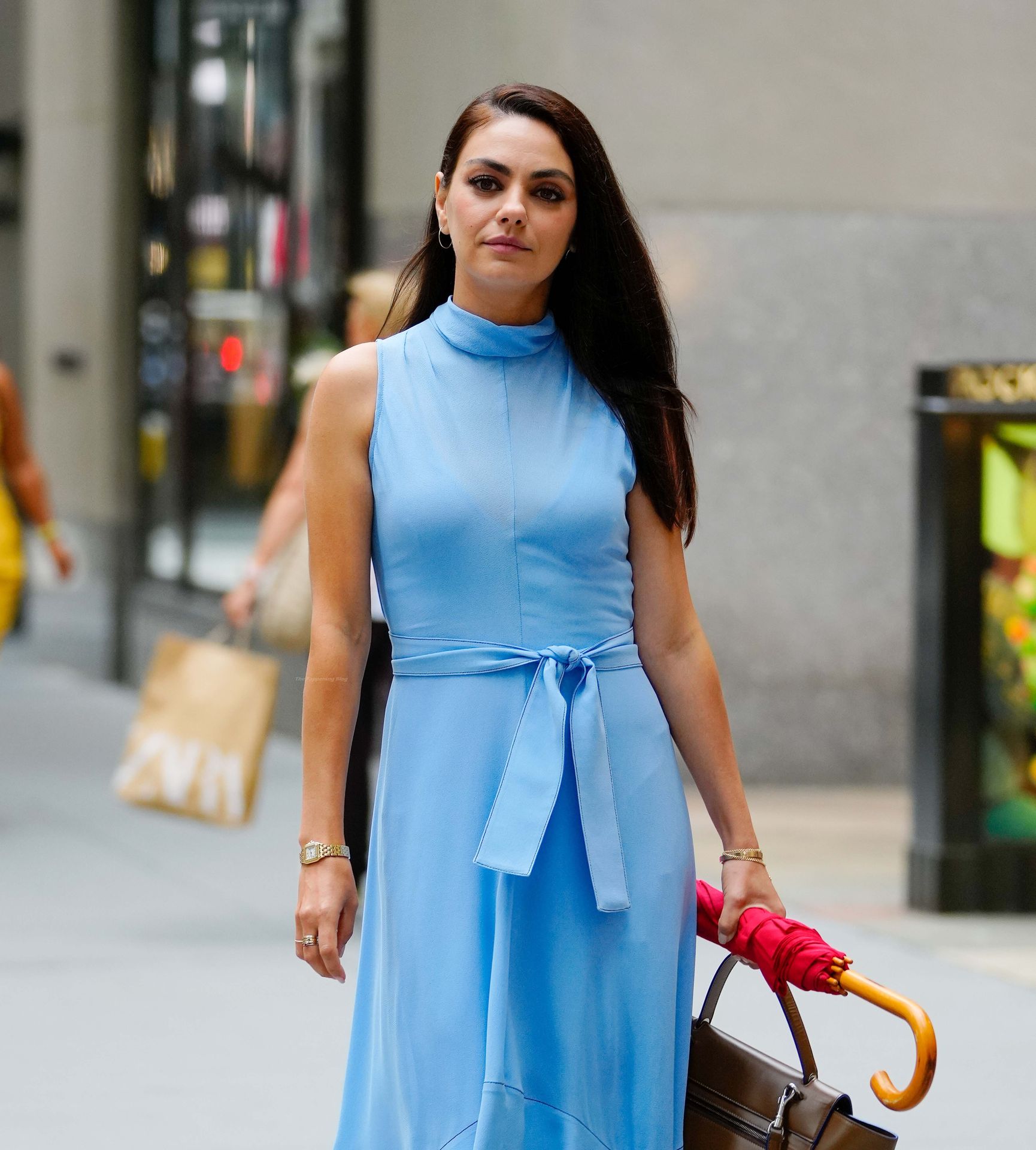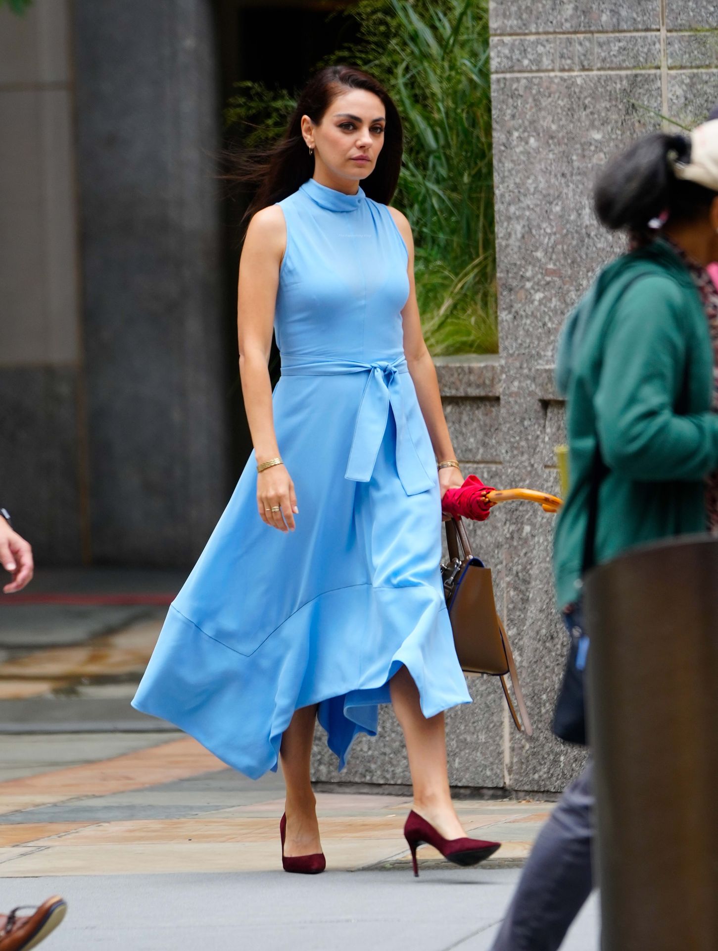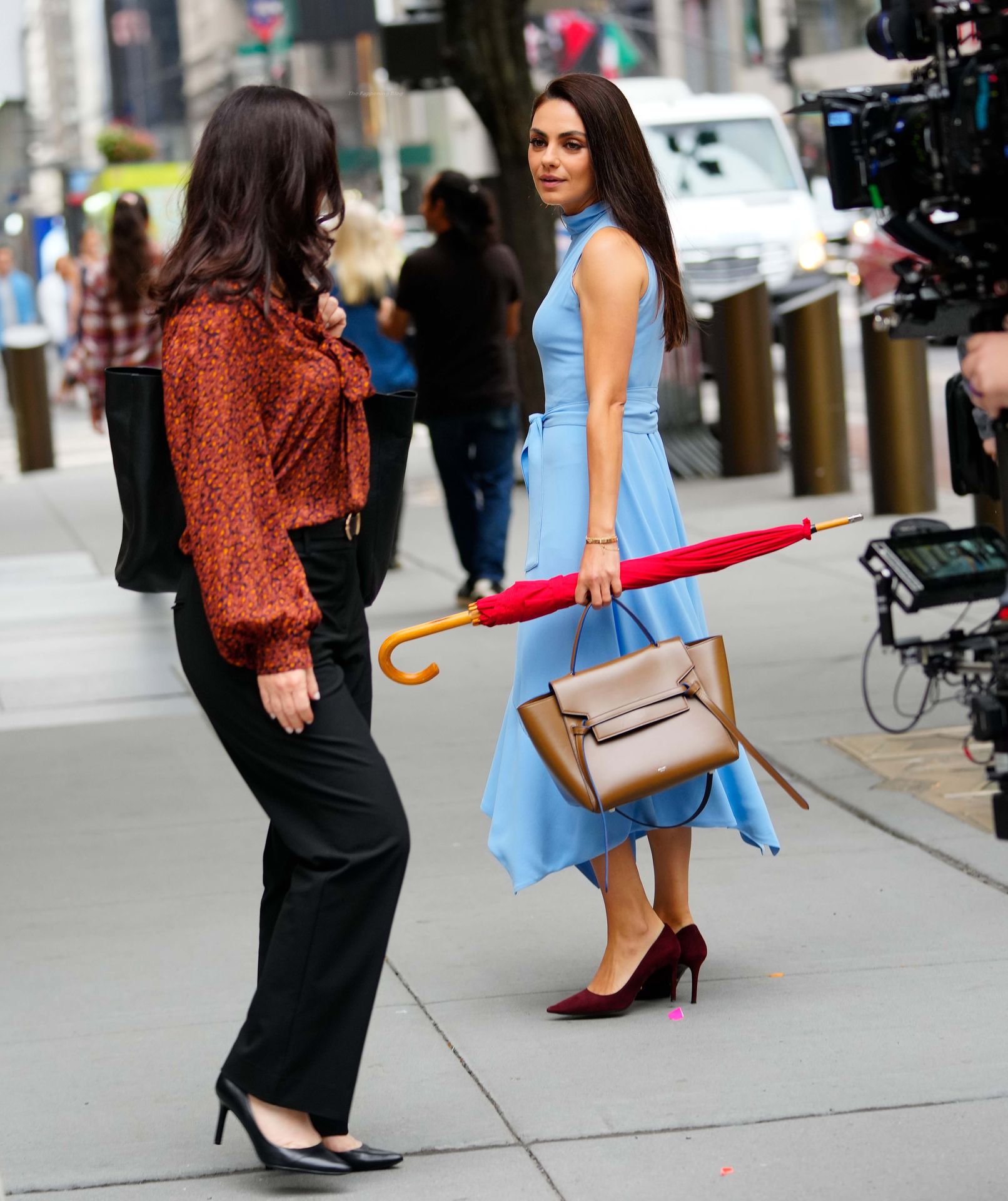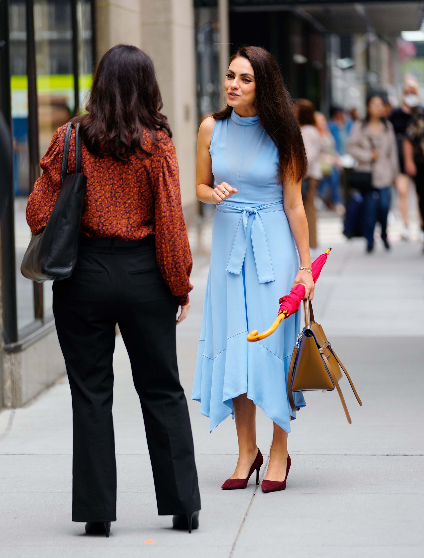 A atriz americana de 38 anos parecia elegante na rua movimentada, vestindo um vestido azul claro combinado com saltos vermelhos e carregando um guarda-chuva vermelho e uma bolsa marrom.