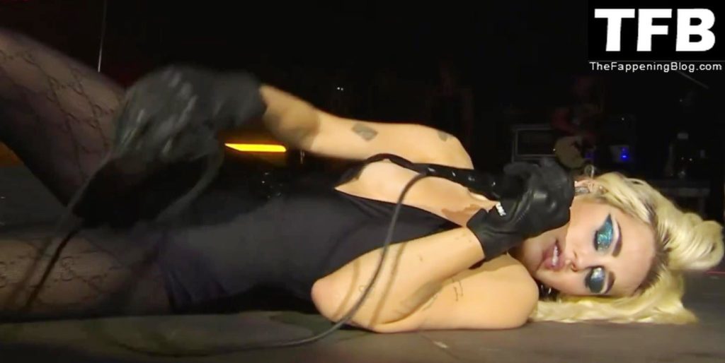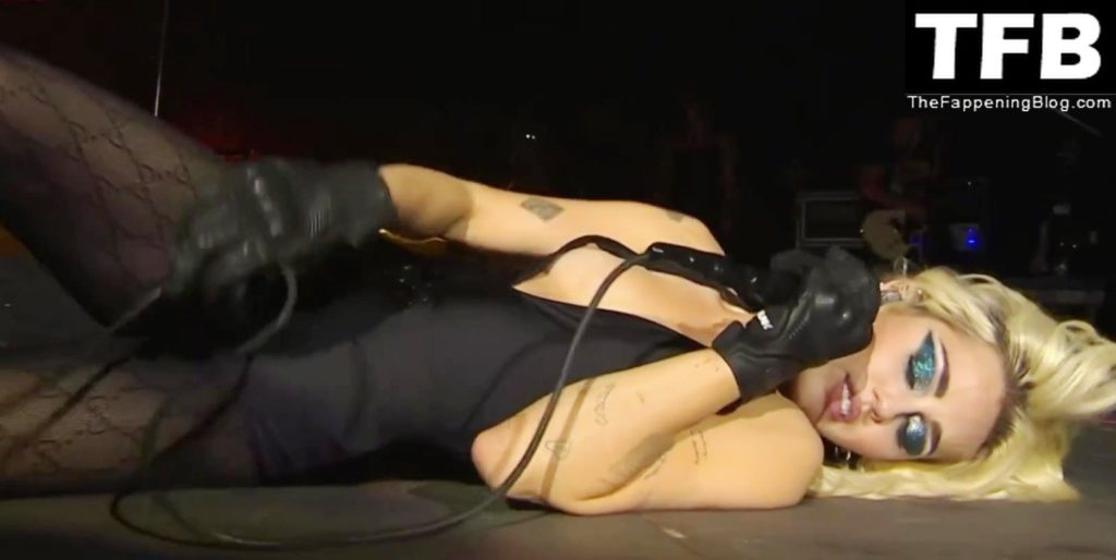 A estrela do Fappening Miley Cyrus mostra seu mamilo durante sua apresentação no palco em São Paulo, Brasil, 26/03/2022.