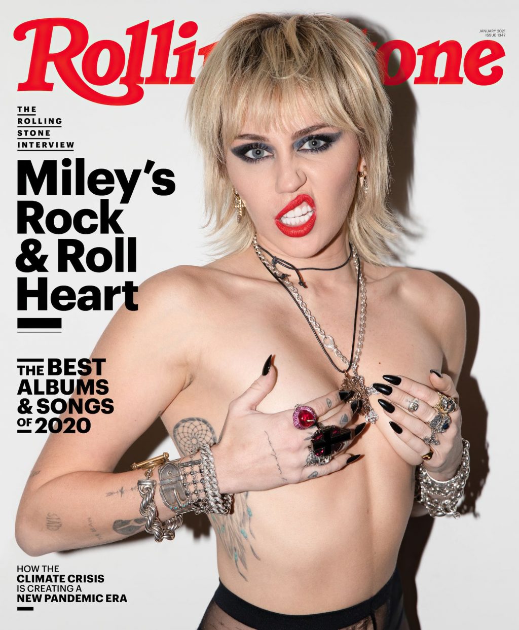 A estrela do Fappening e cantora Miley Cyrus mostra seus seios nus em um ensaio fotográfico de Brad Elterman para todos na nova edição de janeiro de 2021 da revista Rolling Stone. Ela não esqueceu dos fãs!