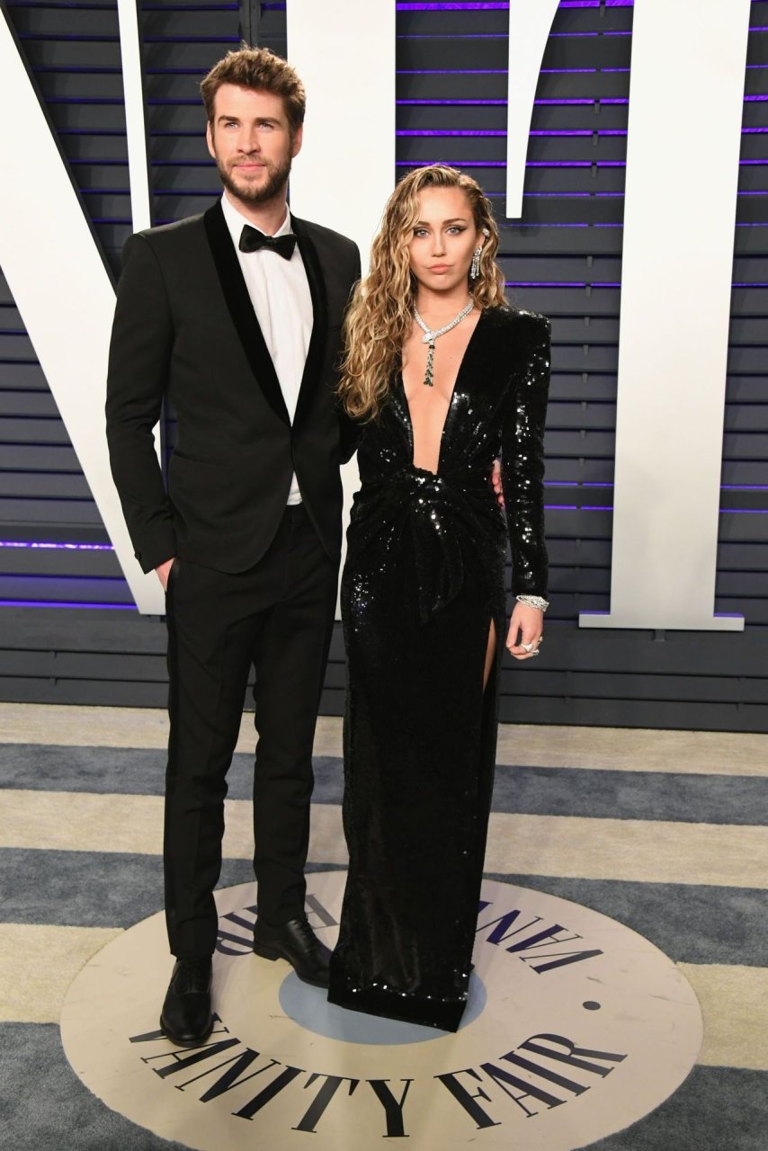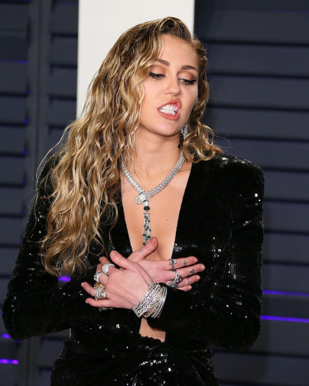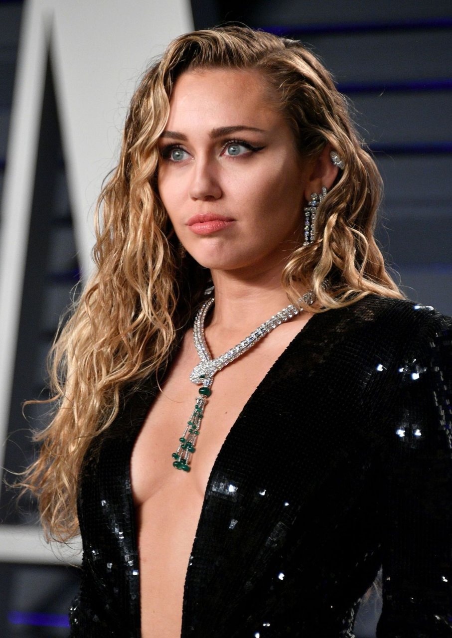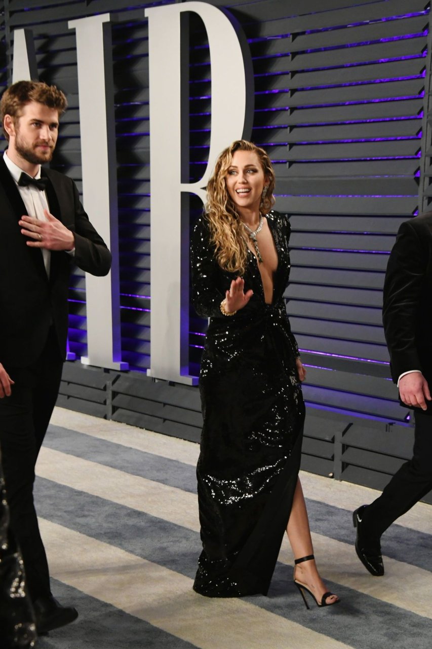 Miley Cyrus mostra seu decote na Vanity Fair Oscar Party 2019 em Beverly Hills, 24/02/2019. A cantora apareceu no tapete vermelho com seu amado, Liam Hemsworth.