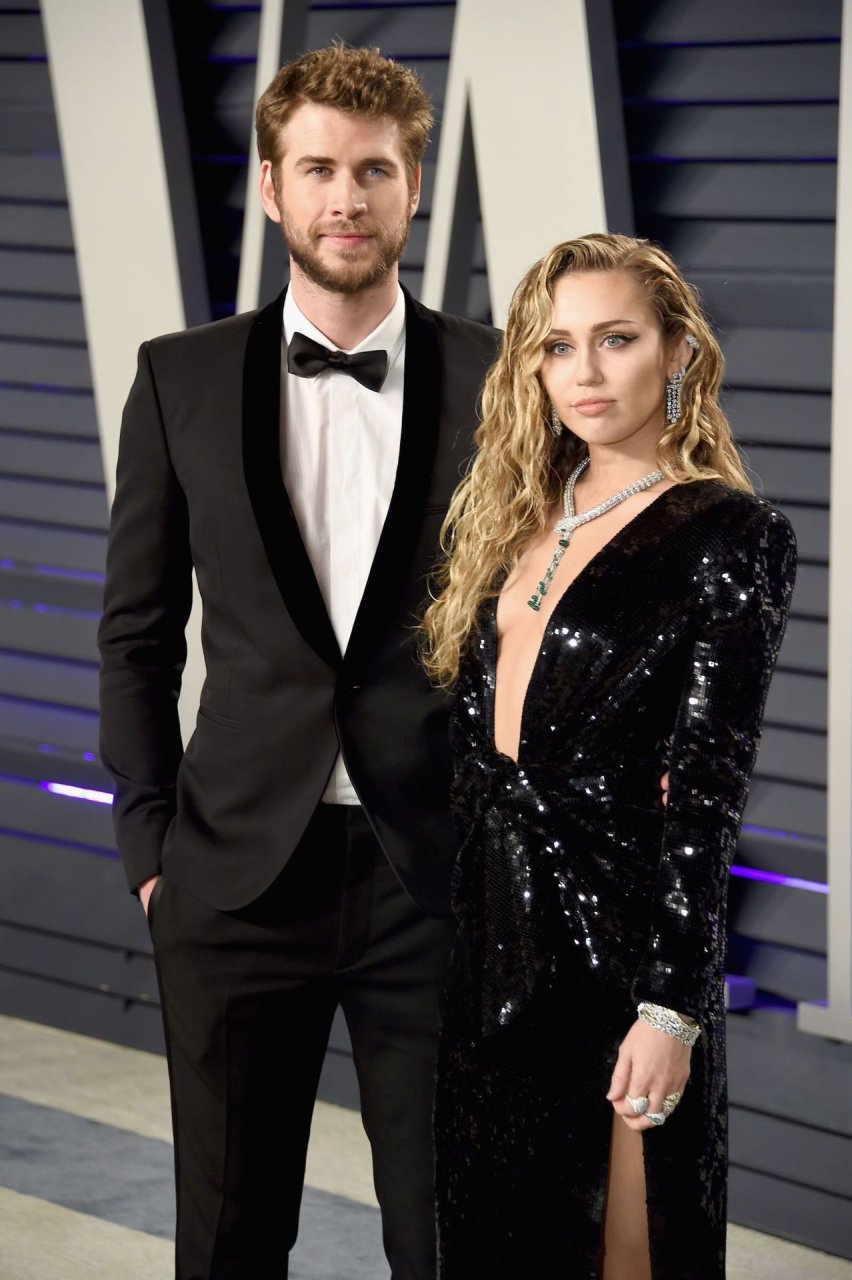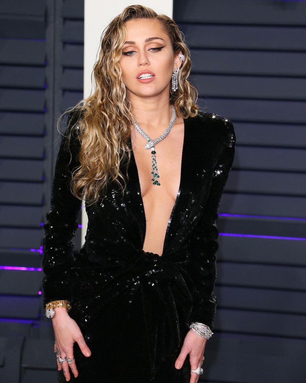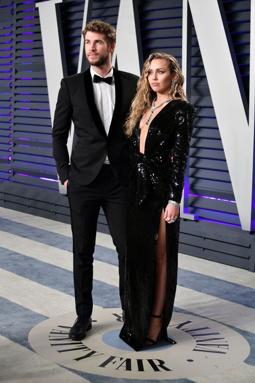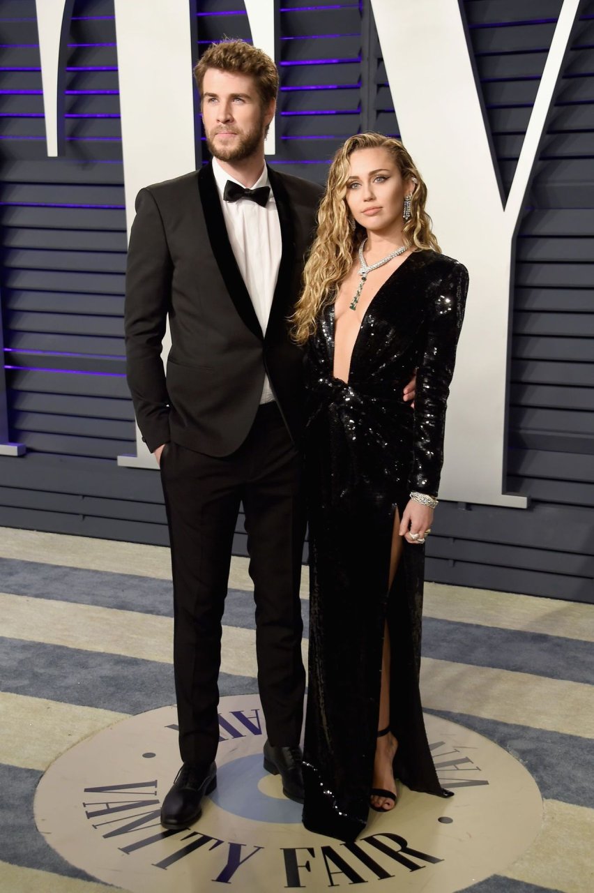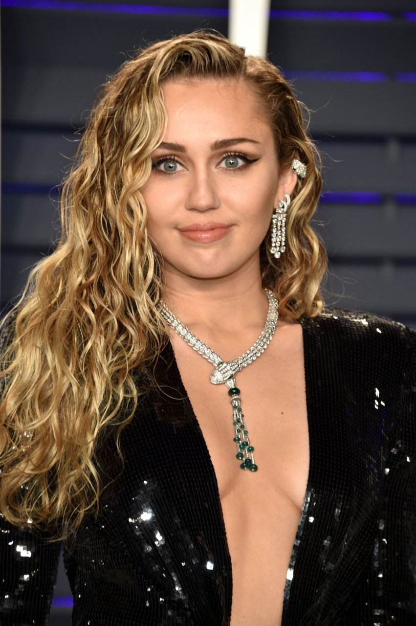 Miley Cyrus mostra seu decote na Vanity Fair Oscar Party 2019 em Beverly Hills, 24/02/2019. A cantora apareceu no tapete vermelho com seu amado, Liam Hemsworth.