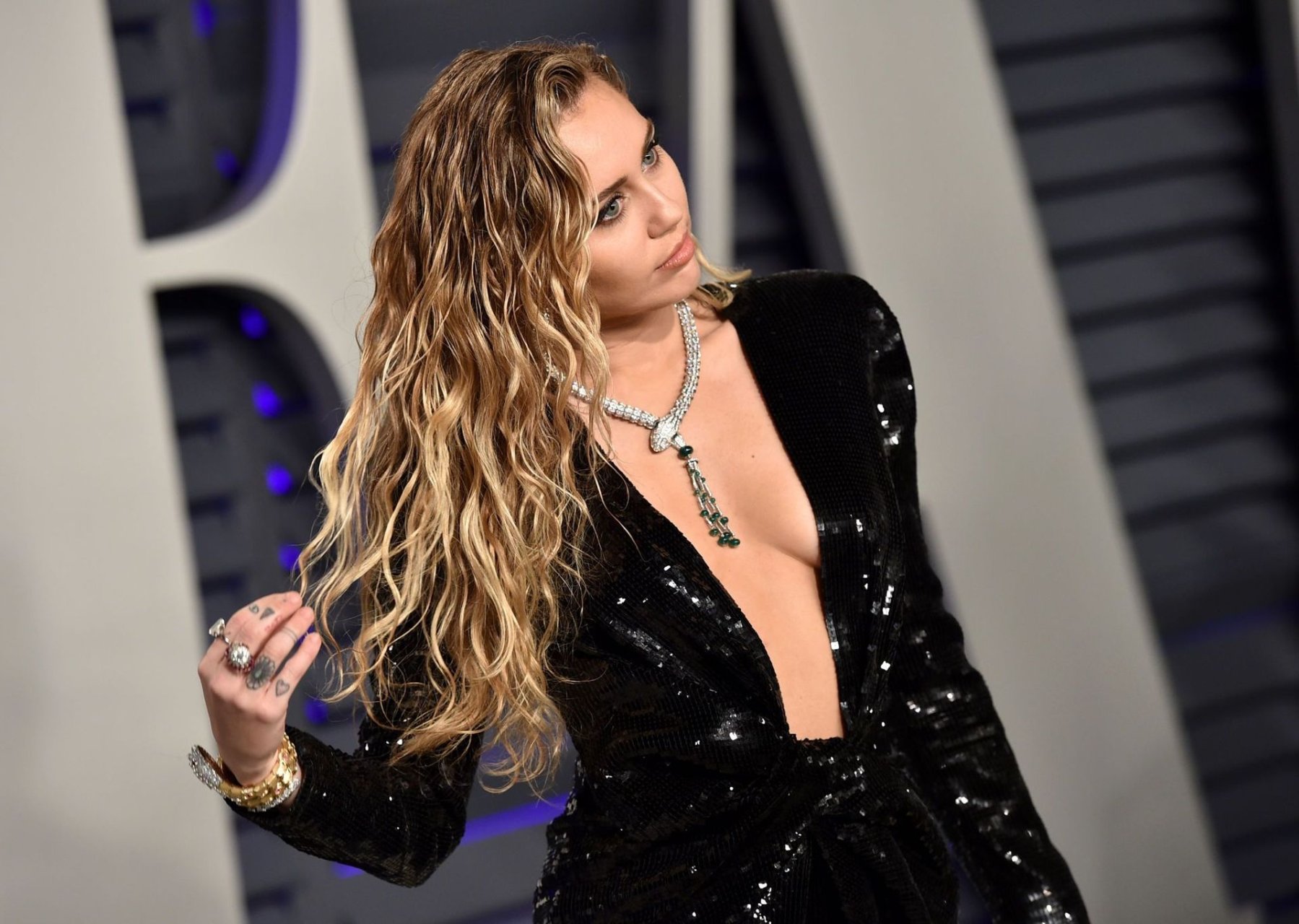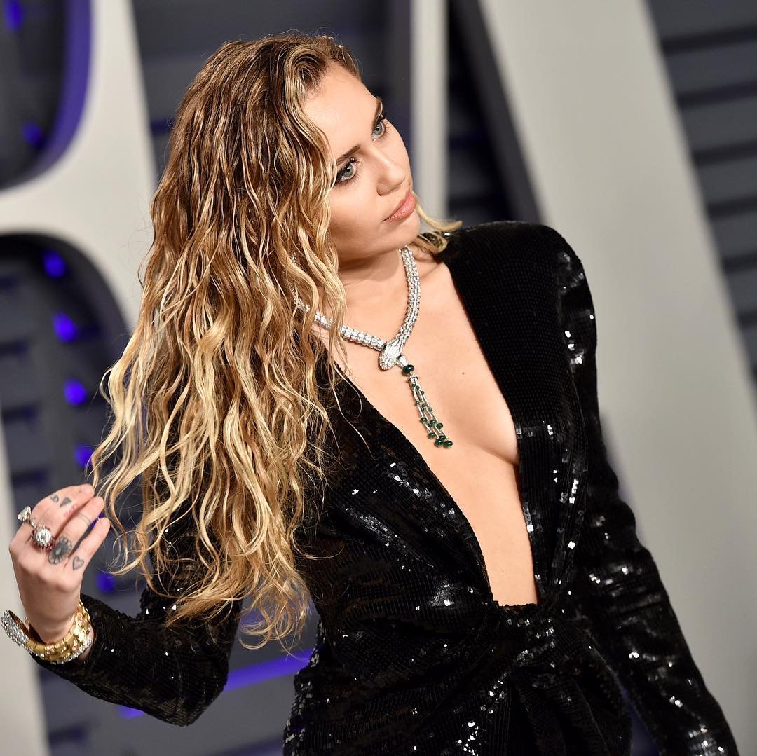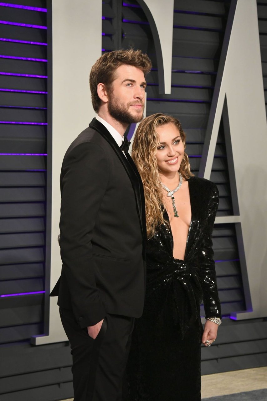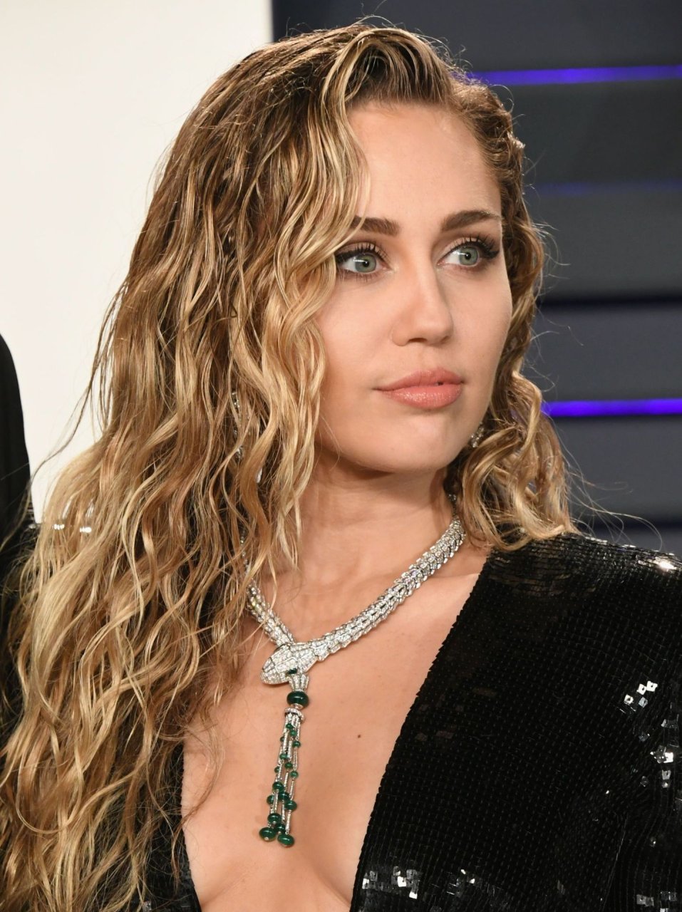 Miley Cyrus mostra seu decote na Vanity Fair Oscar Party 2019 em Beverly Hills, 24/02/2019. A cantora apareceu no tapete vermelho com seu amado, Liam Hemsworth.