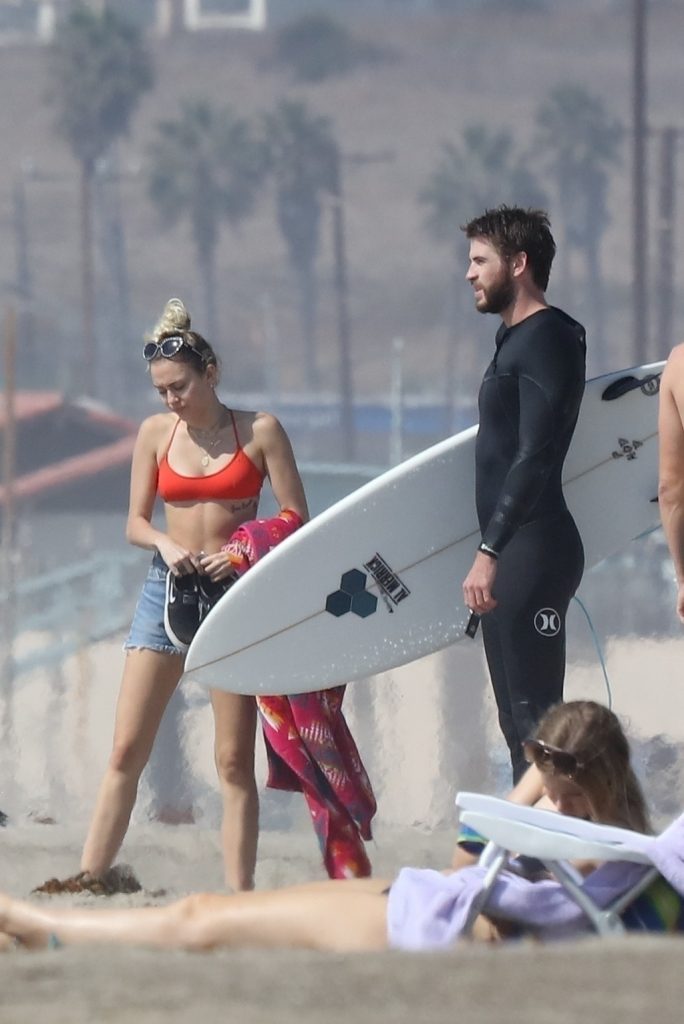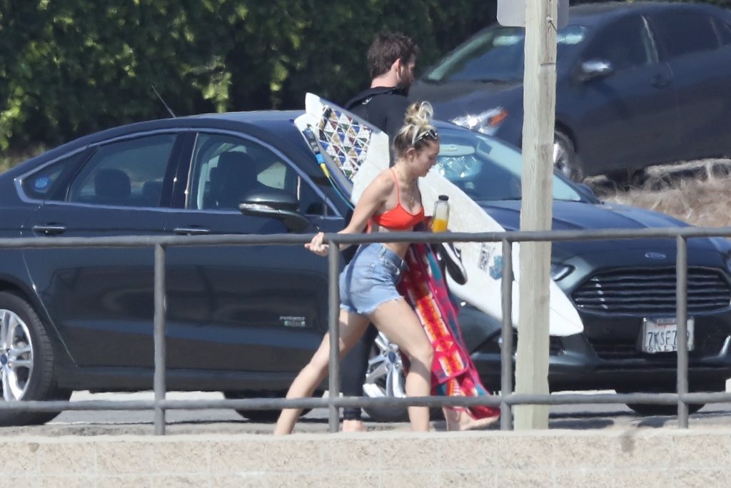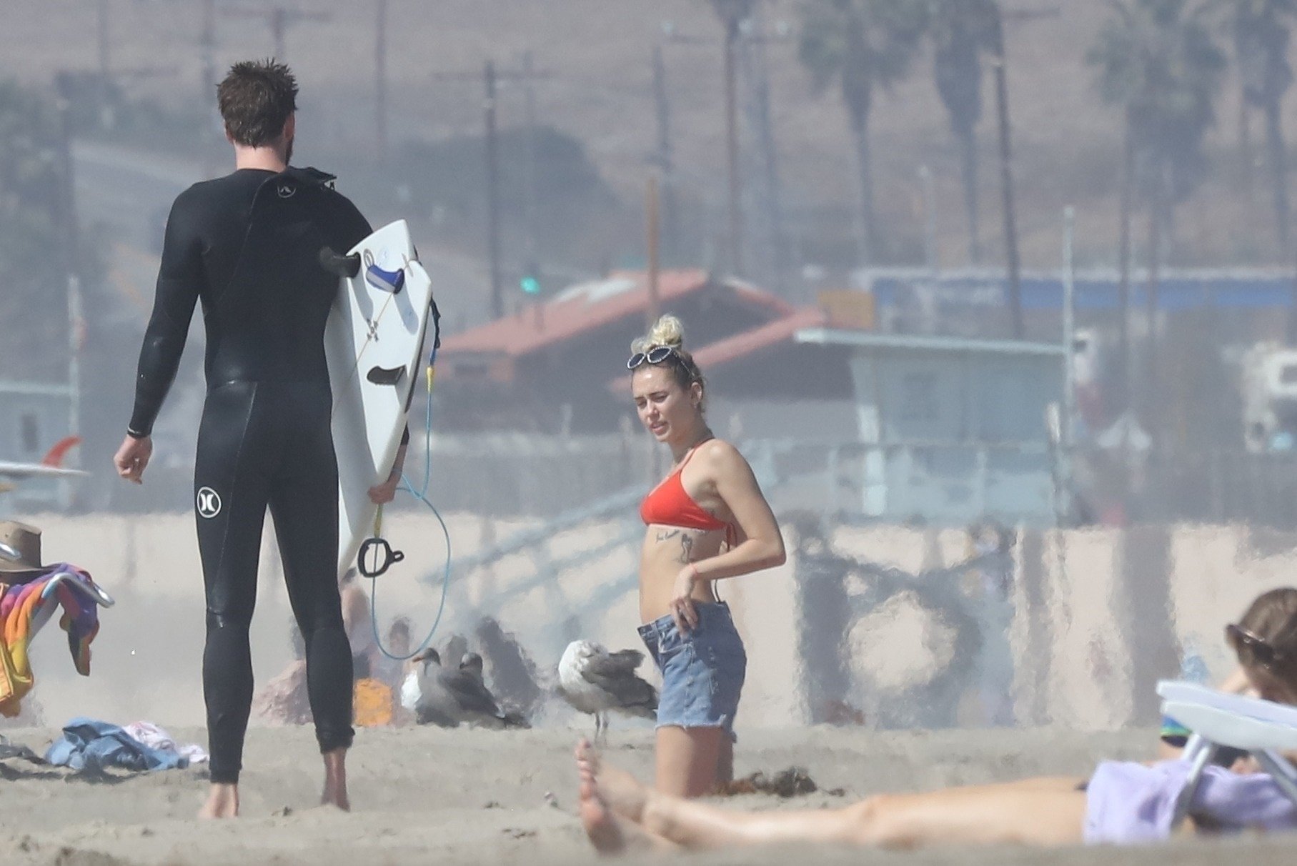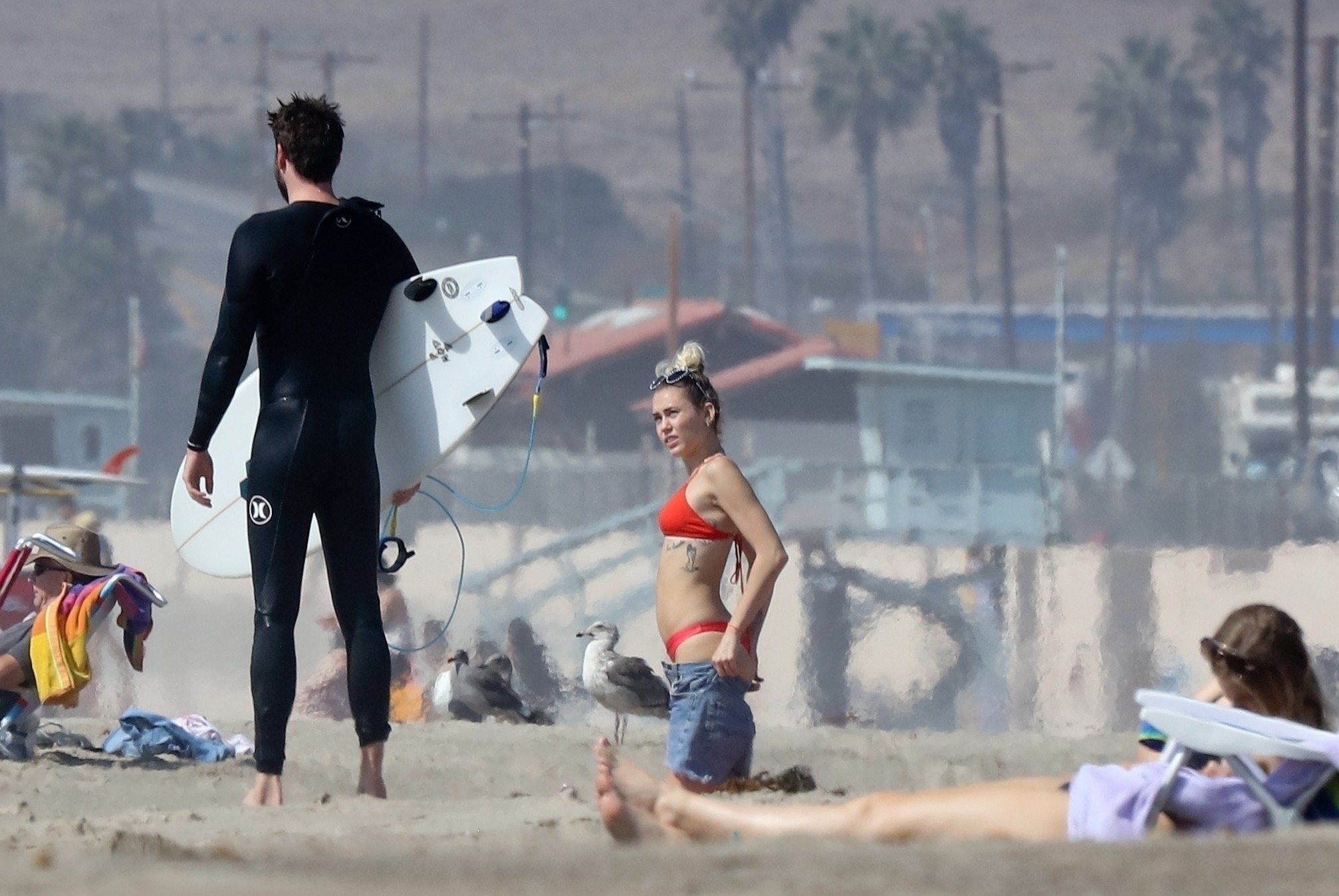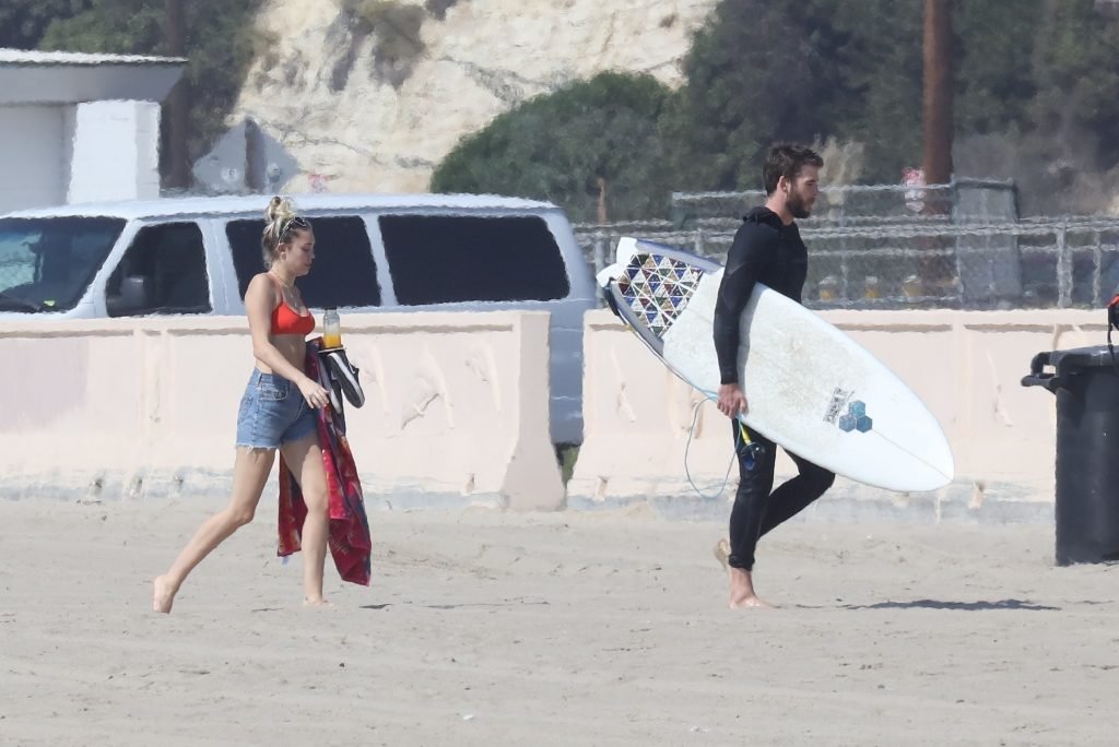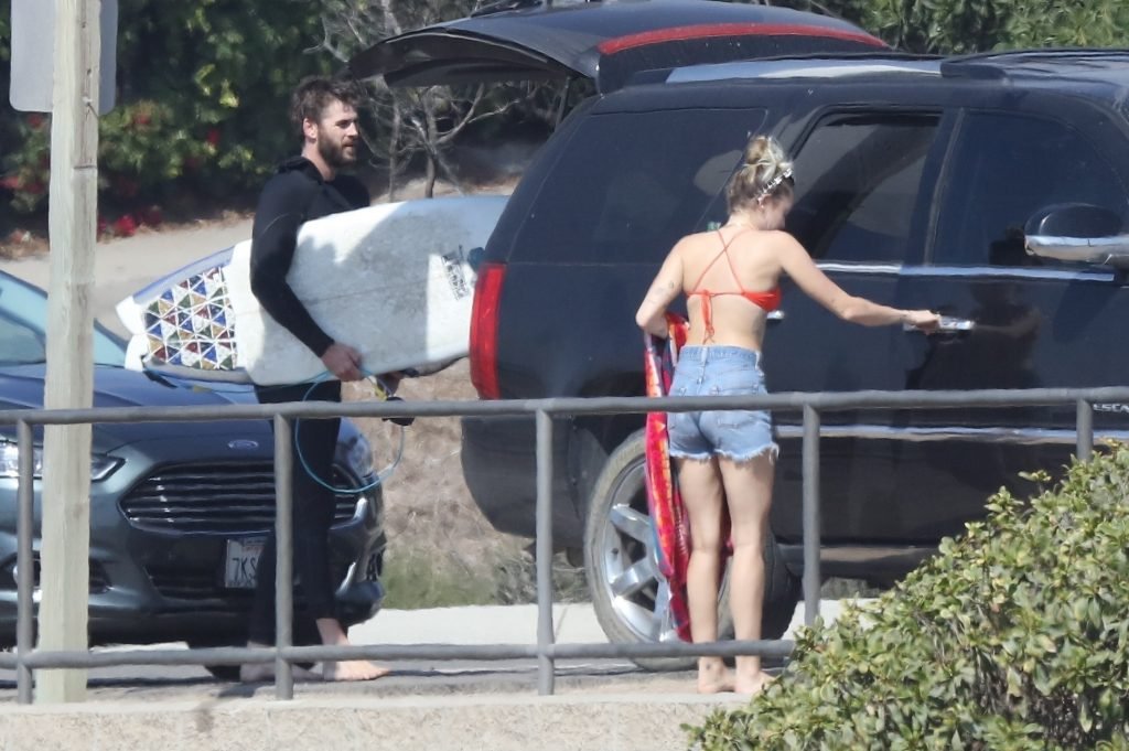 Miley Cyrus, 24, relaxou em um biquíni vermelho atrevido enquanto assistia o namorado Liam Hemsworth pegar ondas em Malibu, 13/10/2017. O casal passou um tempo relaxando na praia antes de sair juntos. Miley colocou shorts jeans sobre seu conjunto vermelho enquanto Liam tirava a roupa de neoprene antes de partir.