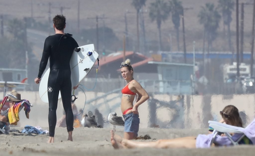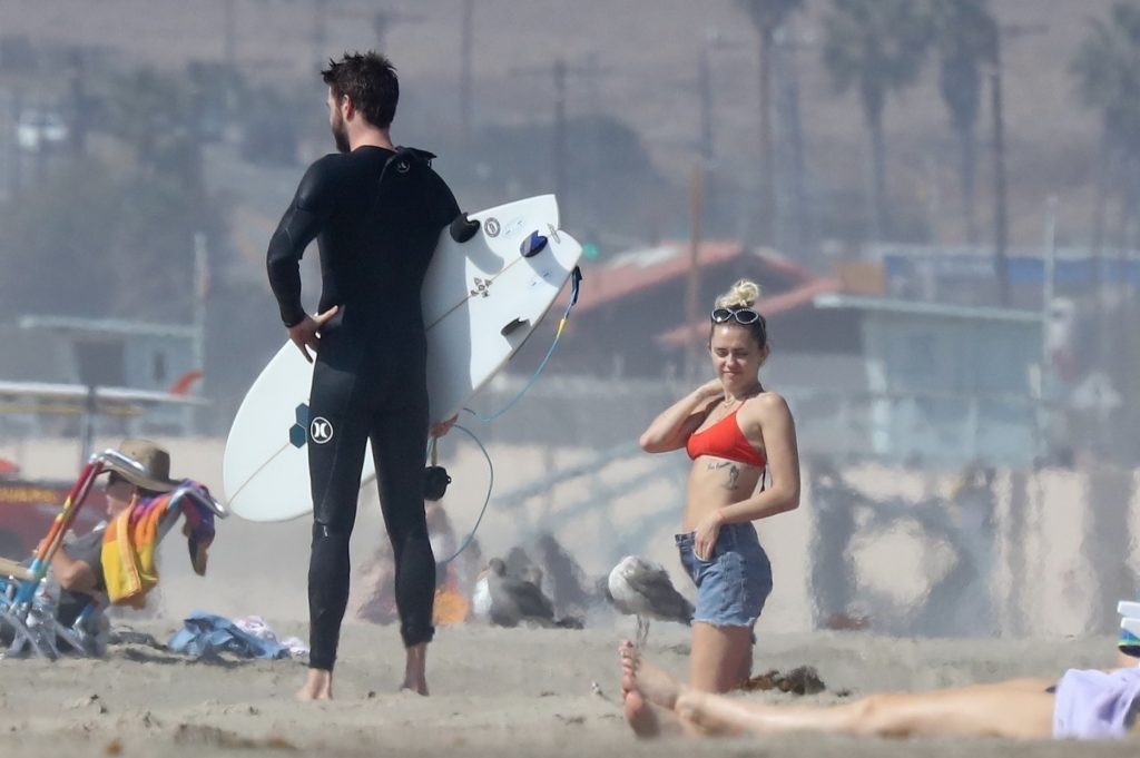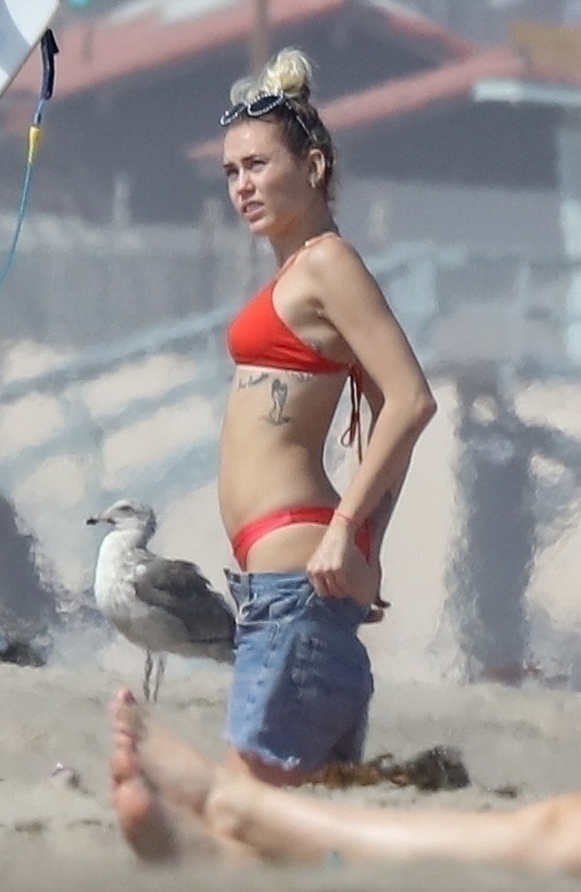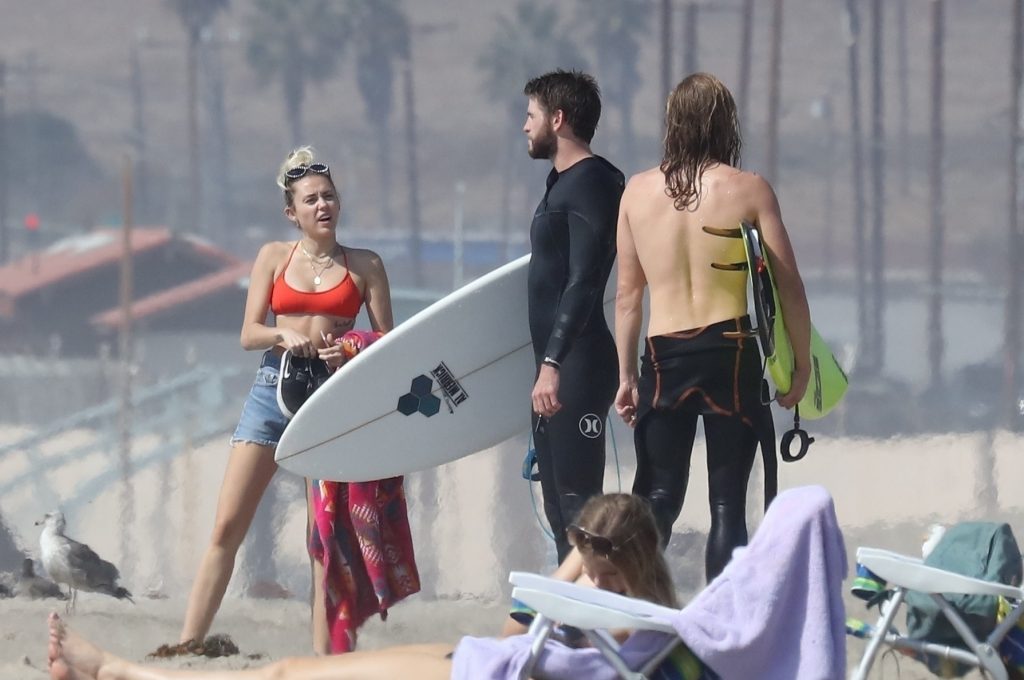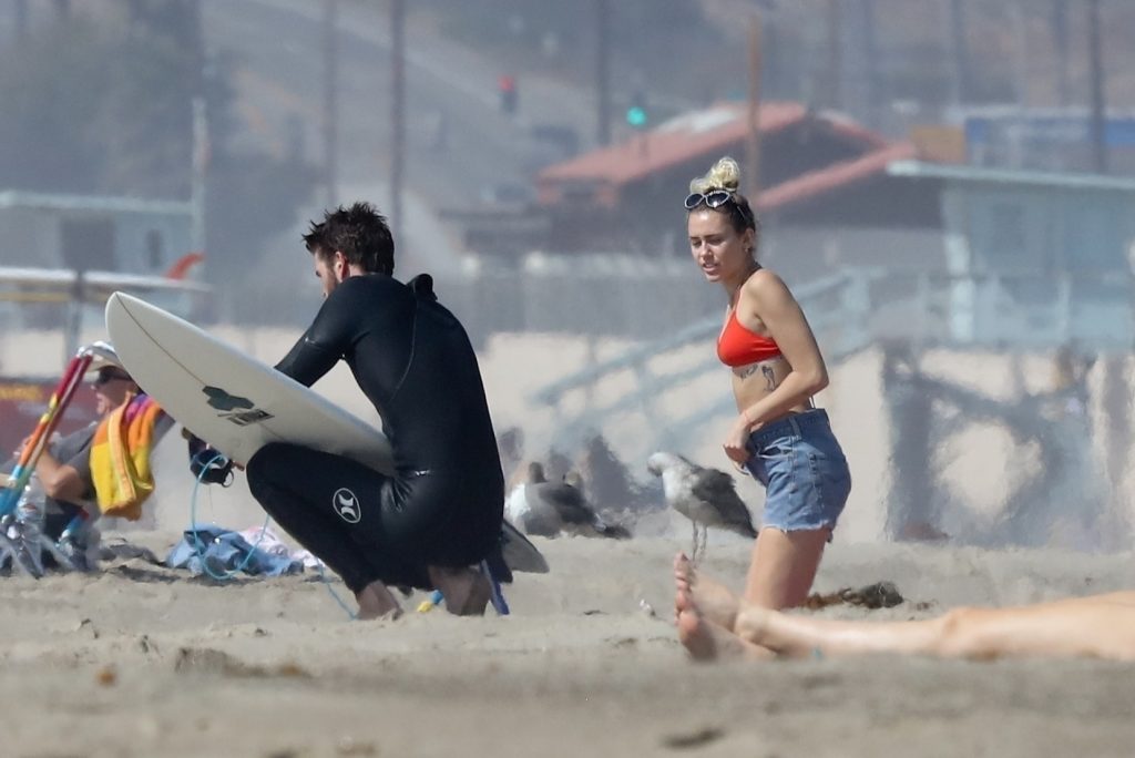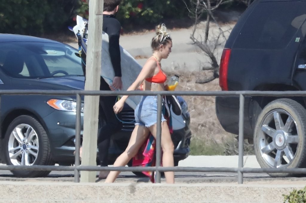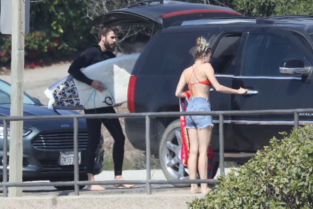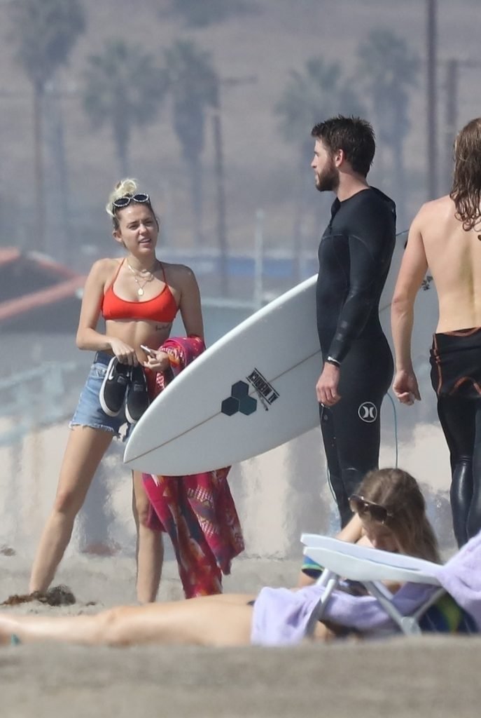Miley Cyrus, 24, relaxou em um biquíni vermelho atrevido enquanto assistia o namorado Liam Hemsworth pegar ondas em Malibu, 13/10/2017. O casal passou um tempo relaxando na praia antes de sair juntos. Miley colocou shorts jeans sobre seu conjunto vermelho enquanto Liam tirava a roupa de neoprene antes de partir.