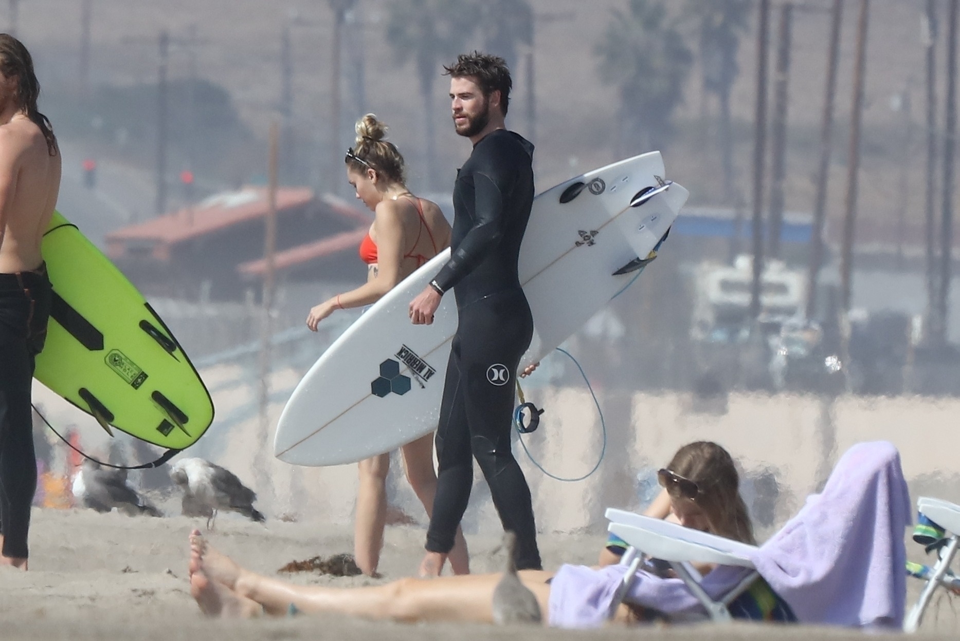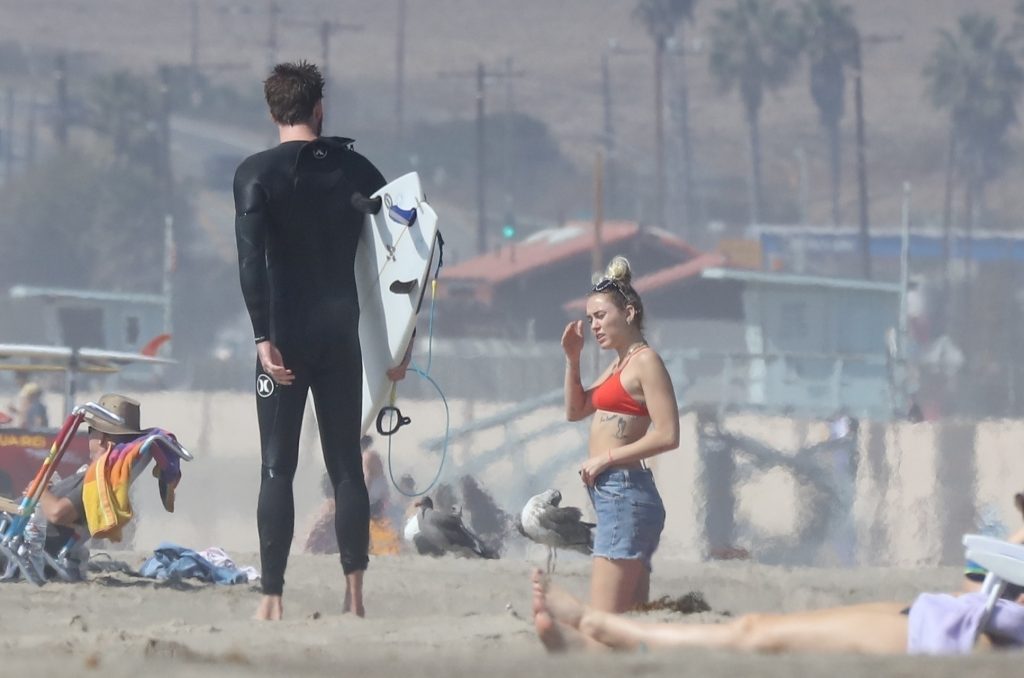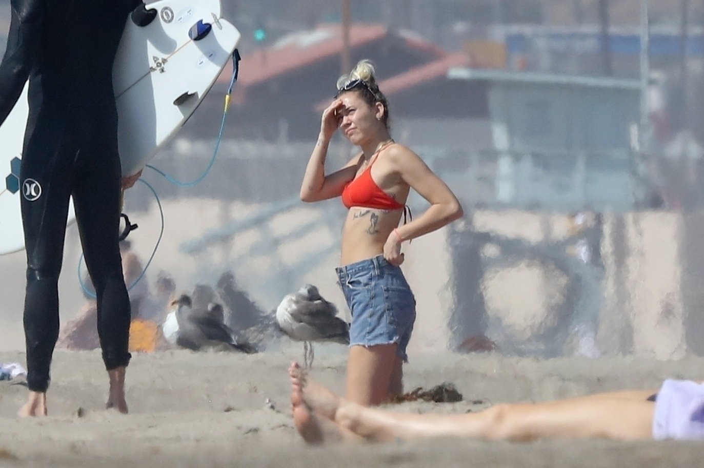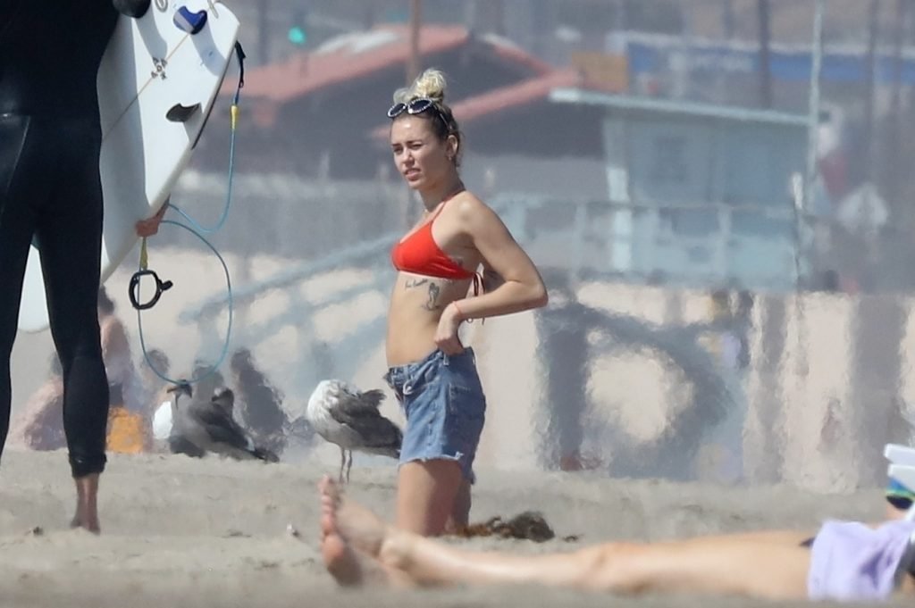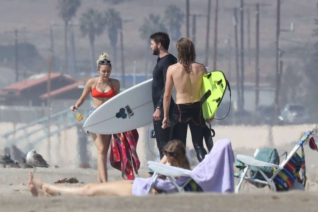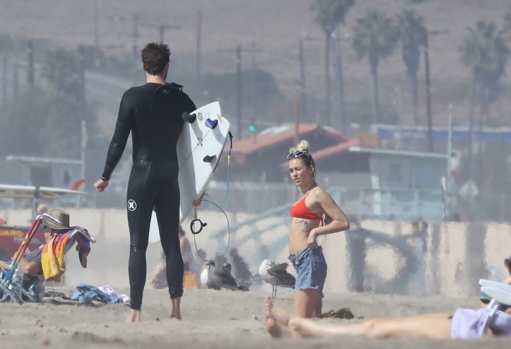 Miley Cyrus, 24, relaxou em um biquíni vermelho atrevido enquanto assistia o namorado Liam Hemsworth pegar ondas em Malibu, 13/10/2017. O casal passou um tempo relaxando na praia antes de sair juntos. Miley colocou shorts jeans sobre seu conjunto vermelho enquanto Liam tirava a roupa de neoprene antes de partir.