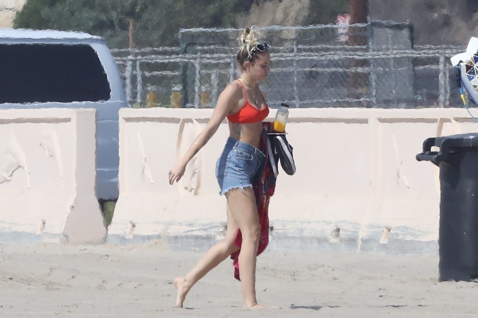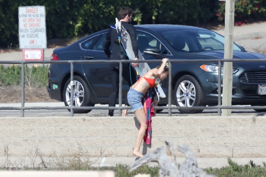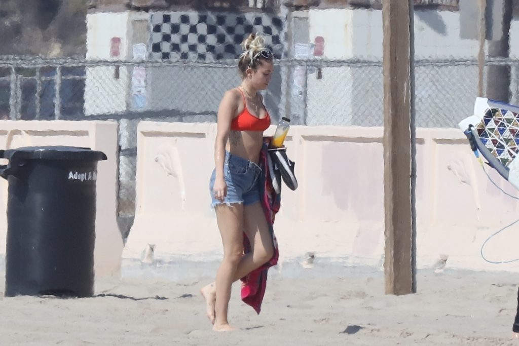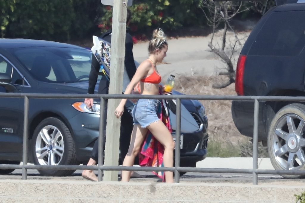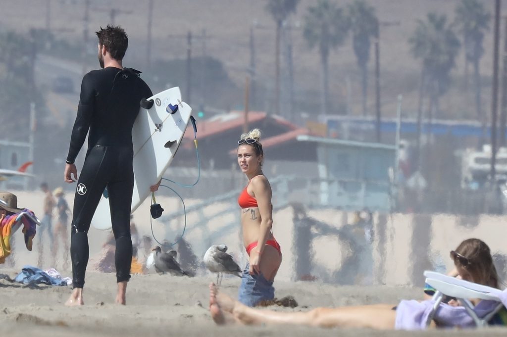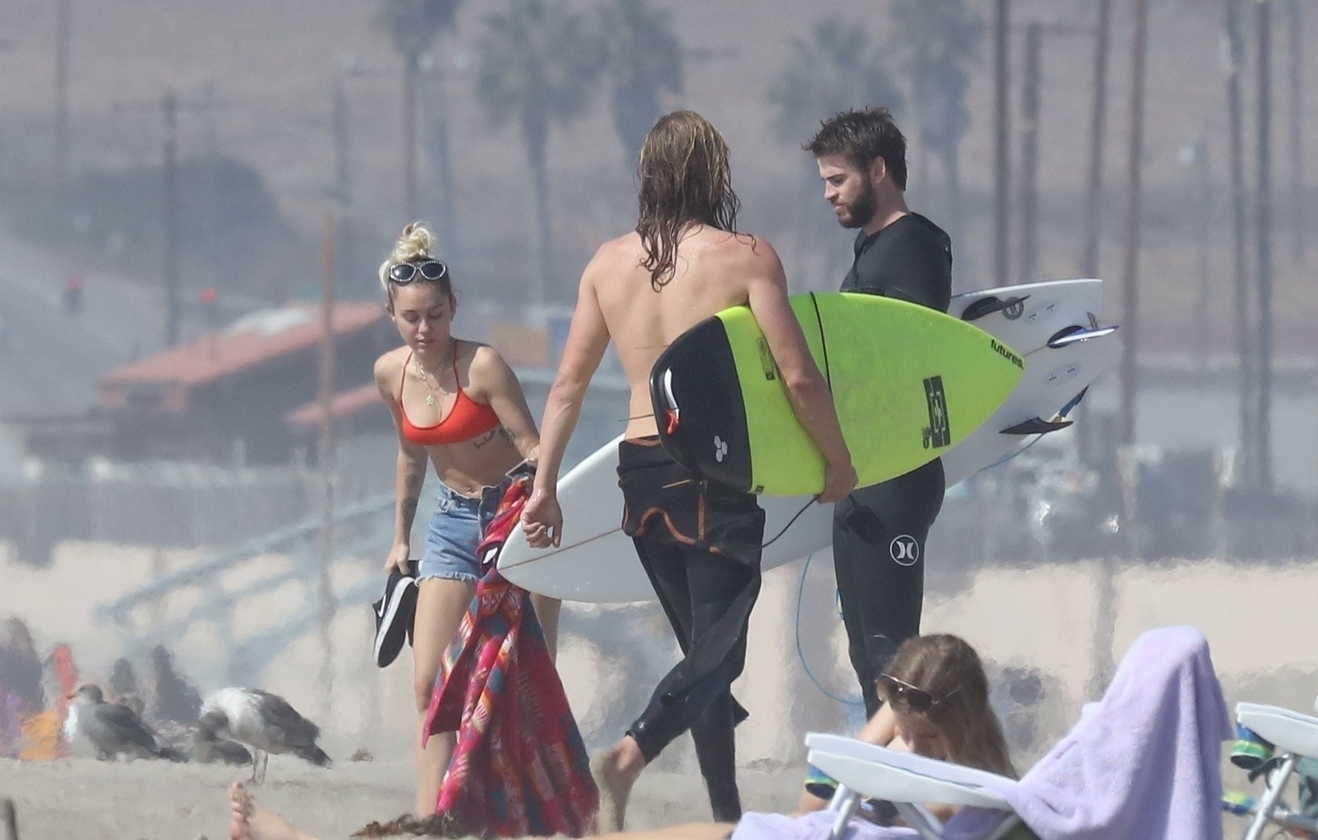 Miley Cyrus, 24, relaxou em um biquíni vermelho atrevido enquanto assistia o namorado Liam Hemsworth pegar ondas em Malibu, 13/10/2017. O casal passou um tempo relaxando na praia antes de sair juntos. Miley colocou shorts jeans sobre seu conjunto vermelho enquanto Liam tirava a roupa de neoprene antes de partir.