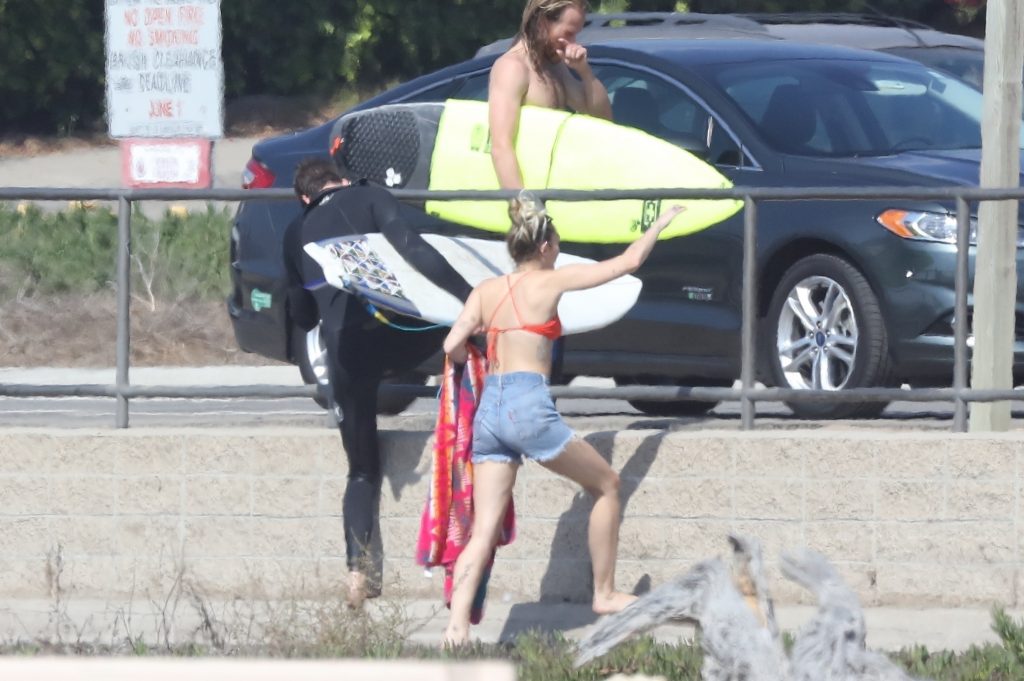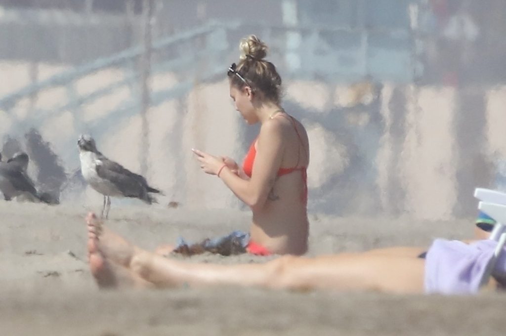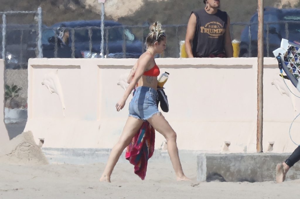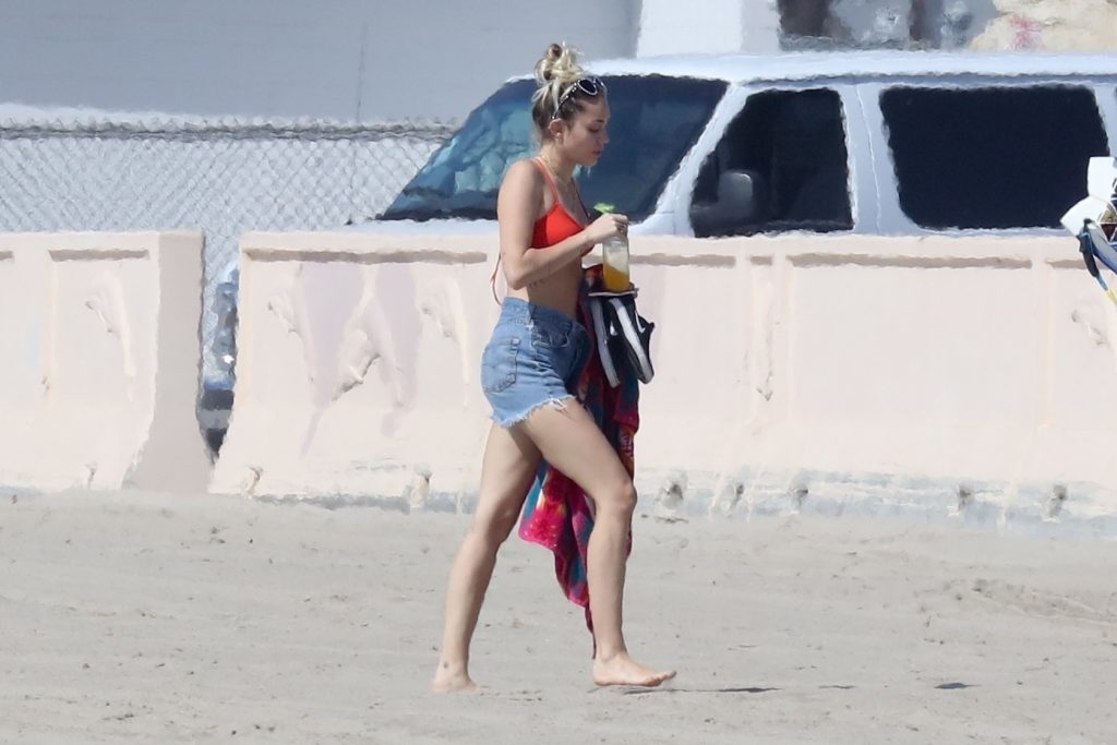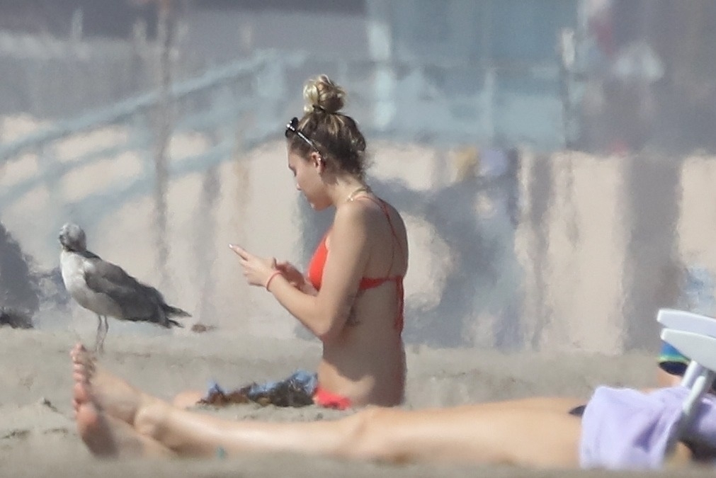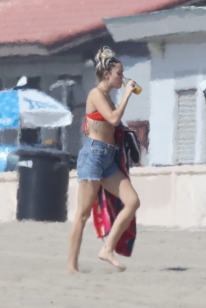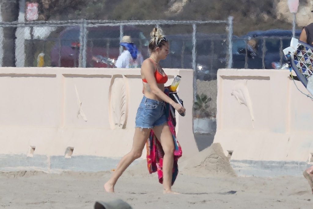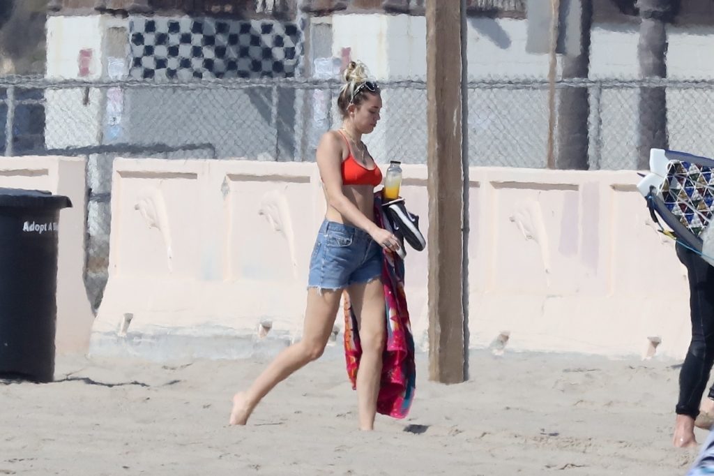 Miley Cyrus, 24, relaxou em um biquíni vermelho atrevido enquanto assistia o namorado Liam Hemsworth pegar ondas em Malibu, 13/10/2017. O casal passou um tempo relaxando na praia antes de sair juntos. Miley colocou shorts jeans sobre seu conjunto vermelho enquanto Liam tirava a roupa de neoprene antes de partir.