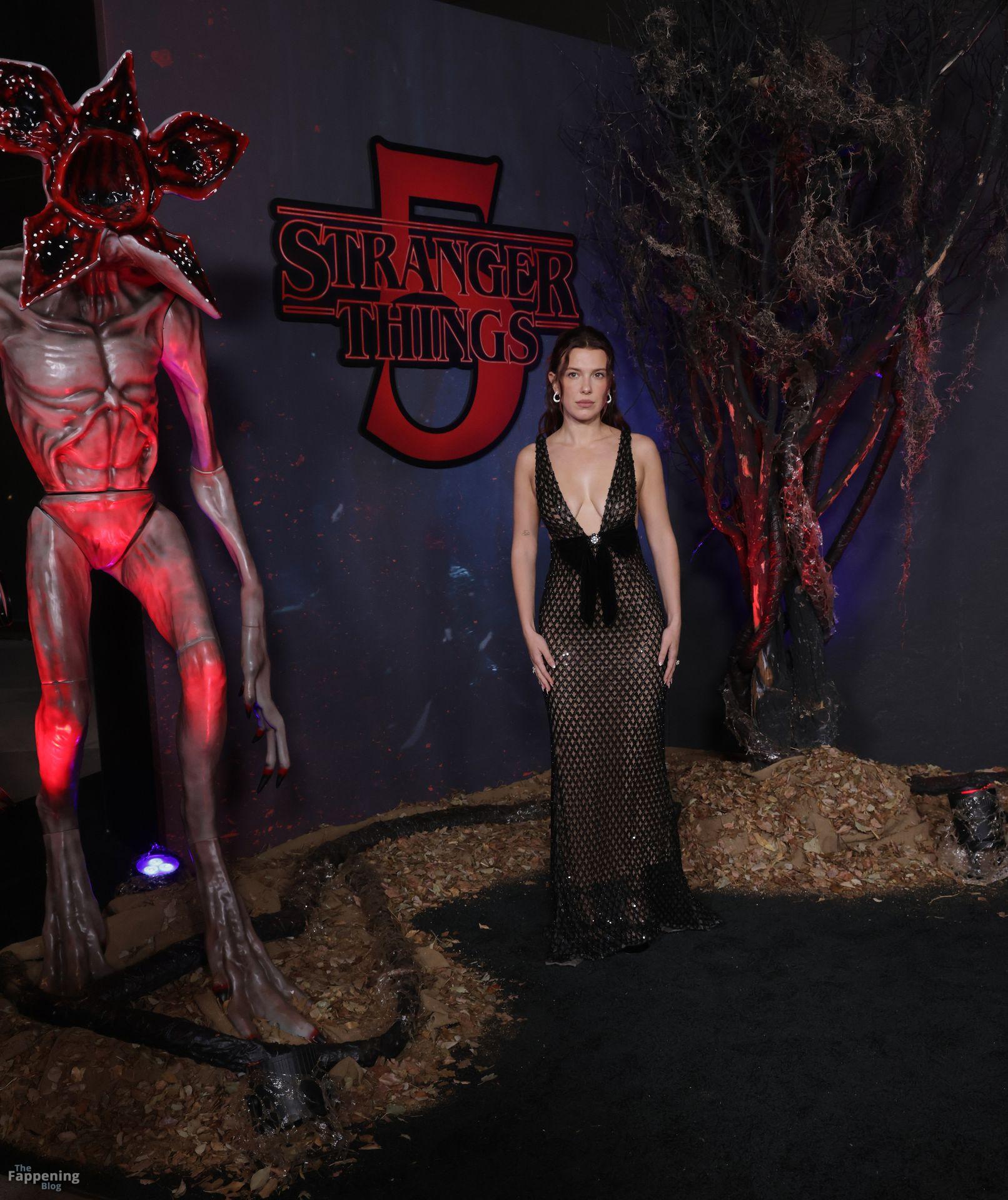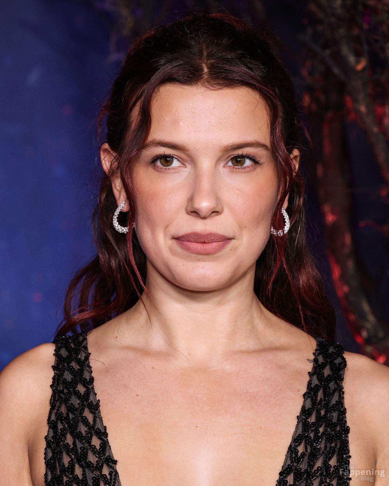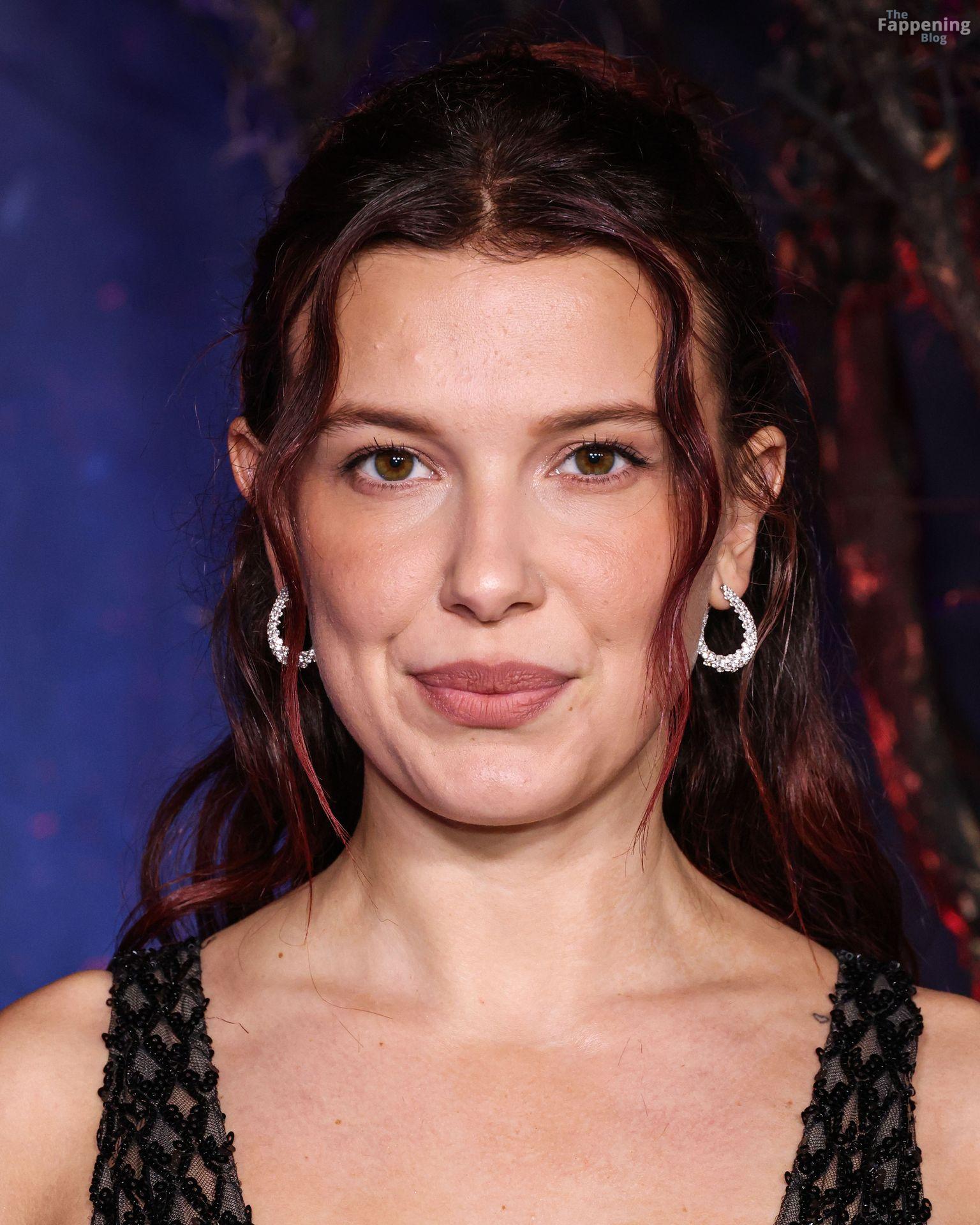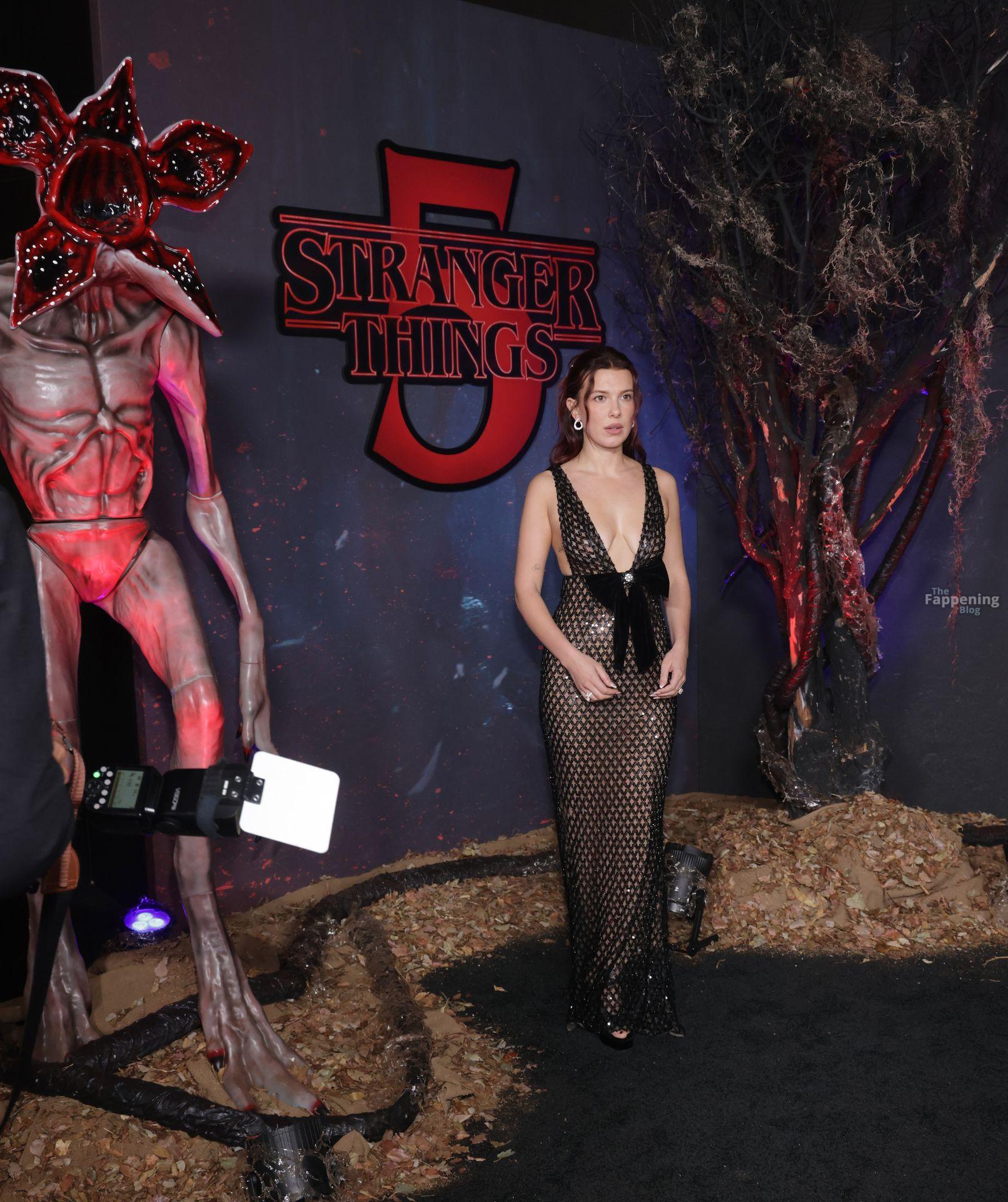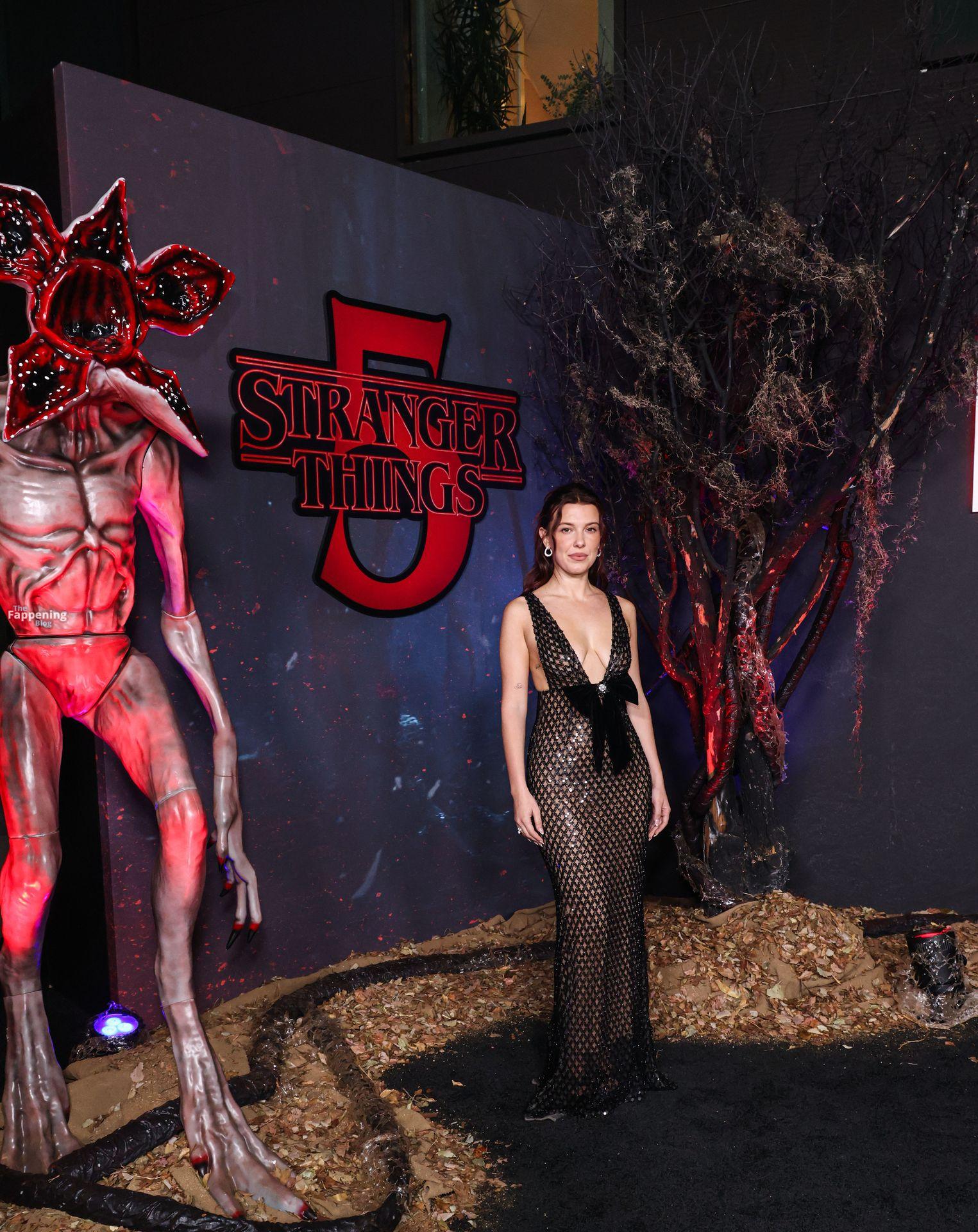 Millie Bobby Brown apareceu no Evento FYC da 5ª Temporada de Stranger Things em Hollywood, usando um vestido preto transparente de paetês com um decote profundo que deixava seus seios à mostra.