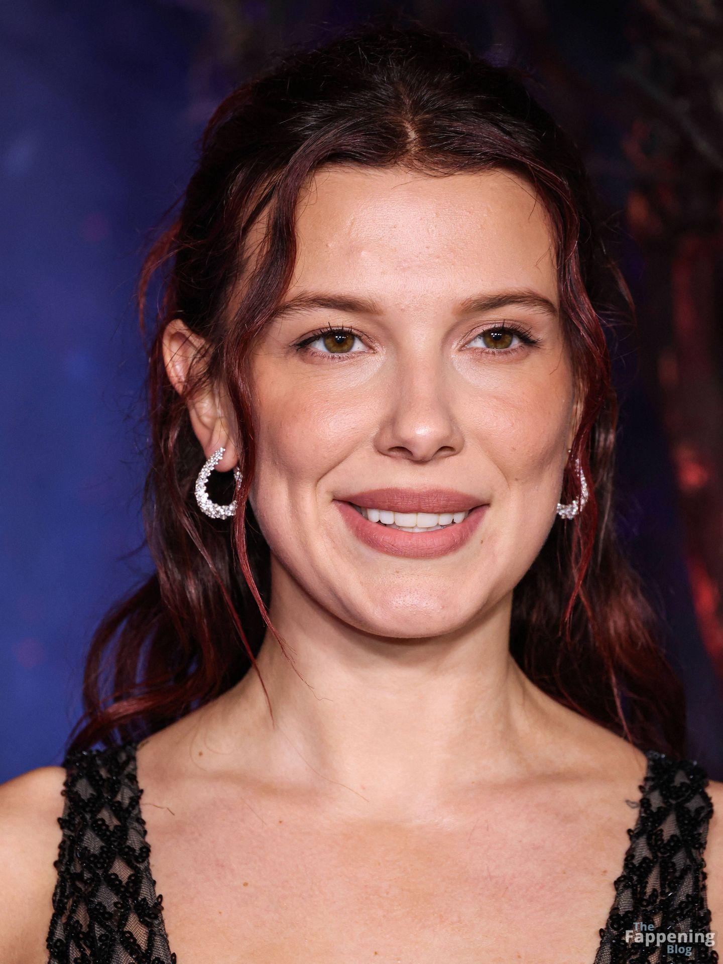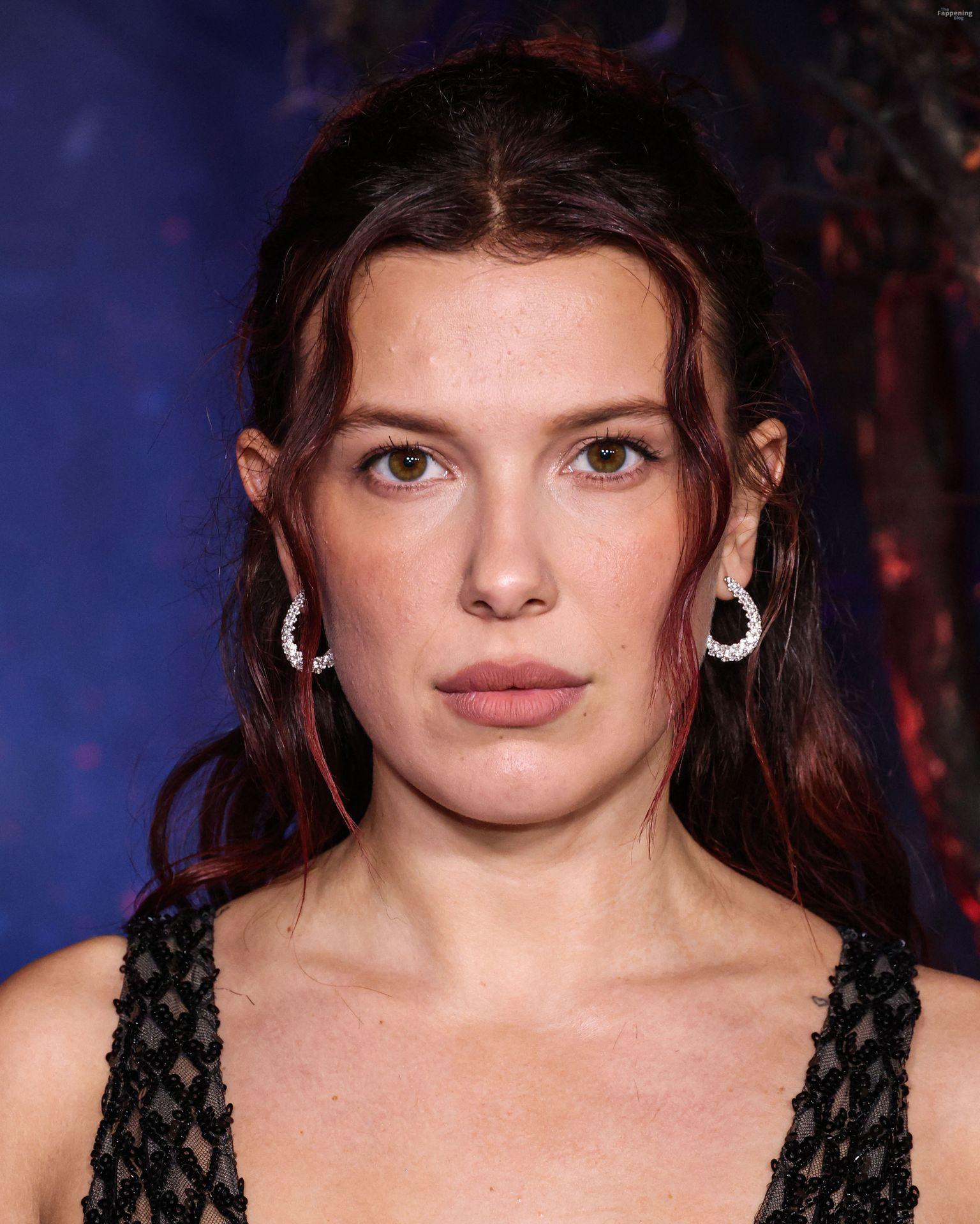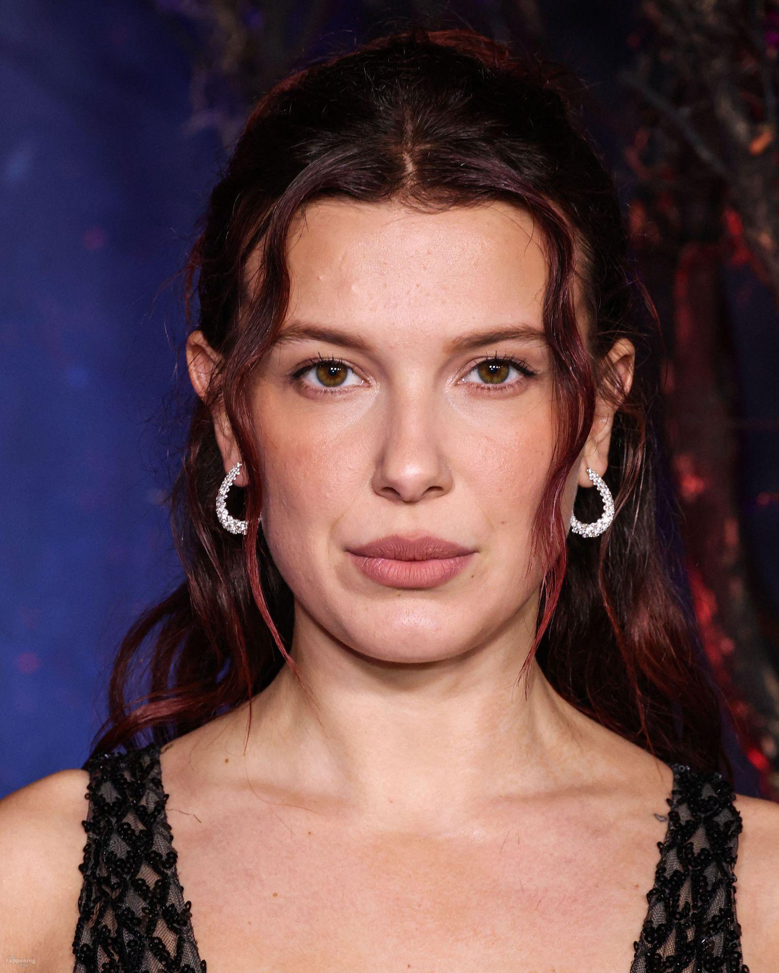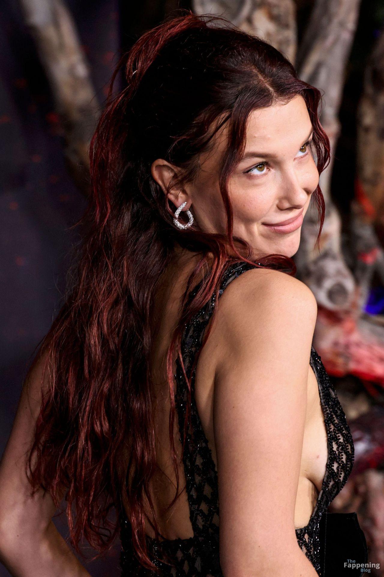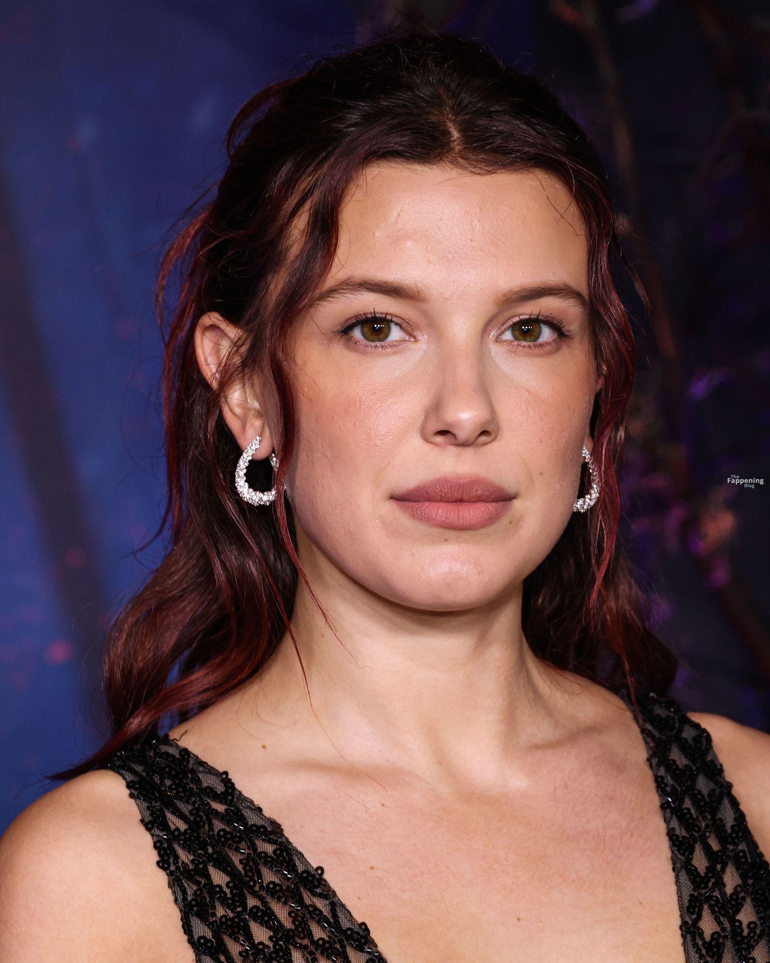 Millie Bobby Brown apareceu no Evento FYC da 5ª Temporada de Stranger Things em Hollywood, usando um vestido preto transparente de paetês com um decote profundo que deixava seus seios à mostra.